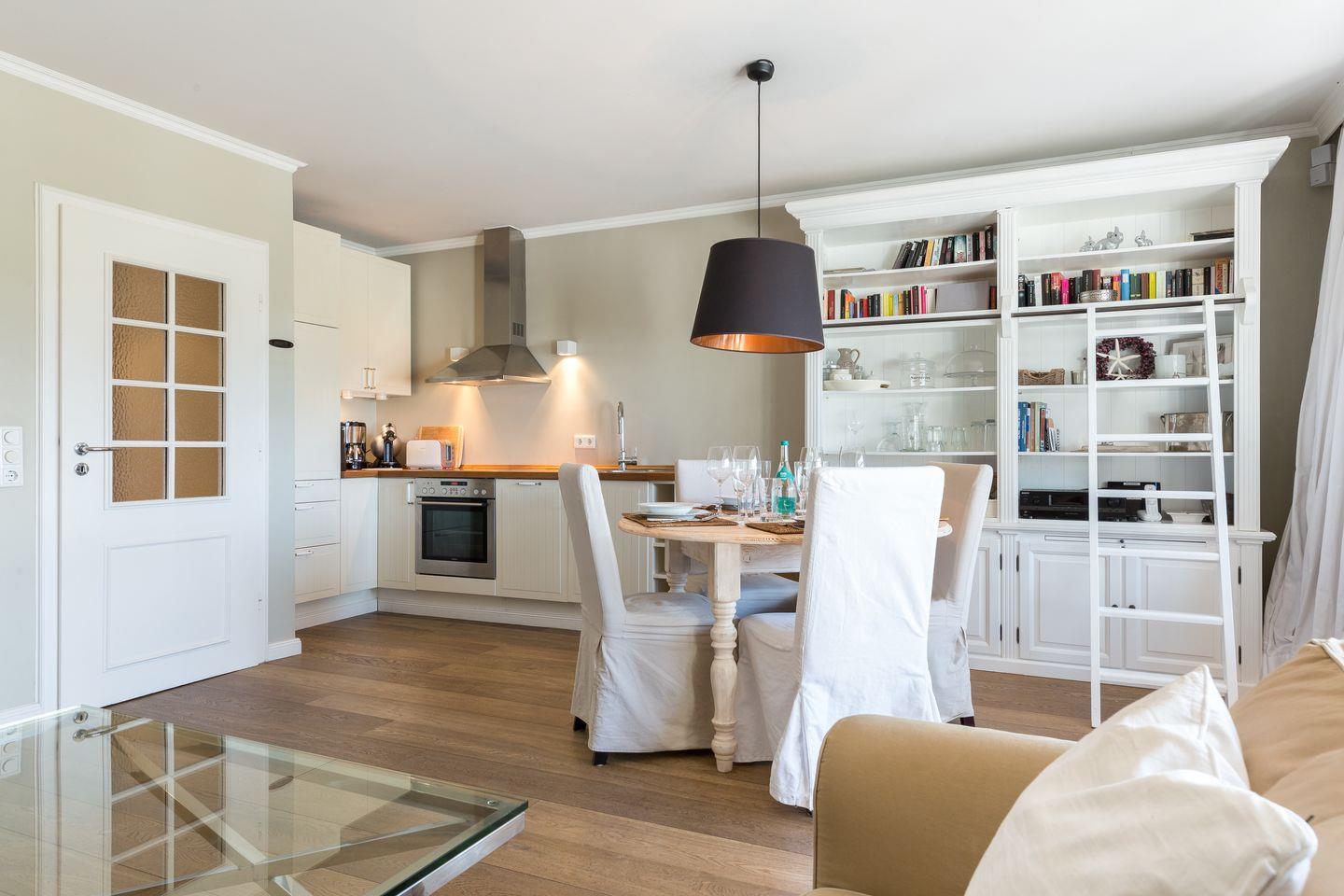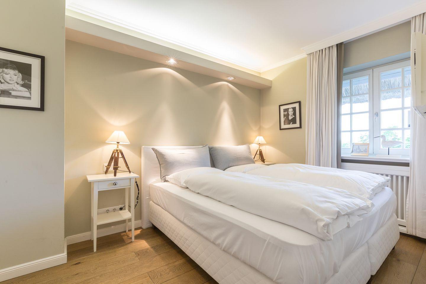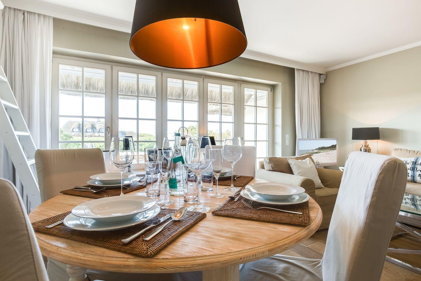 Erdgeschoss: Entree mit Spiegel und kleiner Geraderobe. Hochwertig und sehr geschmackvoll eingerichteter Wohnraum mit herrlichem Blick in die Dünen- und Heidelandschaft, kleinem Wintermeerblick sowie Flat-TV, DVD, Yamaha-Bose-Hifianlage und Telefon. Schöne Sitzecke. Integrierte Landhausküche mit Geschirrspüler und Backofen. Sehr schöne, große (40m²), heckenrosengesäumte und zum Meer gelegene Westterrasse mit phantastischem Südblick über die Dünen, Teakmöbeln und Standkorb (ca. von April–Oktober). Ein romantischer, nach Osten ausgerichteter Raum mit Luxusdoppelbett (fennobed continental), großzügigem Tischlereinbauschank sowie Flat-DVD-TV und Bose Sounddock.