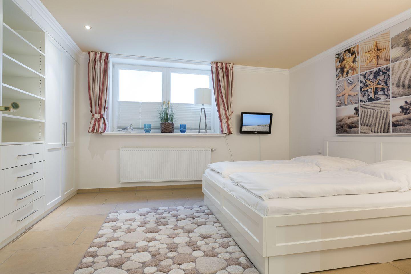 UG: Ein großzügig geschnittener Raum mit Doppelbett (ca. 1,8x2m) und viel Schrankplatz, Flatscreen-TV, CD-Player + Radio. Schönes Bad mit Badewanne/WC. Waschmaschine im separaten Hauswirtschaftsraum.