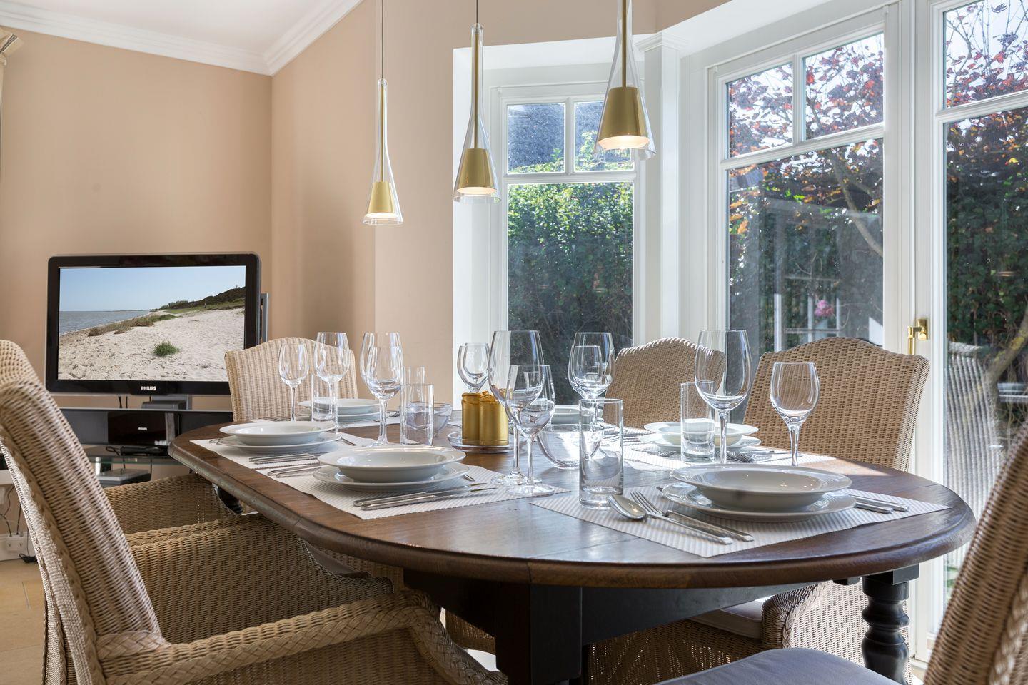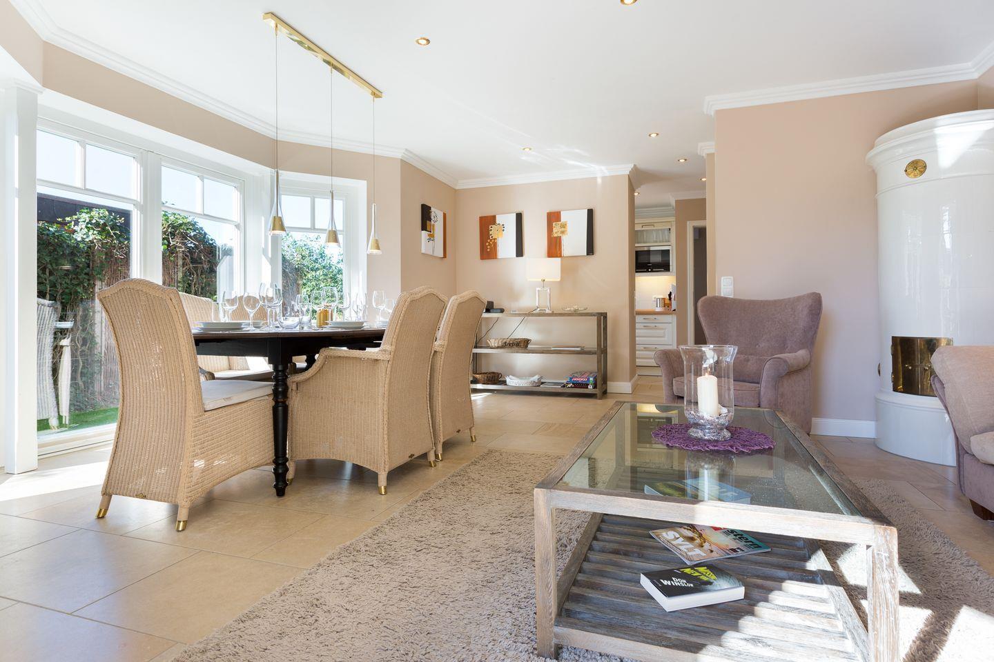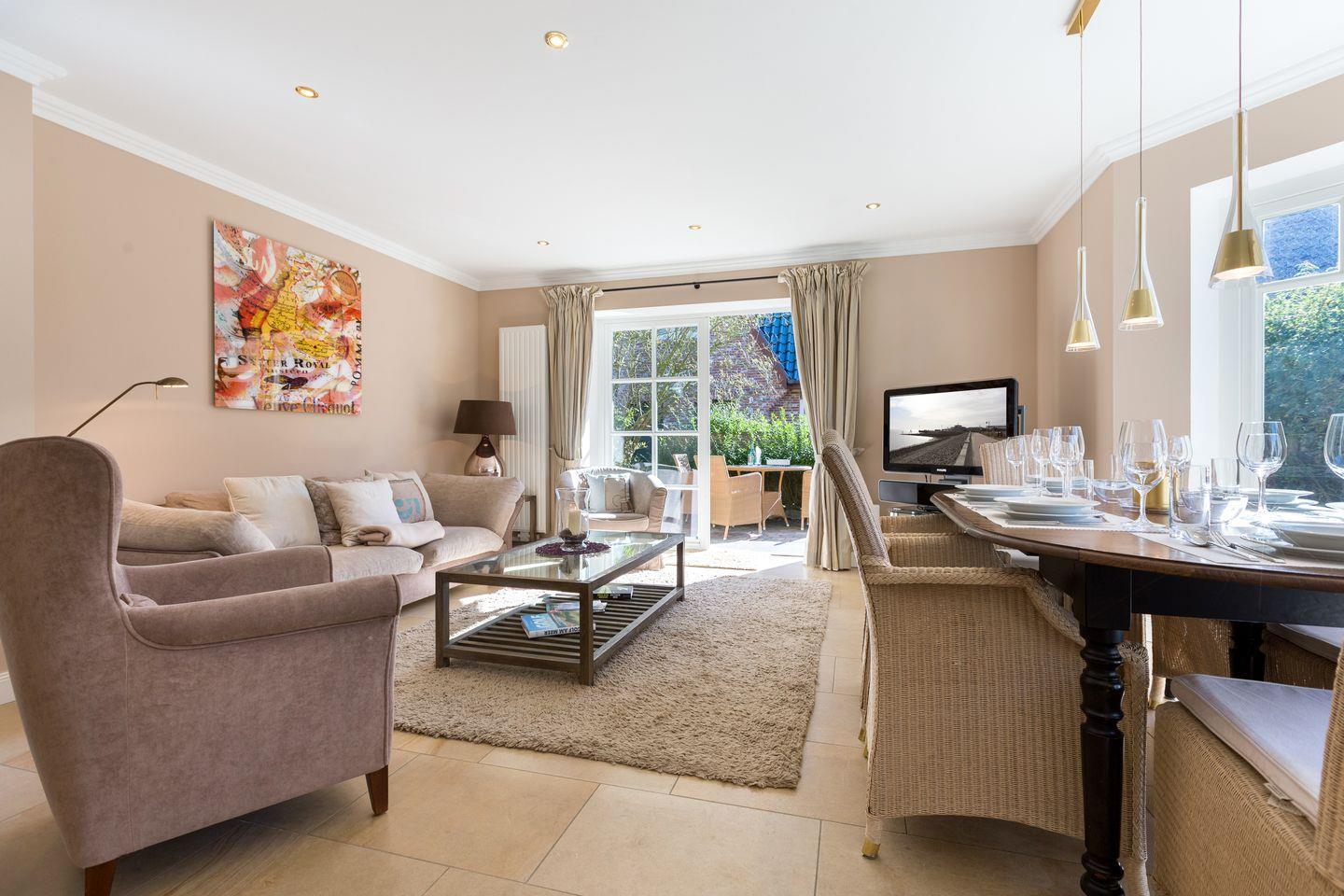 EG: Hochwertig und sehr geschmackvoll möblierter Wohnraum mit Flatscreen-TV, DVD-Player, Bose Colour Station mit Bluetooth, Telefon, kleine Südterrasse. Küche mit Geschirrspüler, Backofen, Mikrowelle. Gäste-WC.