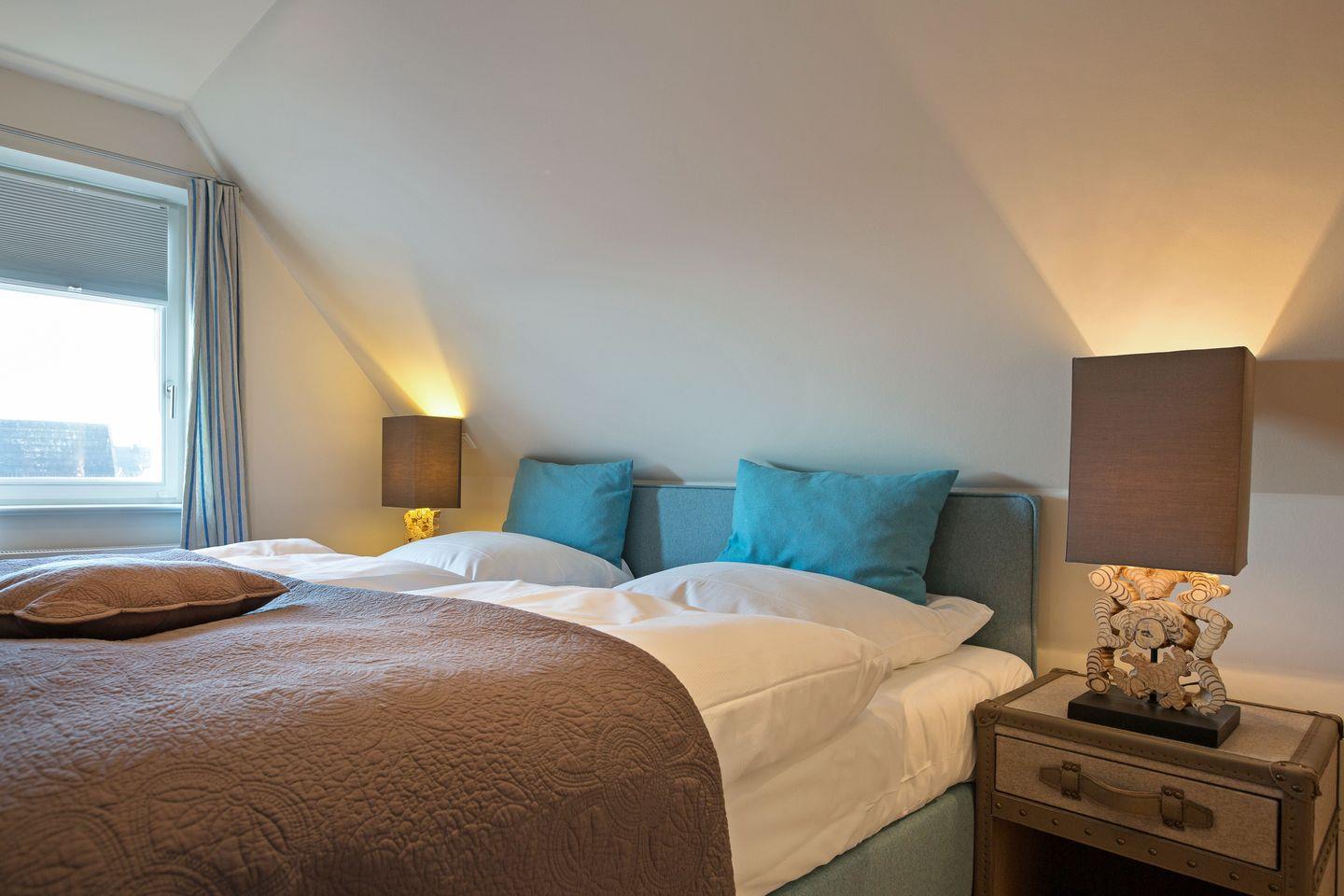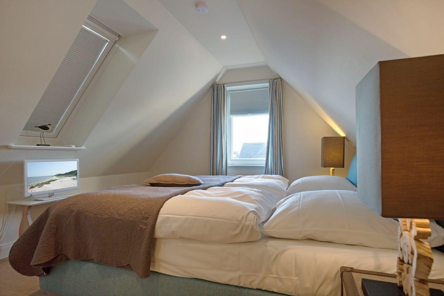 Im Dachgeschoss finden Sie ein gemütliches Schlafzimmer mit Boxspringbett und Flatscreen-TV. Hier werden Ihre Urlaubsträume wahr und Sie werden sich sicher wohlfühlen.
