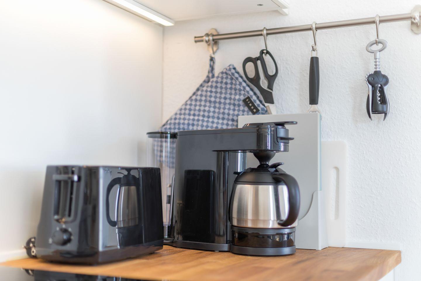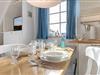 Obergeschoss: Wohnraum mit Smart-TV, Radio und W-LAN, integrierte Küchenzeile mit Geschirrspüler, Backofen und Induktionsherd, ein Schlafraum mit Einzelbett (100x200cm) und einem praktischen Ausziehbett, Duschbad, Balkon mit Gartenmöbeln von April bis Oktober