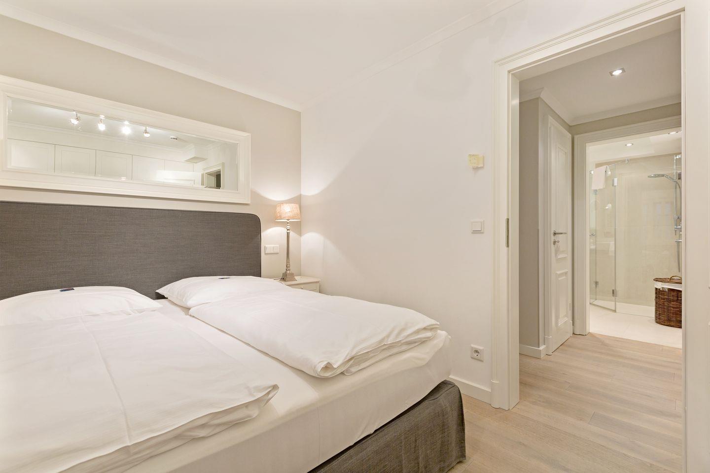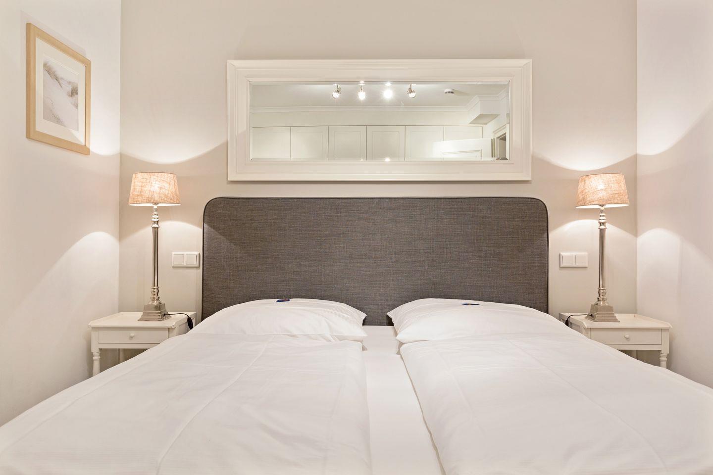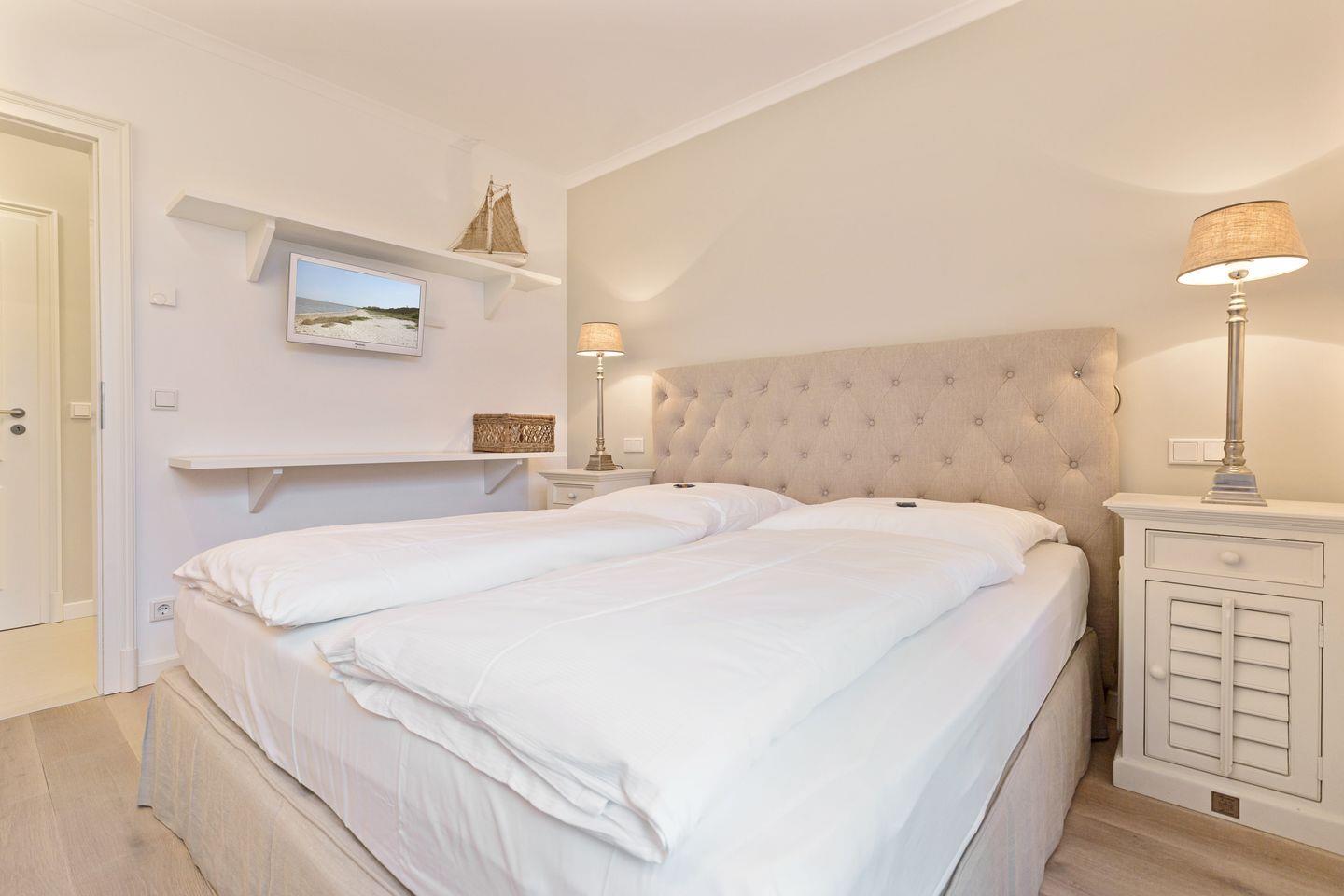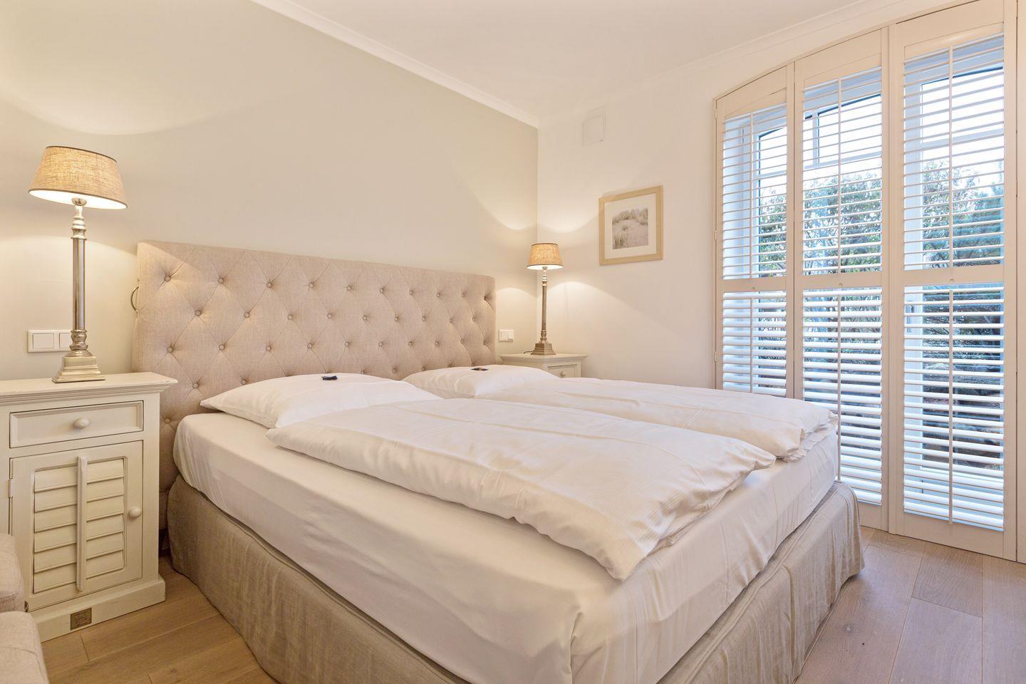 Im Erdgeschoss finden Sie ebenfalls ein sehr schön gestaltetes Schlafzimmer, das nicht nur durch die edlen, weißen Holz-Fenster-Shutter ein wenig Havanna-Feeling verströmt. Auch das Boxspring-Bett (ca. 160x200cm-durchgehend) wurde mit Bedacht und Sorgfalt für Ihren Schlafkomfort ausgewählt. Ein Smart-TV inkl. Netflix, Amazon Prime etc. darf auch hier nicht fehlen. Gleich benachbart starten Sie in Ihrem luxuriösen Bad mit großer Dusche und WC beschwingt und mit Stil in den Tag.[nbsp][nbsp]