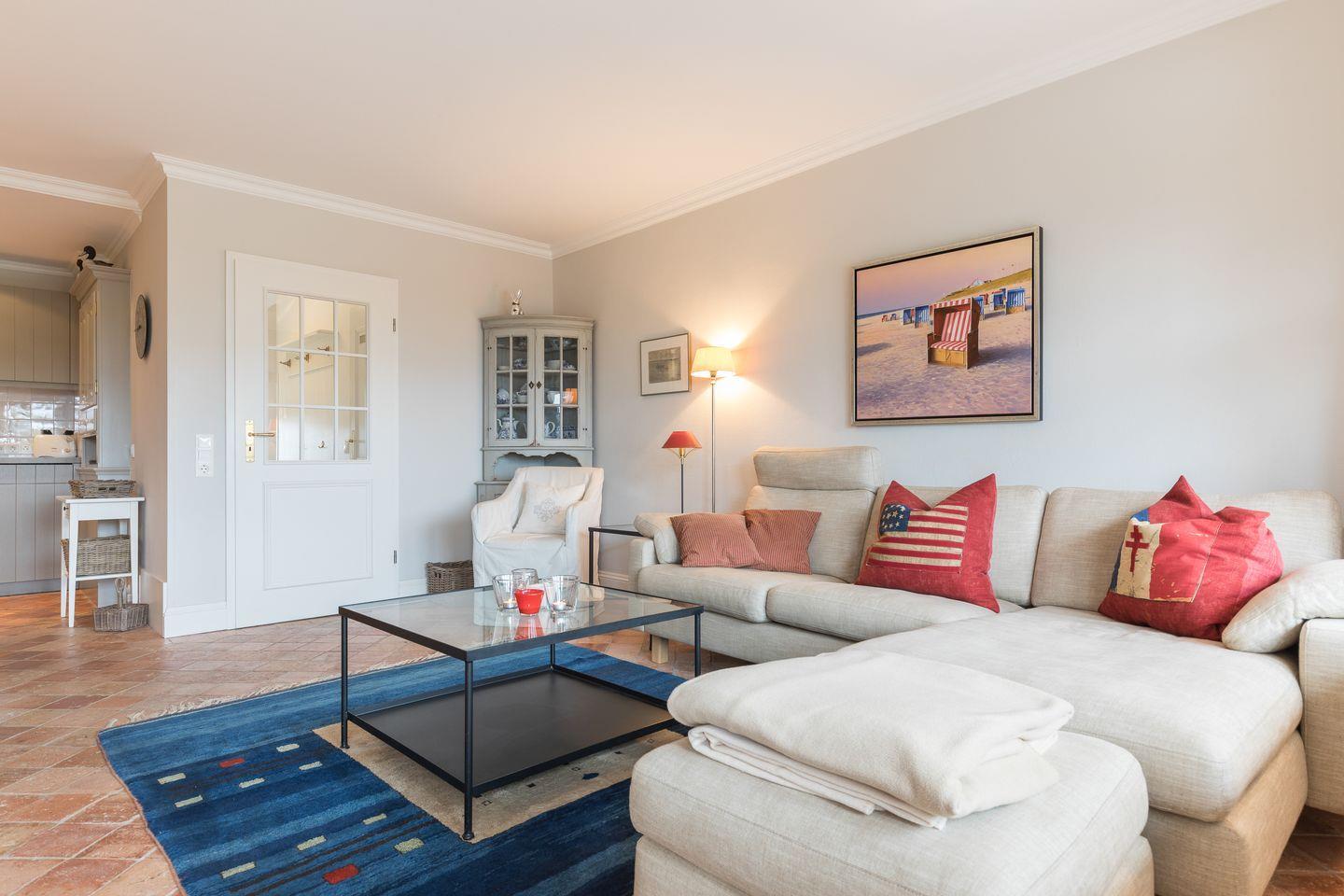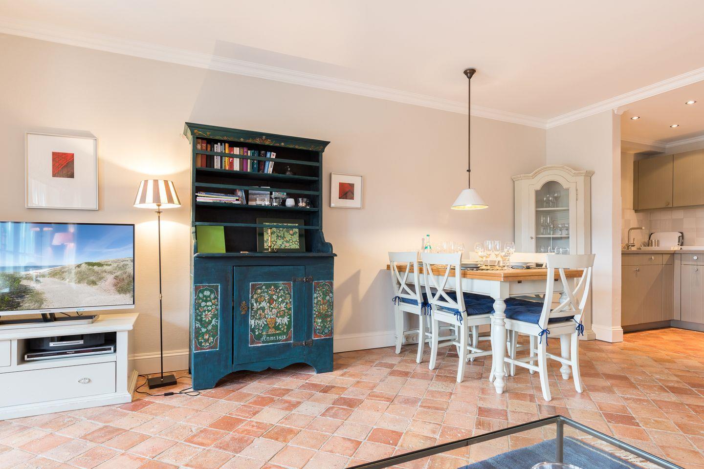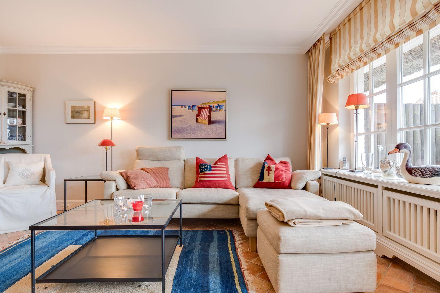 Erdgeschoss: Großzügiger, lichtdurchfluteter Wohnraum mit hochwertiger Möblierung, TV, DVD-Player und Radio. Durch einen schönen Essbereich Integrierte neu gestaltete Küche mit modernen Geräten, wie Ceranfeld und Microwellen-/Backofenkombination , Geschirrspüler und Wasch-Trockner.. Wunderschöne Süd-Terrasse mit Teak-Gartenmöbeln und Strandkorb (ca. von April–Oktober). Modernes Gäste-WC mit Dusche.