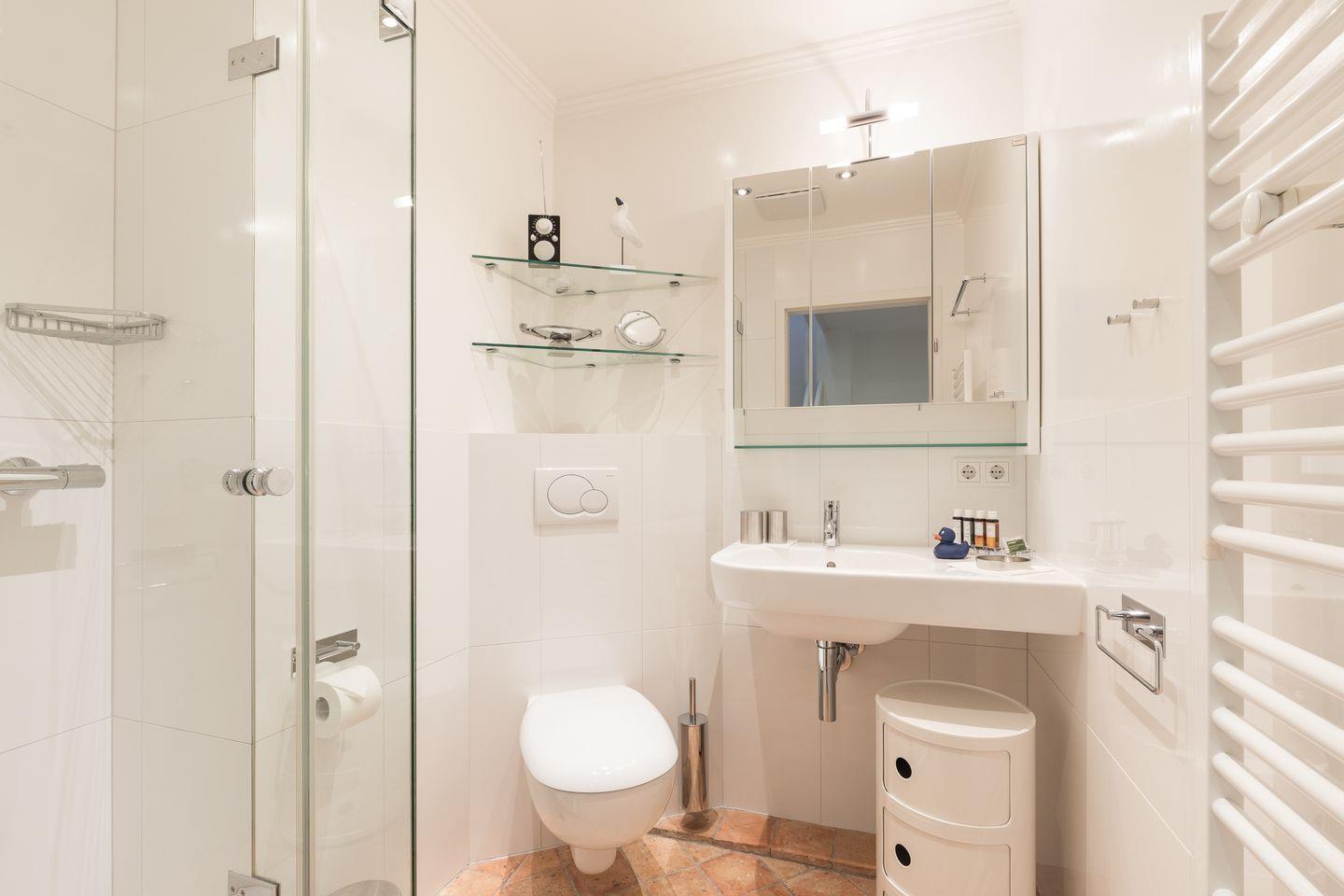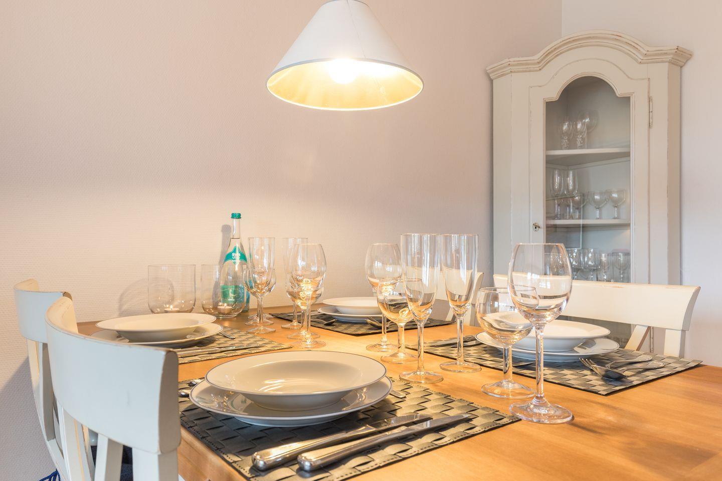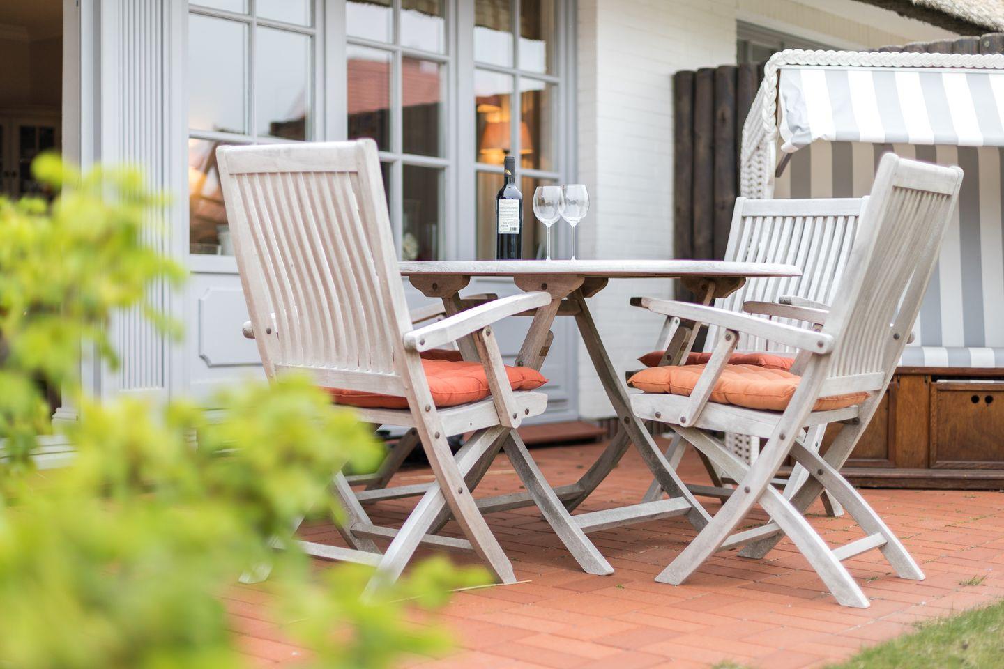 Erdgeschoss: Großzügiger, lichtdurchfluteter Wohnraum mit hochwertiger Möblierung, TV, DVD-Player und Radio. Durch einen schönen Essbereich Integrierte neu gestaltete Küche mit modernen Geräten, wie Ceranfeld und Microwellen-/Backofenkombination , Geschirrspüler und Wasch-Trockner.. Wunderschöne Süd-Terrasse mit Teak-Gartenmöbeln und Strandkorb (ca. von April–Oktober). Modernes Gäste-WC mit Dusche.