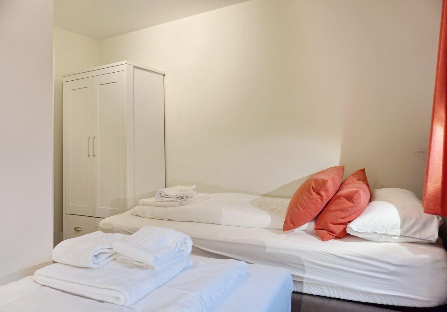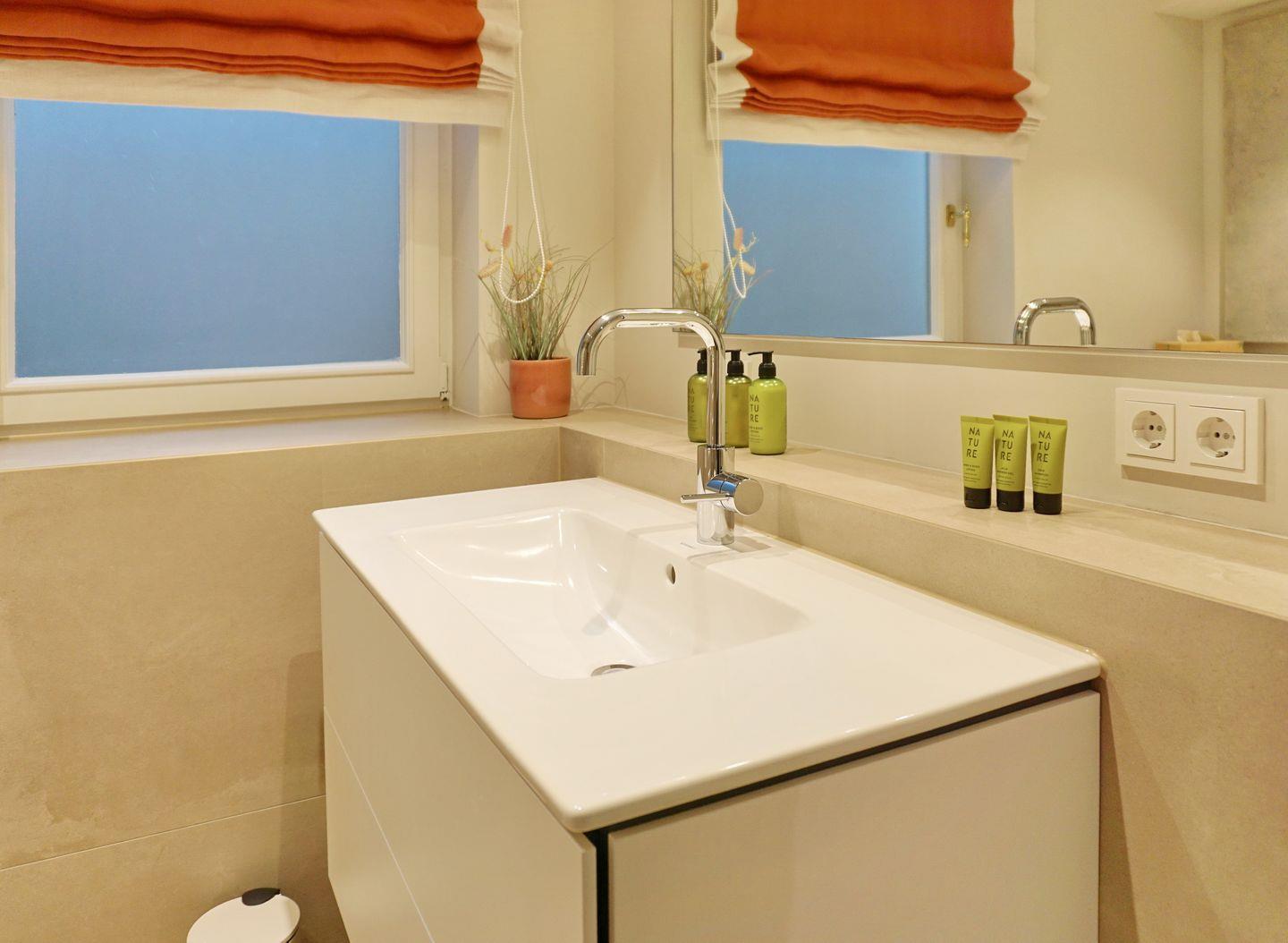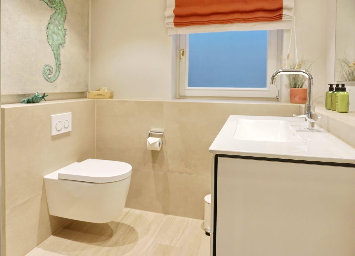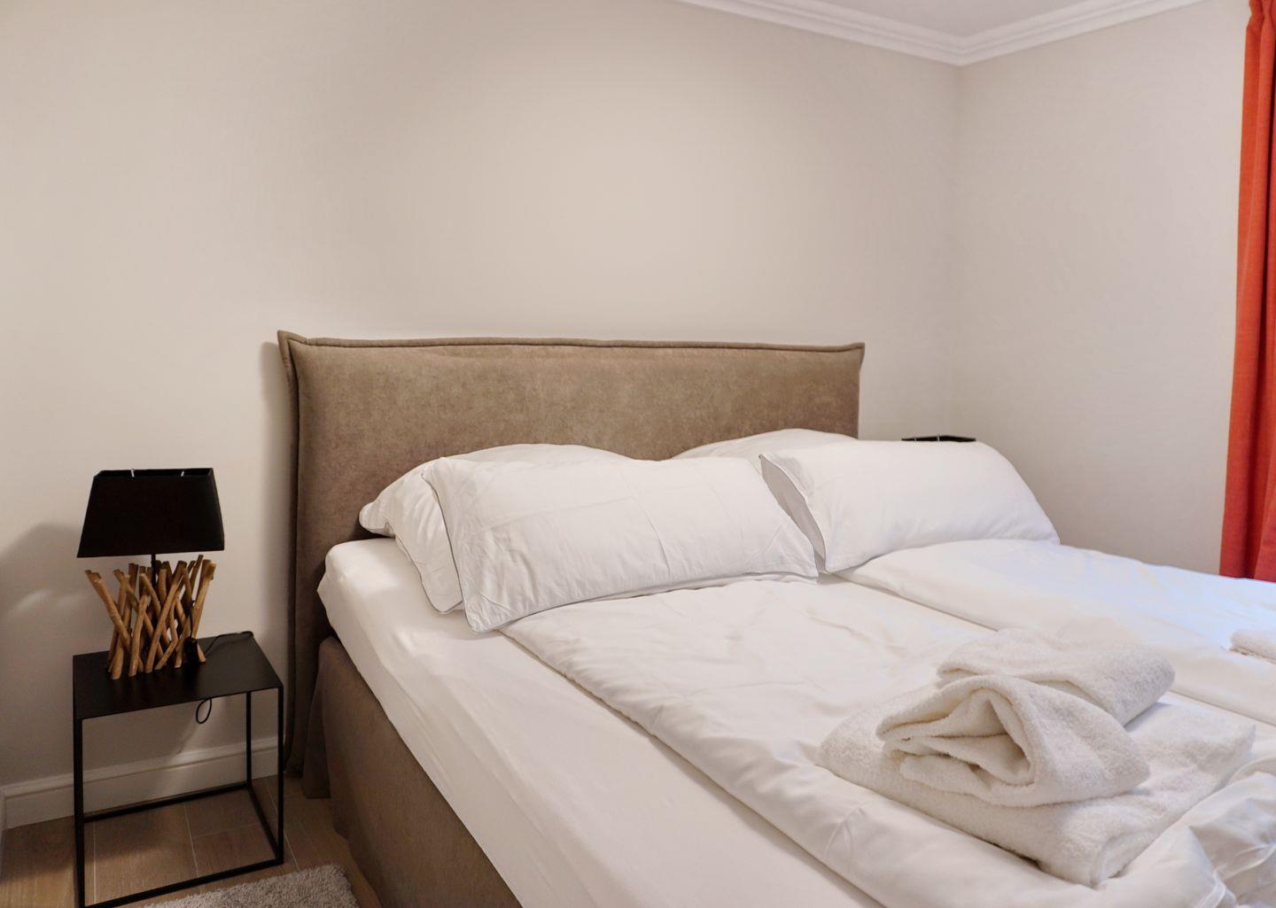 UG: 1 Raum mit Doppelbett (180x200cm) sowie 1 kleiner Schlafraum mit getrennten Betten (90x200cm). Dusche/WC. Sauna mit Dusche/WC. Waschmaschine und Trockner. Sehr attraktive und großzügige Süd-Terrasse mit Strandkorb (ca. von April–Oktober) und Gartenmöbeln. Parkplatz.