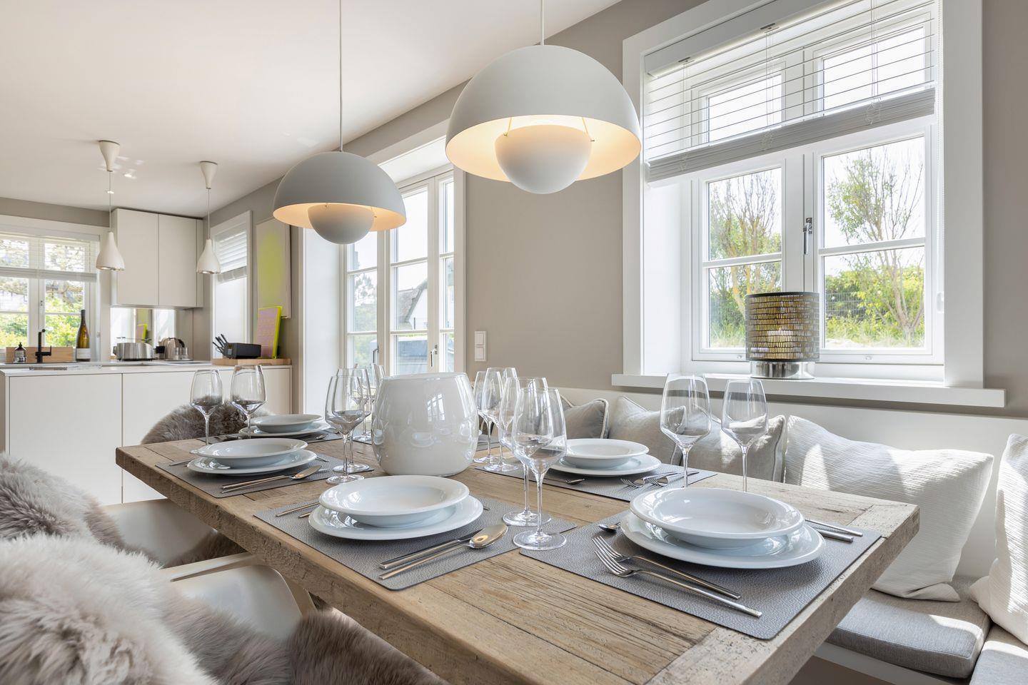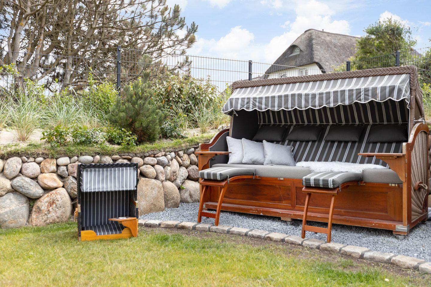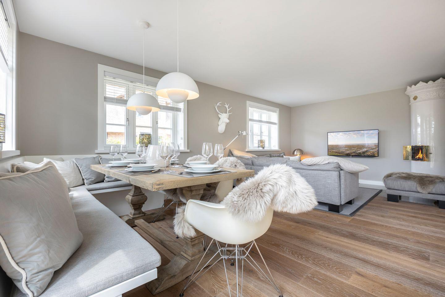 EG: Wohnraum mit TV, Kachelofen, W-Lan, Essbereich, offene Küche mit Backofen, Induktionsherd, Geschirrspülmaschine, Gäste-WC, großer abgeschlossener Garten mit Terrasse, Gartenmöbel und Strandkorb (ca. April-Oktober).