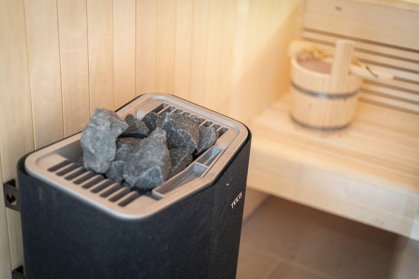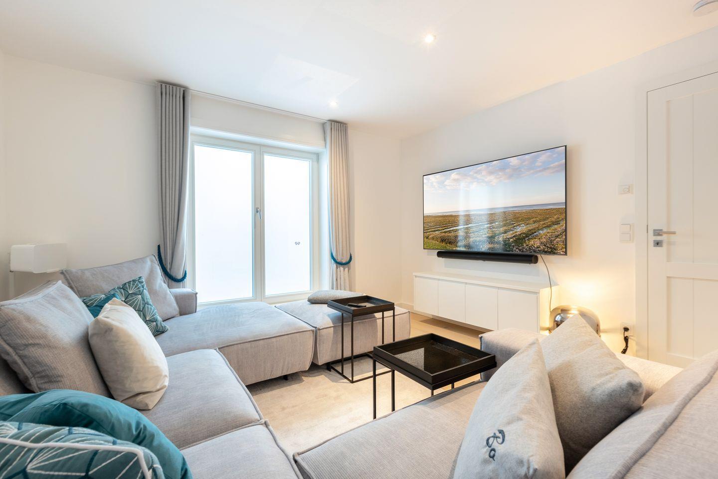 UG: ein Schlafzimmer mit Doppelbett (180x200cm), Schreibtisch und TV, ein Badzimmer mit Dusche und WC, eine Sauna mit Ruheliege, Dusche und Badewanne und ein Heimkino mit Sonos Dolby Surround Anlage.