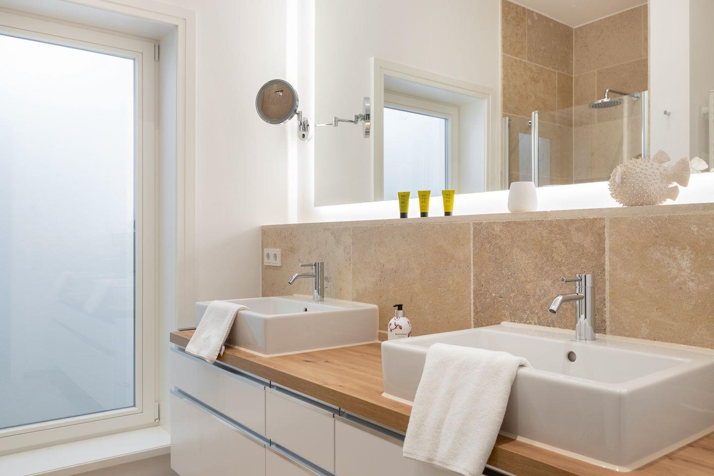 OG: zwei Schlafzimmer mit Doppelbett (180x200cm) und TV, ein Badzimmer mit Dusche, Badewanne und WC