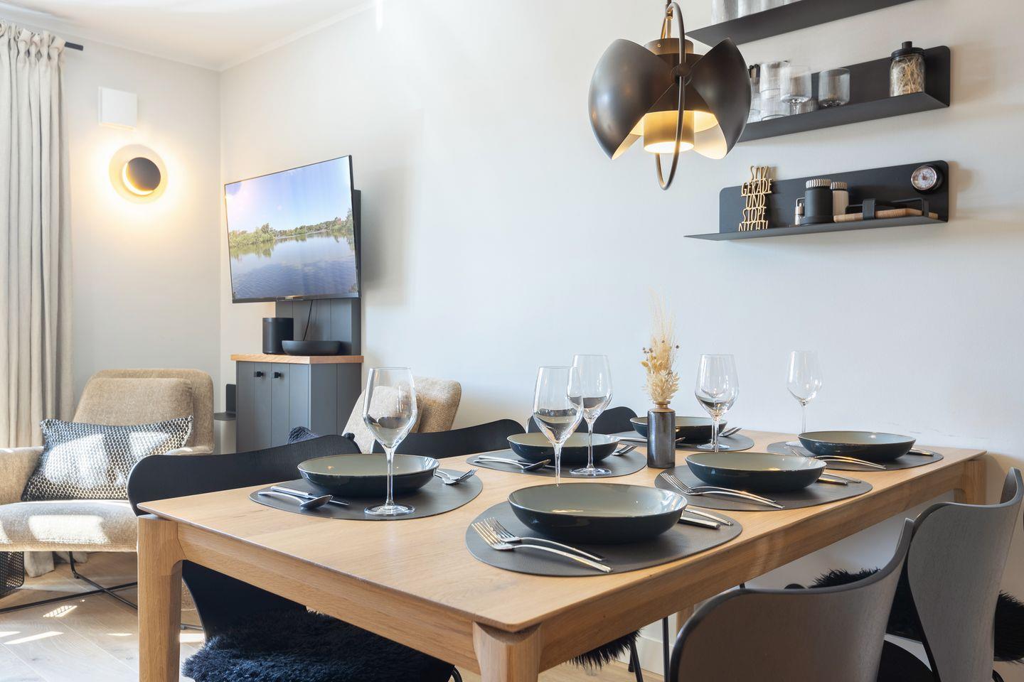 Dieses sehr gut ausgestattete Hausteil ist der perfekte Ort, um die schönste Zeit des Jahres zu verbringen. Die Ausstattung besticht durch den offenen Grundriss und durch die Kombination von ausdrucksstarken schwarzen Elemente und warmen Farben der Möbel und Dekorationen.