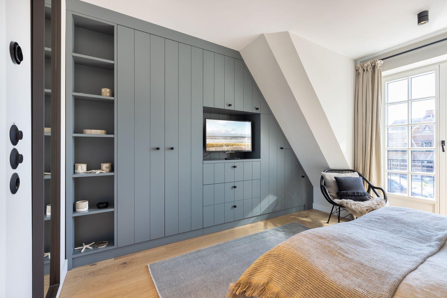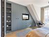 OG: ein Schlafzimmer mit französischen Bett (1,60 x 2,00m), Smart TV und einem Badezimmer mit Dusche und WC