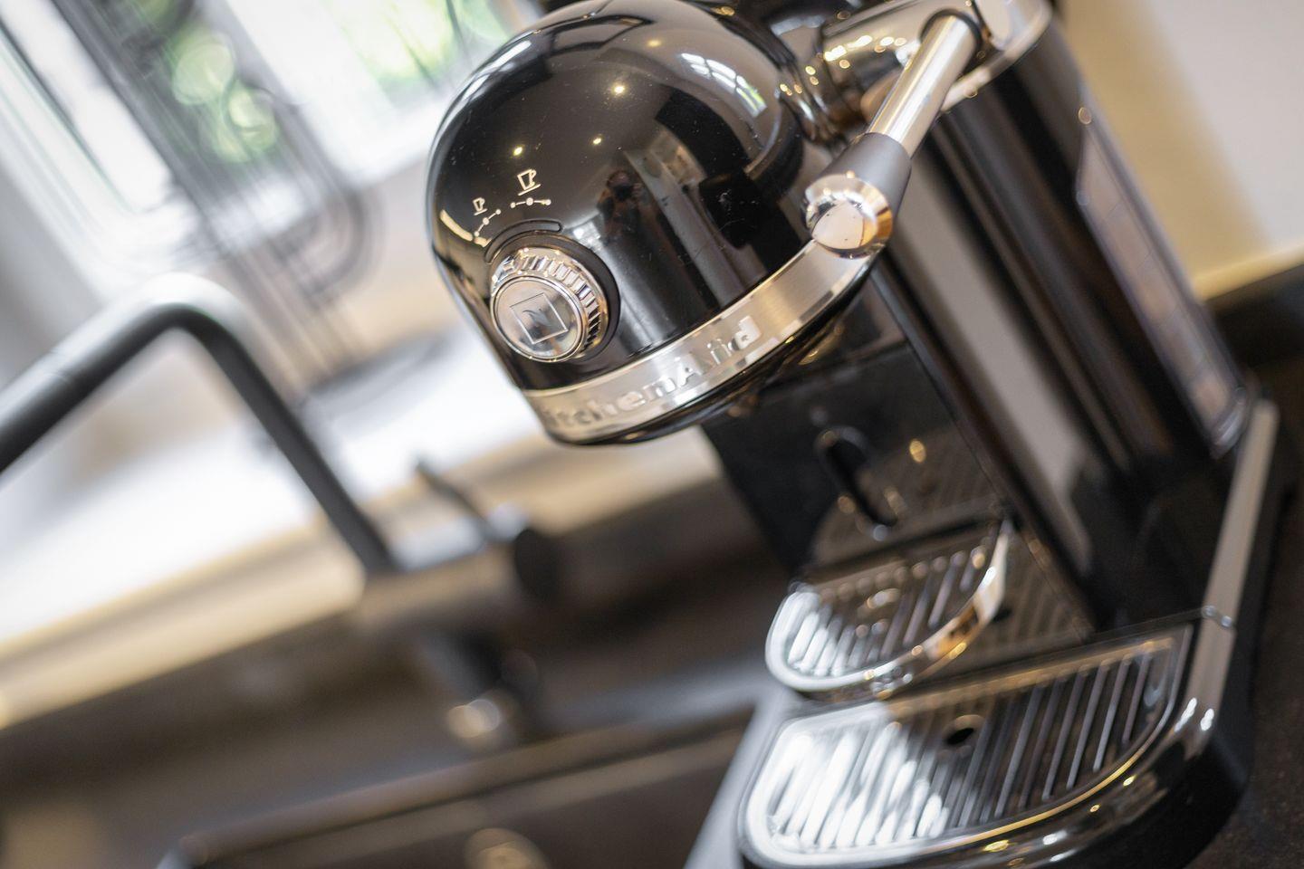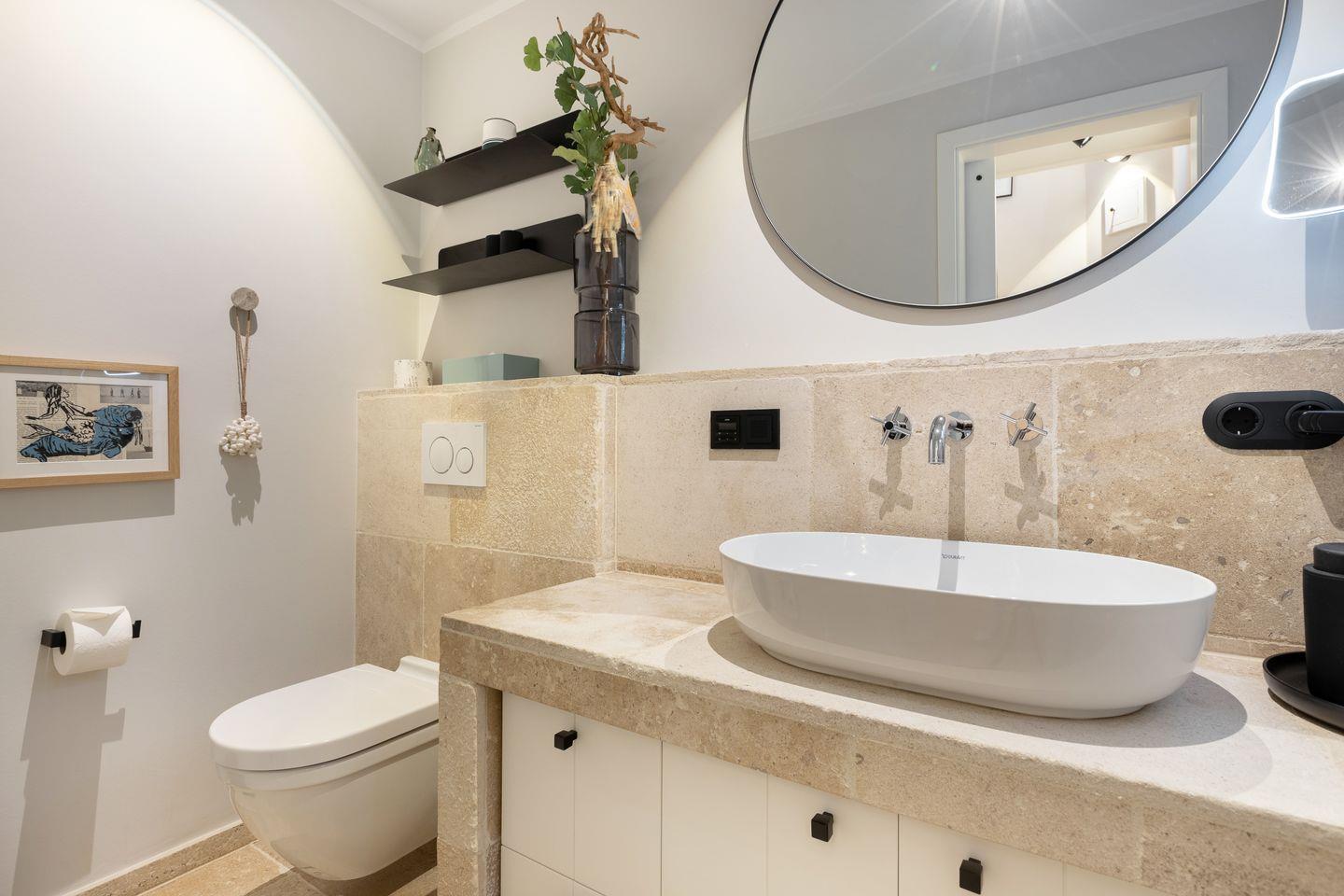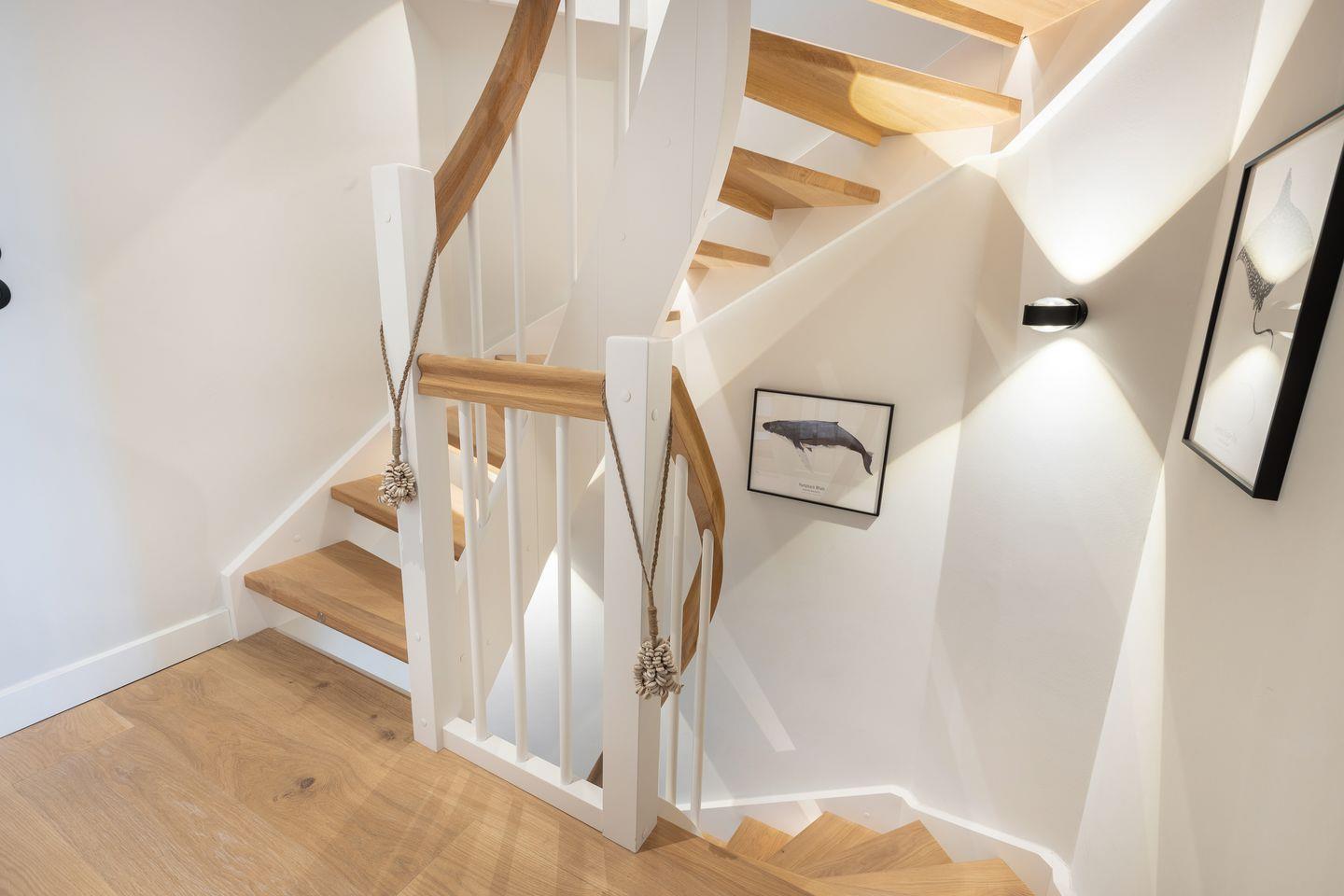 EG: Wohnzimmer mit Smart-TV, Couch und Sesseln und einem Gaskamin, der Essbereich bietet 6 Personen Platz, die Küche ist komplett ausgestattet mit Induktionskochfeld, Geschirrspüler, Mikrowellen-Backofen-Kombi, Filterkaffeemaschine, Nespressomaschine und einem Thermomix. Auf der Terrasse steht ein Strandkorb, ein Tisch und Stühle für Sie bereit. Im Erdgeschoß ist noch ein kleines Gäste-WC vorhanden.