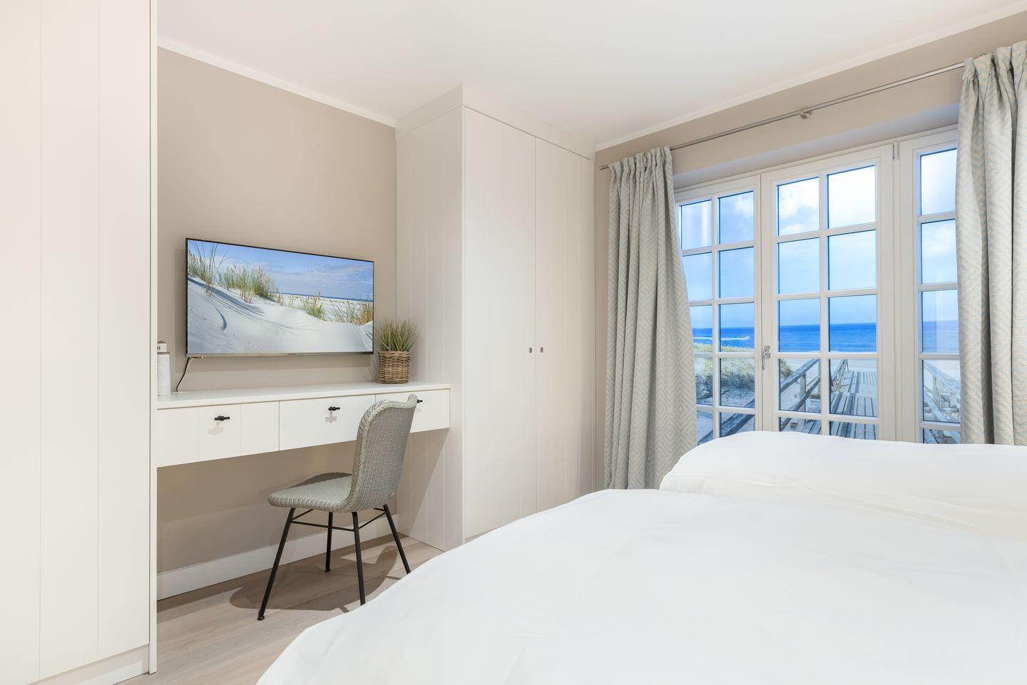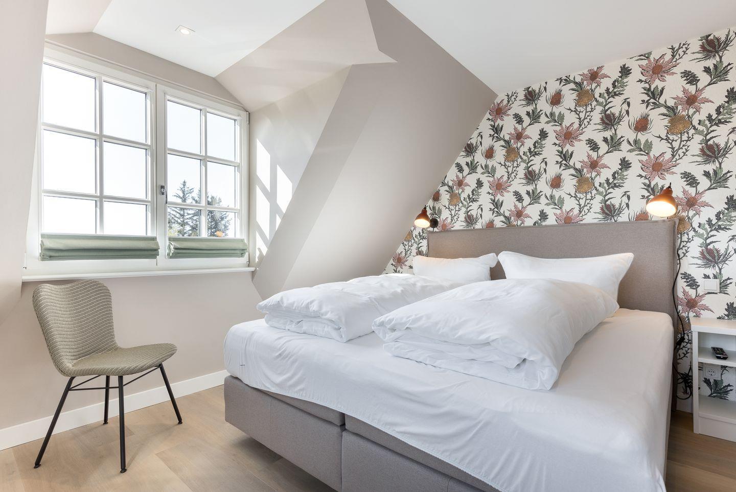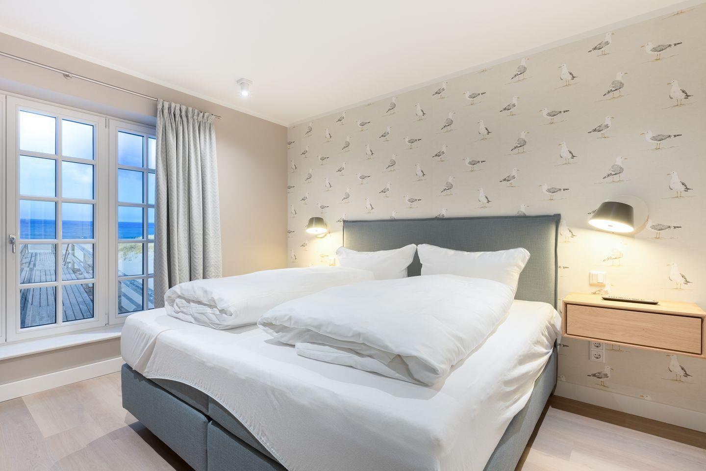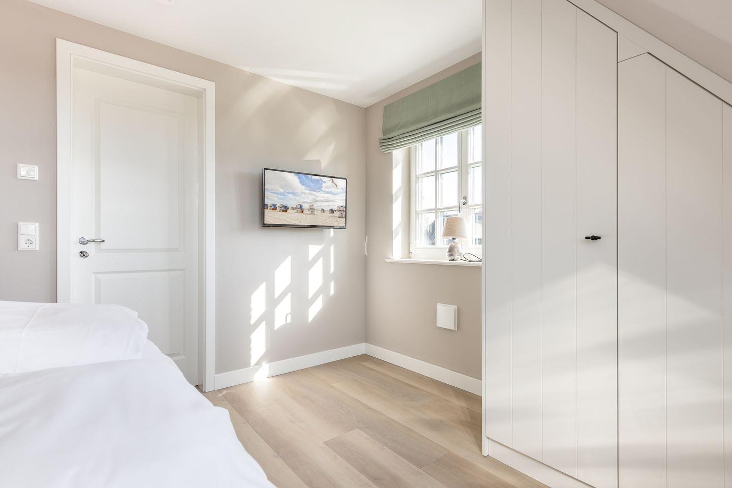 Die Schlafzimmer befinden sich im Ober- und Untergeschoss und sind jeweils mit hochwertigen Boxspringbetten sowie Smart-Flat-TVs ausgestattet. Im Dachgeschoss findet sich eine hochwertige Schlafcouch und ein weiteres Smart-TV-Gerät. Hier mit einer Tasse Tee und einem Buch unter’m Arm vom Alltag abmelden – so geht Urlaub. (Für alle, die nur teilweise urlauben können – das WLAN im Lille Wung ist homeoffice-erprobt und für sehr gut befunden worden!)