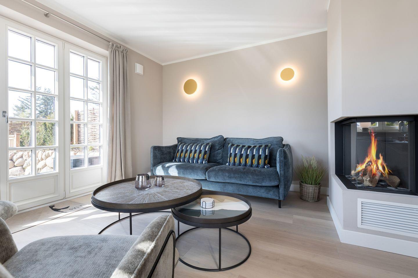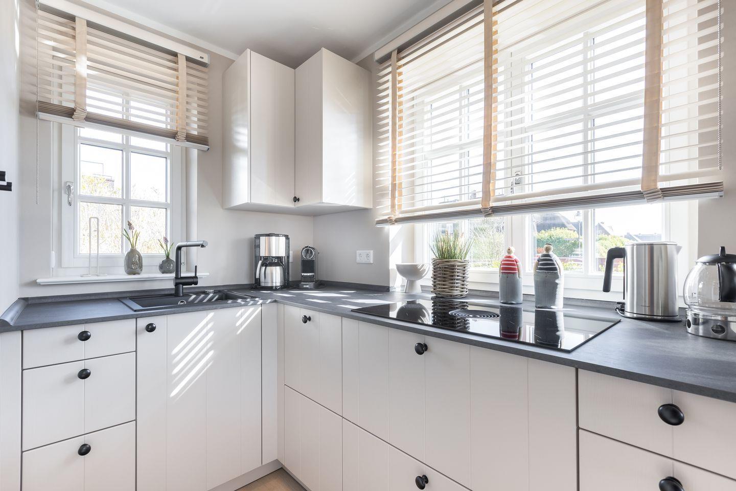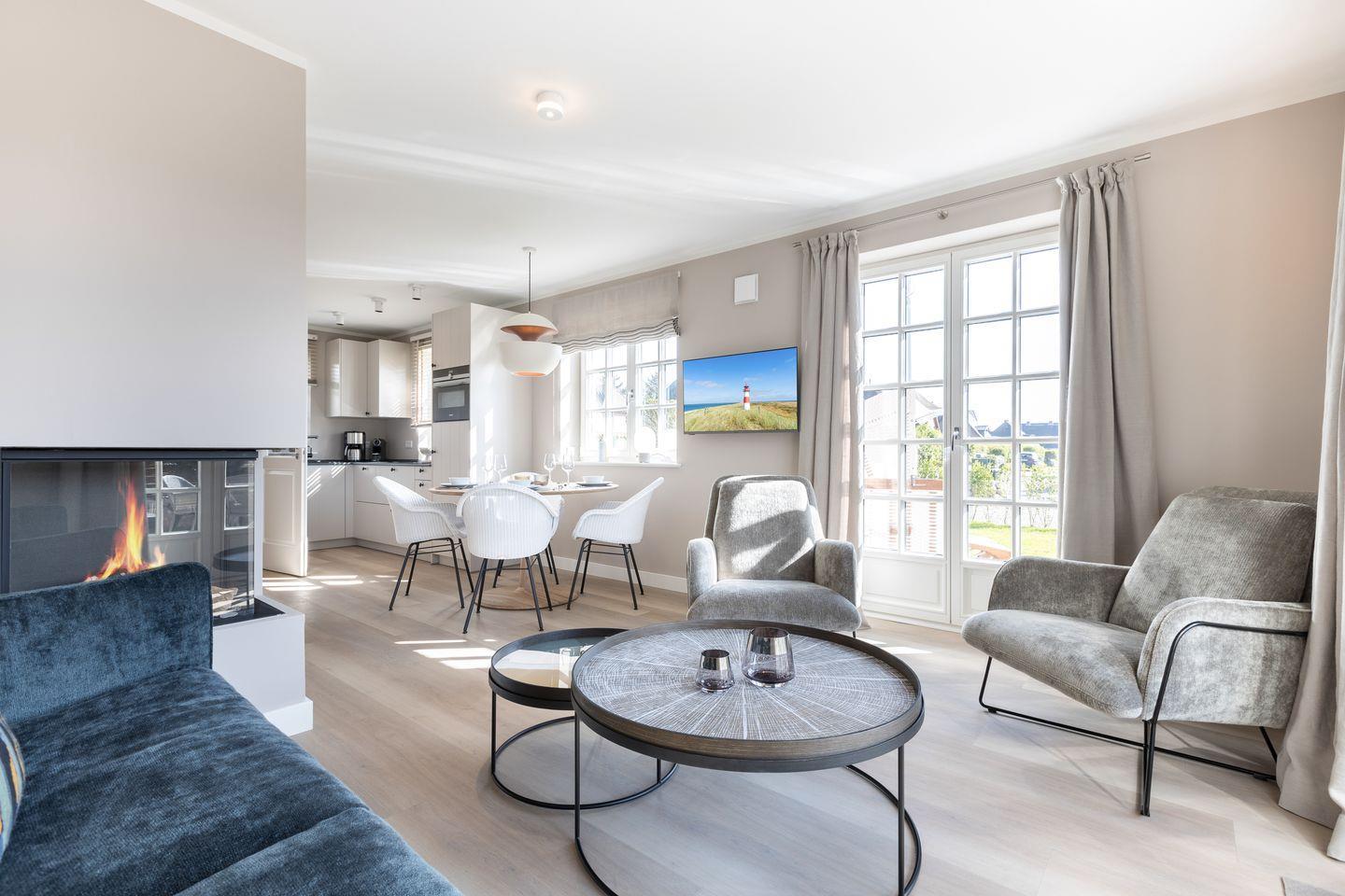 EG: Wohnraum mit Flatscreen-TV, Gaskamin, Essbereich, offene Küche mit Backofen, Induktionsherd, Spülmaschine, Filterkaffeemschine, Nespressomaschine, Gäste-WC, Garten mit einer Süd- und einer Westterrasse mit Gartenmöbeln, Sonnenschirm und zwei Strandkörben