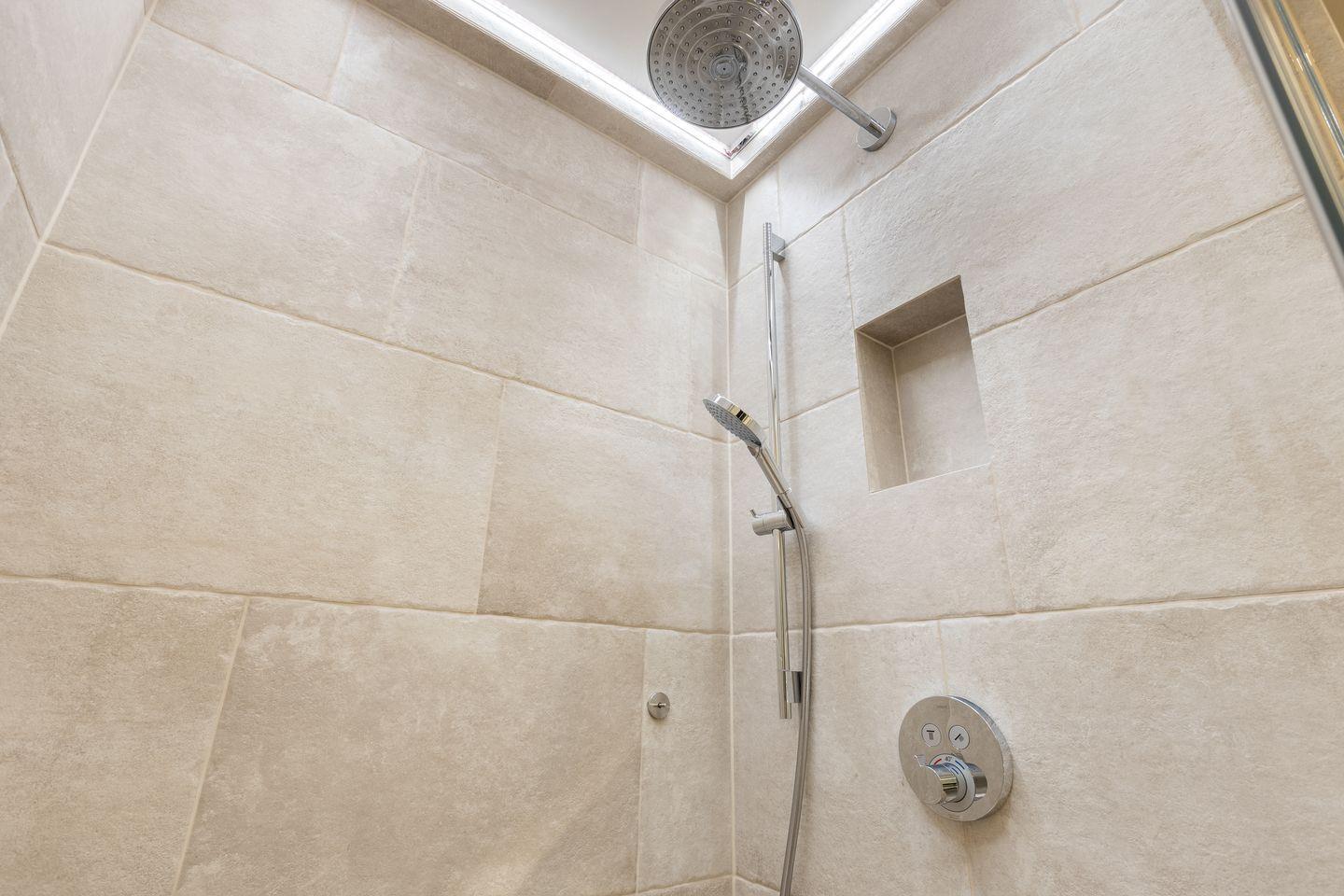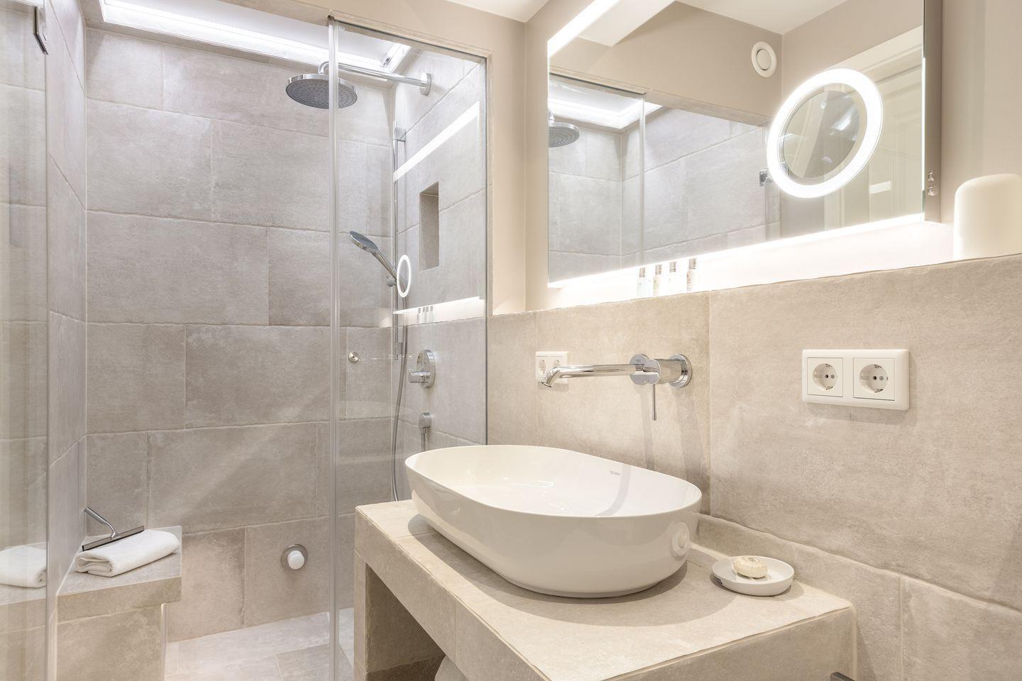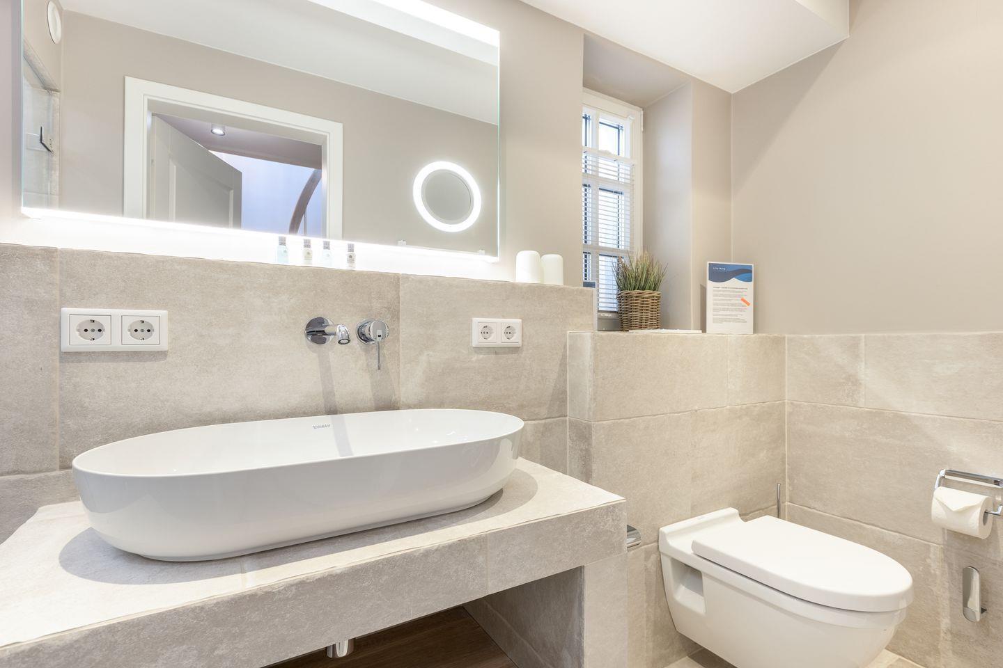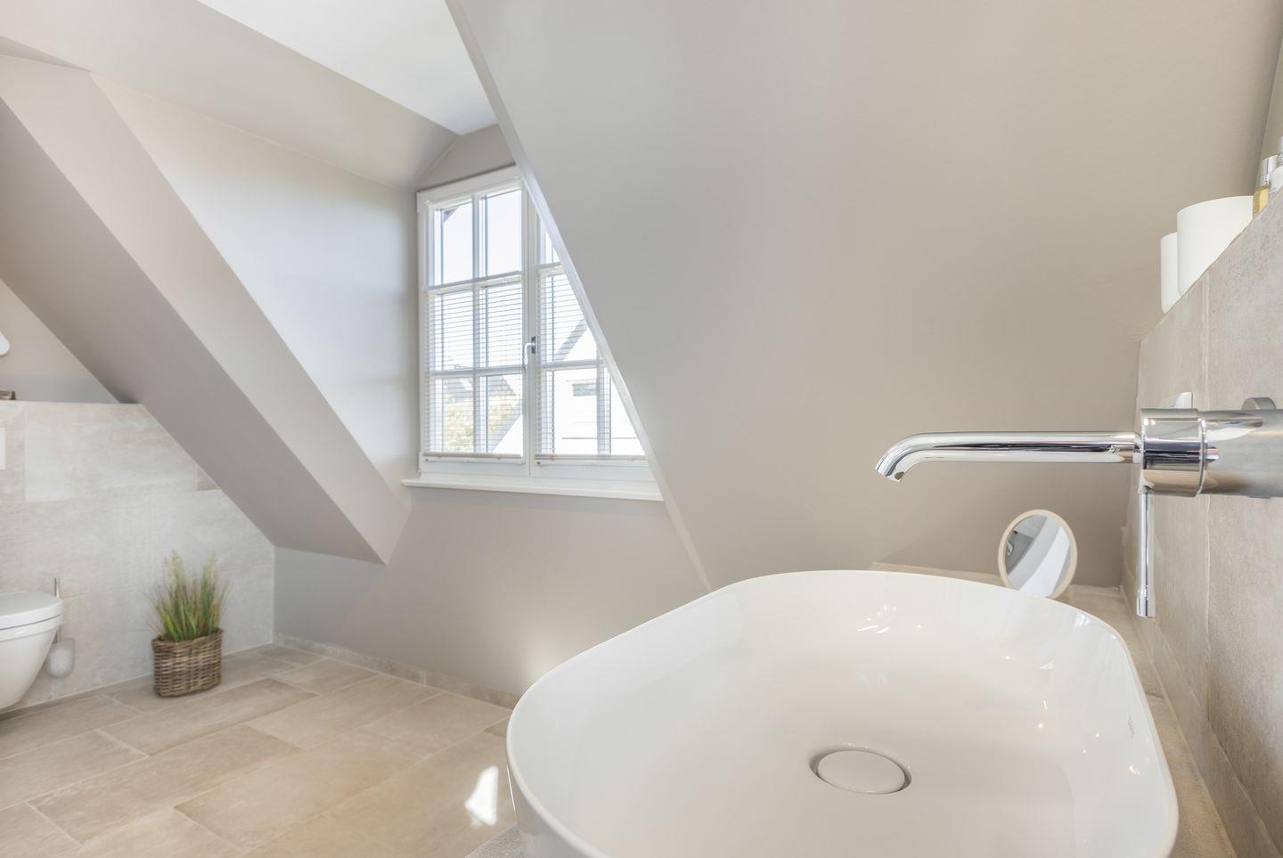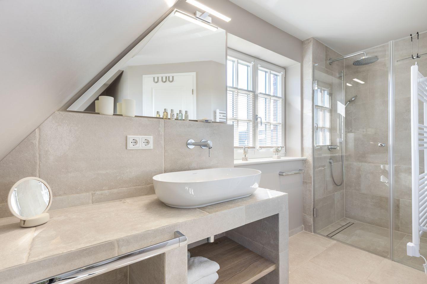 Die Bäder im Ober- und Untergeschoss sind großzügig und geschmackvoll gestaltet. Mittels der Dampfbadfunktion lässt man im Untergeschoss auch „Schiet“-Wetter an sich abperlen und genießt die wohltuende Wirkung auf Körper und Geist.