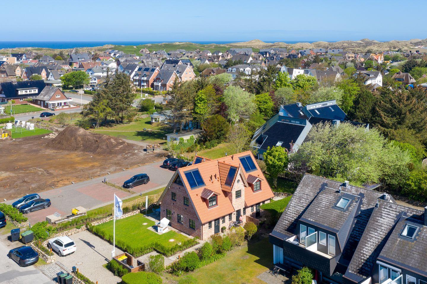 Das Haus „Lille Wung“ besticht genau damit. In einer ruhigen Seitenstraße gelegen, sind es nur 600 Meter bis zur Promenade und zum Strand. Noch kürzere Wege führen zum Bäcker, zum Supermarkt, zum Fahrradverleih, zum Fischrestaurant Blum oder zum Dorfteich. Und wen es doch einmal aus Wenningstedt treibt, der hat die Bushaltestellen quasi in Sichtweite.