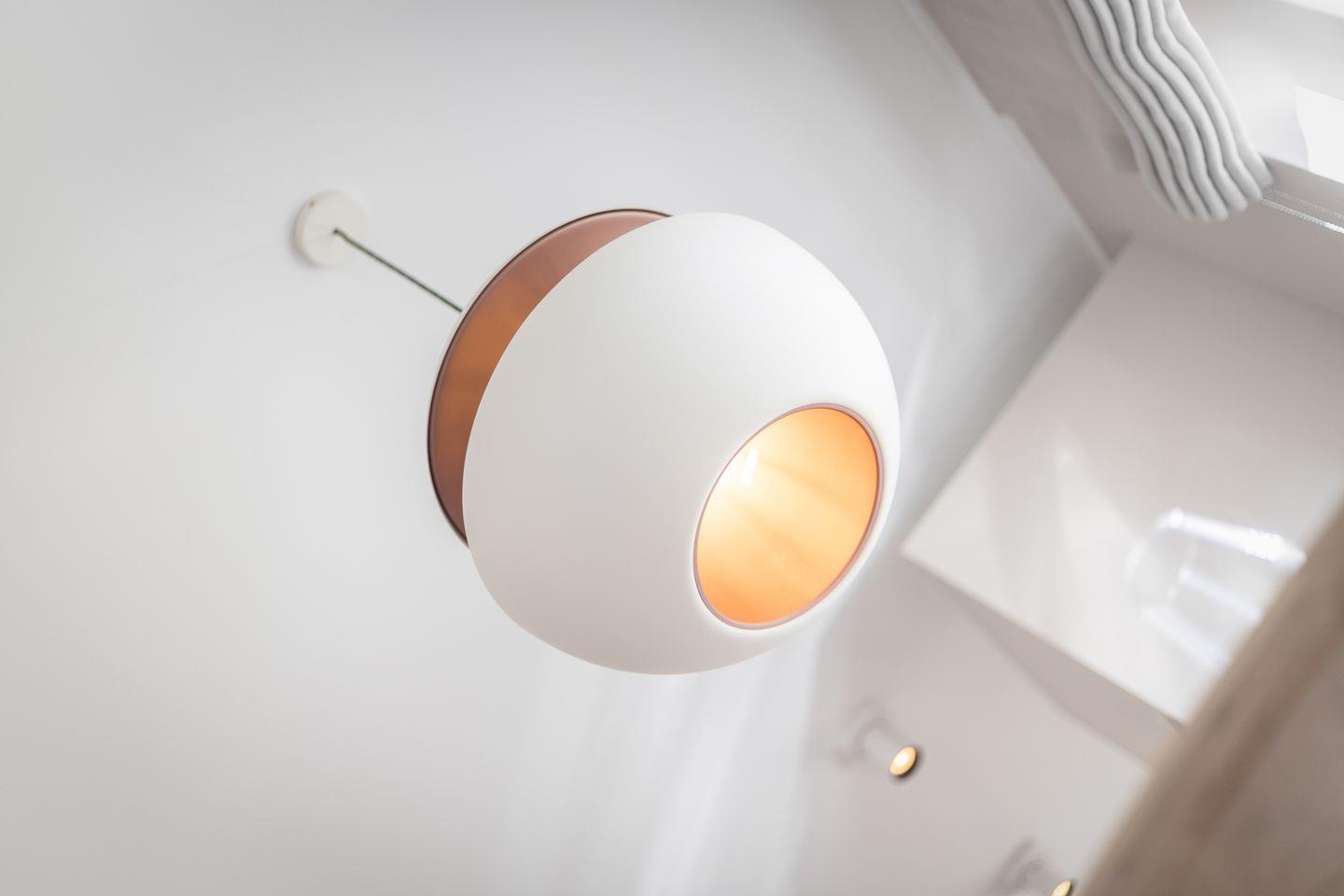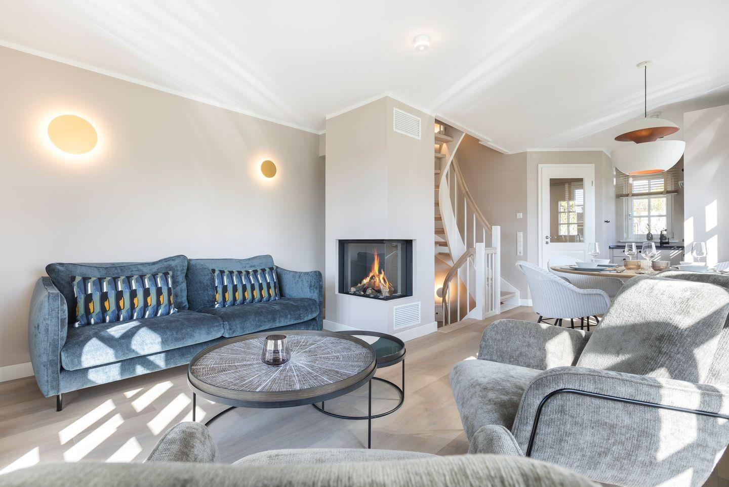 Vom ersten Moment an wohlfühlen – nach diesem Motto wurde dieses Haus eingerichtet. Im Wohnbereich des Erdgeschosses kann man es sich richtig gemütlich machen. Hochwertige Sessel, eine geschmackvolle Couch und stimmungsvolle Beleuchtung – was braucht es mehr? Vielleicht noch den Gaskamin, den man besonders an kühlen Tagen zu schätzen weiß. Der runde Esstisch bietet ordentlich Platz für fünf Personen und die offene, moderne Küche überzeugt sowohl mit ihrem Design als auch mit viel Stauraum und einer üppigen Ausstattung. In den Treppen eingelassene LED-Leisten sorgen für eine entspannte Atmosphäre.