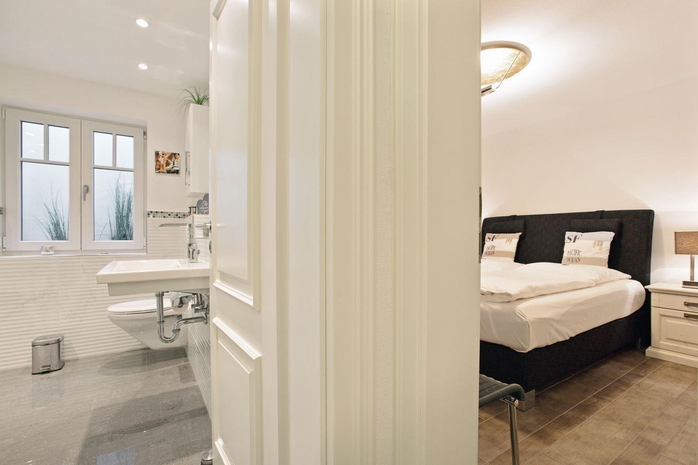 Geschmackvolle Original-Kunst schafft an Ihren Wänden ein stilvolles, schönes Urlaubsambiente. Ihre zum Osten ausgerichtete und daher optimal windgeschützte, kleine Terrasse mit Strandkorb lässt Sie z.B. morgens draußen toll frühstücken.