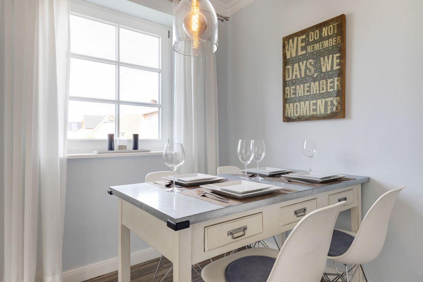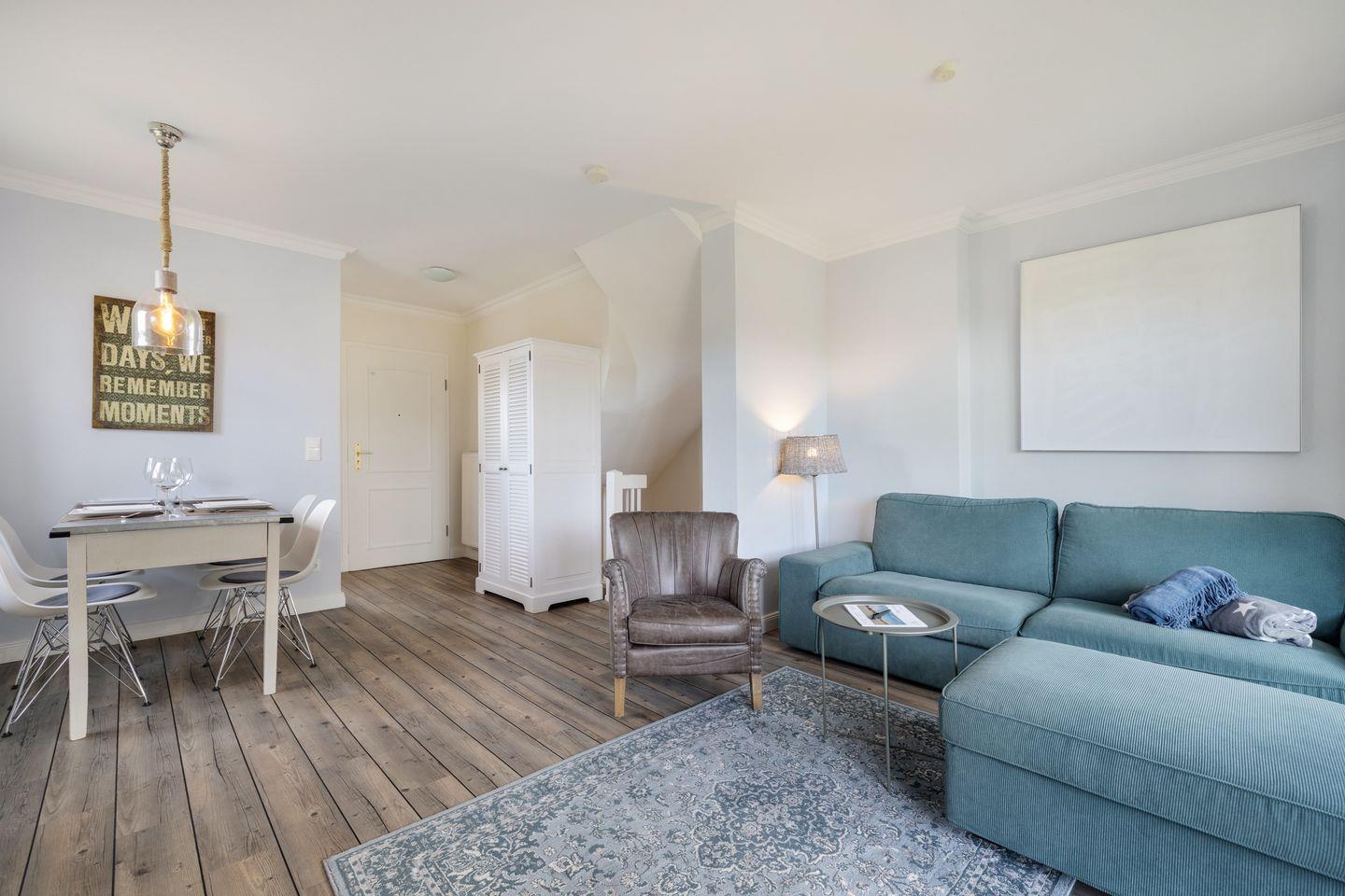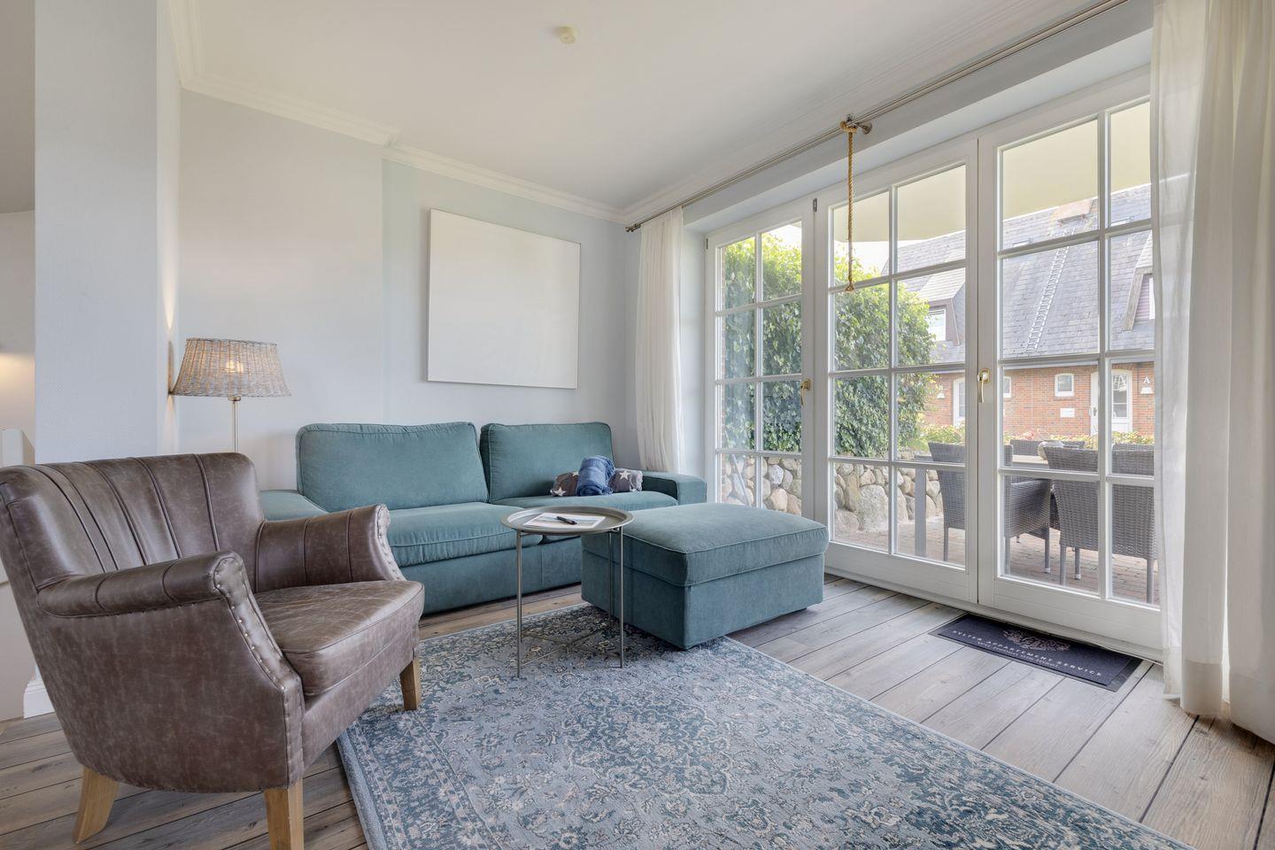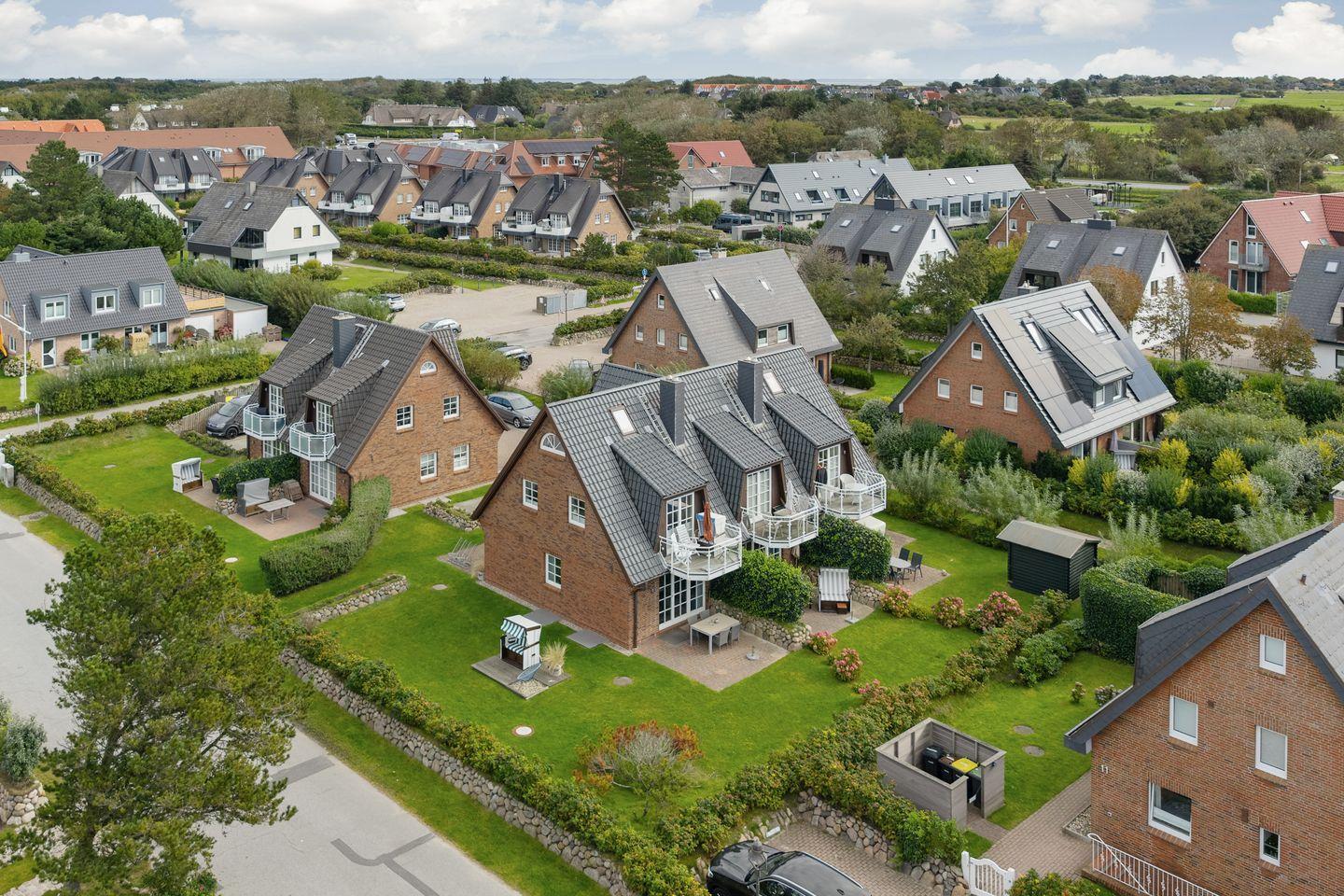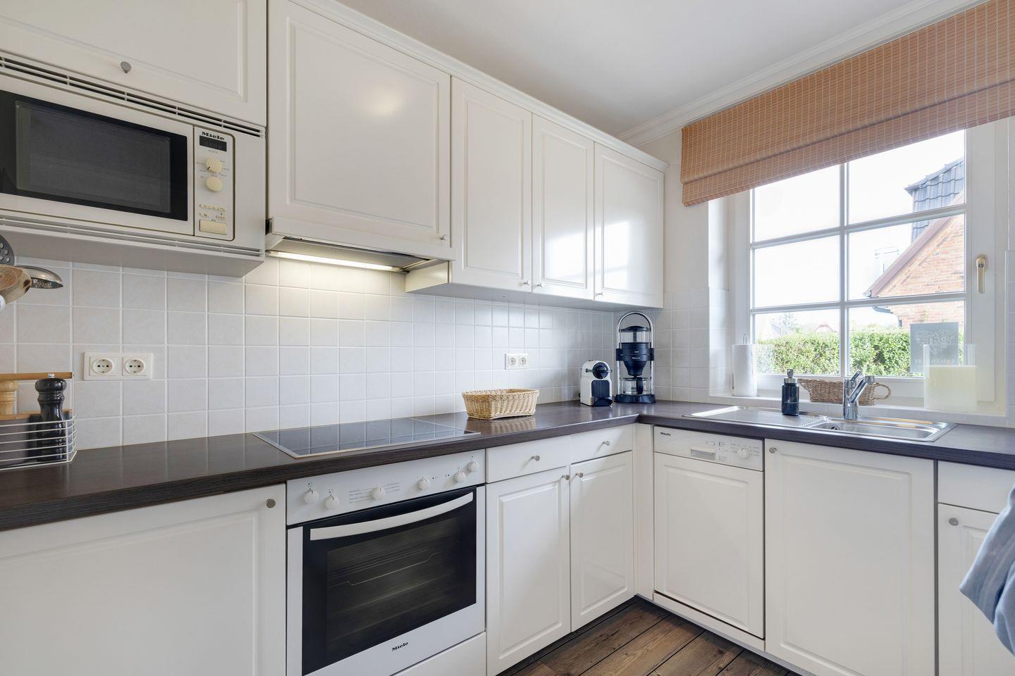 Erdgeschoss: großzügiger Wohnraum mit Kabel-TV (Flatscreen), integrierter Radiofunktion, DVD/CD-Player. Gemütlicher Esstischbereich. Separate Küche mit Geschirrspüler, Backofen, Mikrowelle und Nespressomaschine. Große Terrasse, zum Süd-Westen ausgerichtet, mit Strandkorb (ca. von April-Oktober).