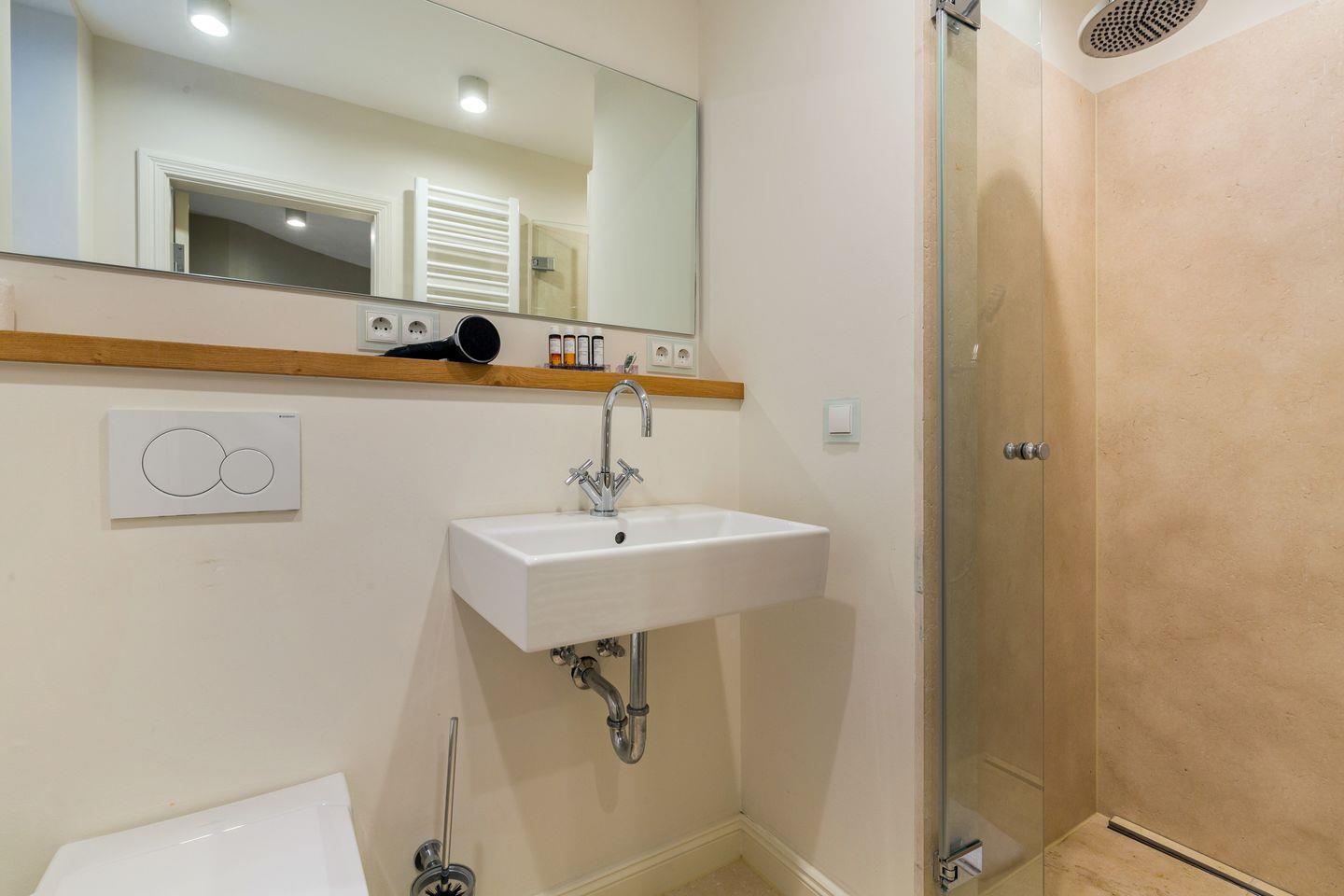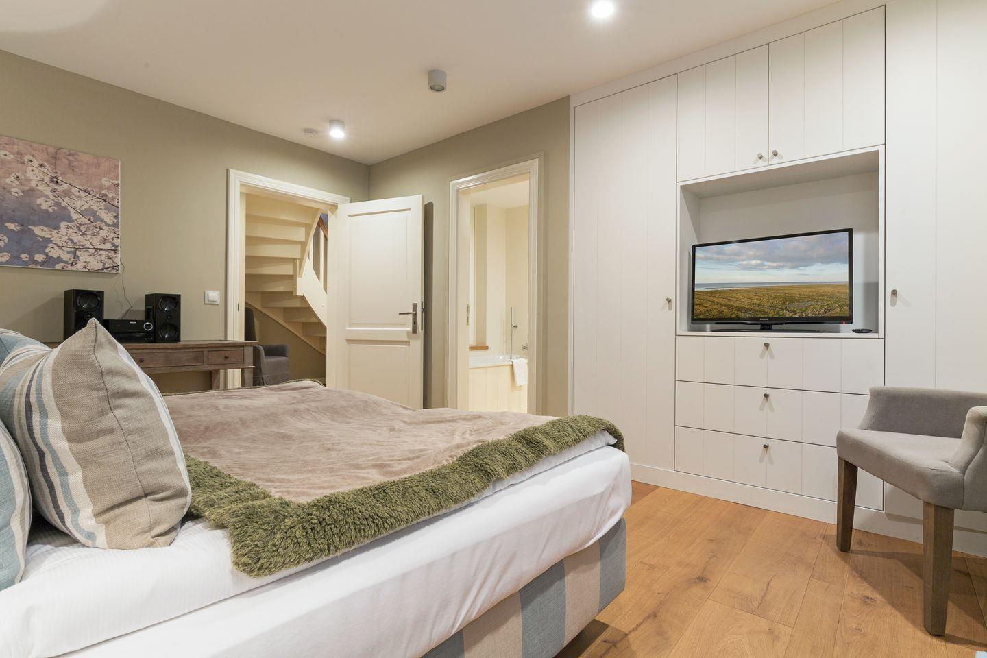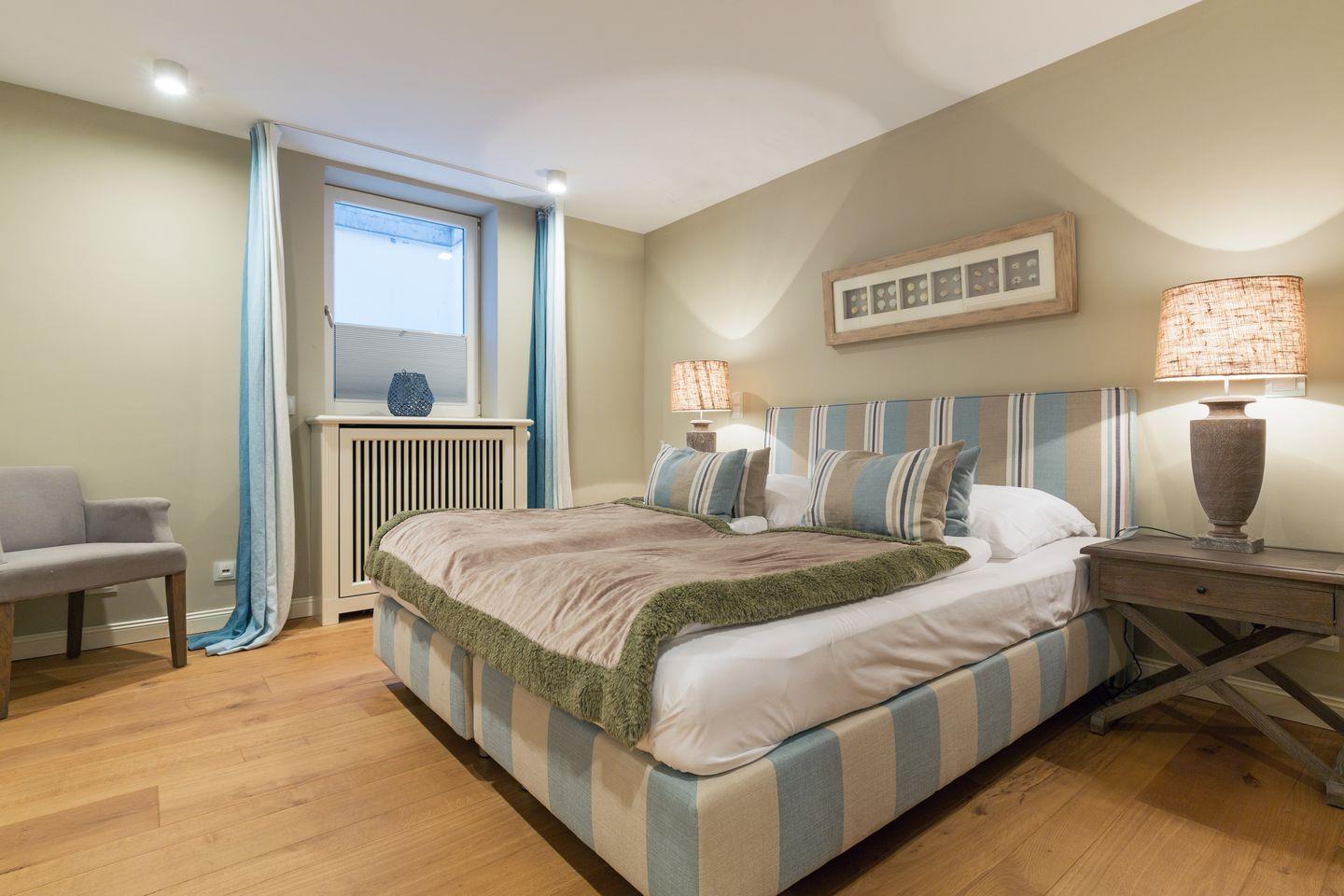 Im Obergeschoss finden Sie einen äußerst geschmackvoll designten Masterbedroom mit Flat-TV vor. Ihr Doppelbett (ca. 2x2m) sorgt für traumhaften Schlaf. Benachbart finden Sie ein weiteres Schlafzimmer mit eingebautem Doppelbett und Flat-TV vor (ca. 1,4x2m, durch den Erkereinbau verjüngt sich das Bett leicht). Sehr schönes En-Suite Bad mit großer Dusche, WC und feinem Waschtisch.