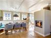 Zwischen Wohnbereich und Küche zaubert ein holzbefeuerter Kamin Wärme für's Auge und Herz.