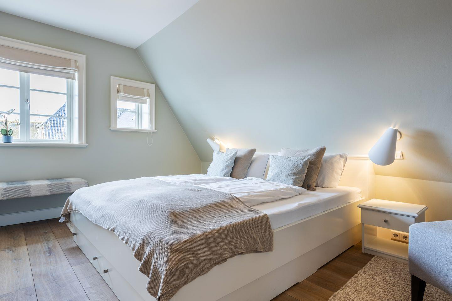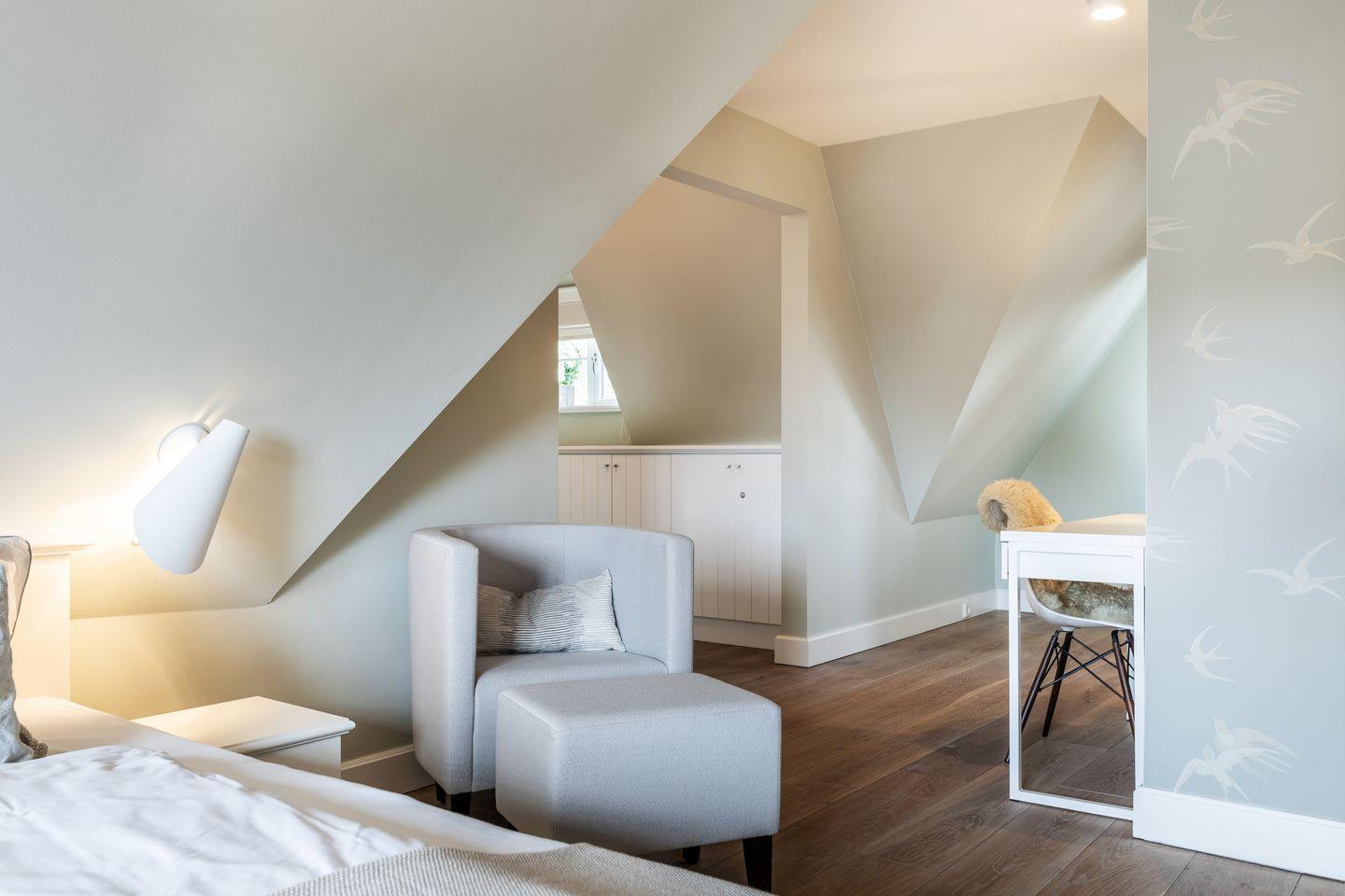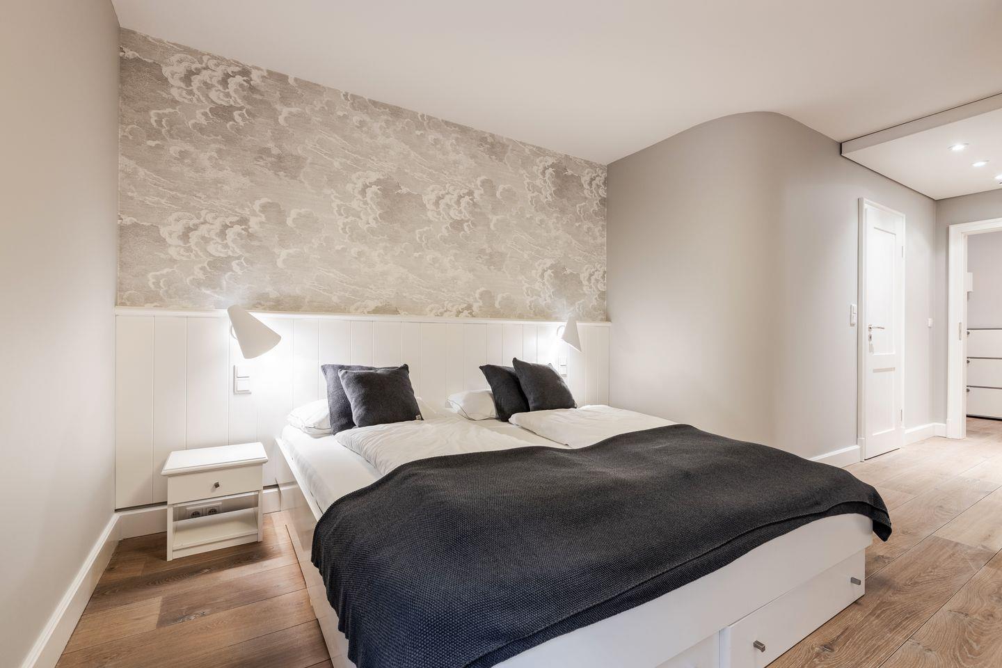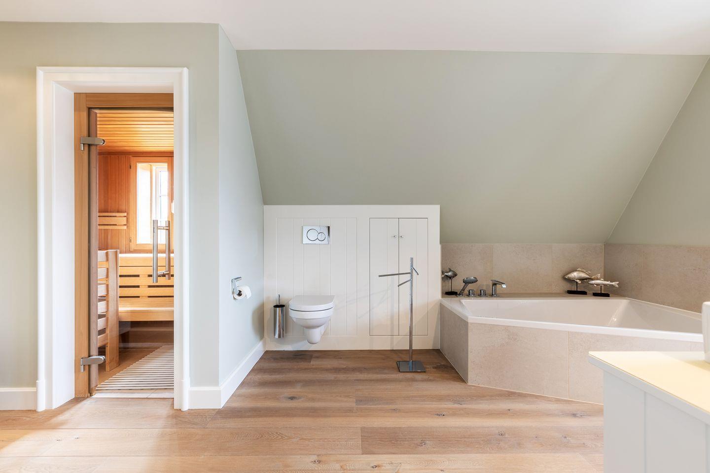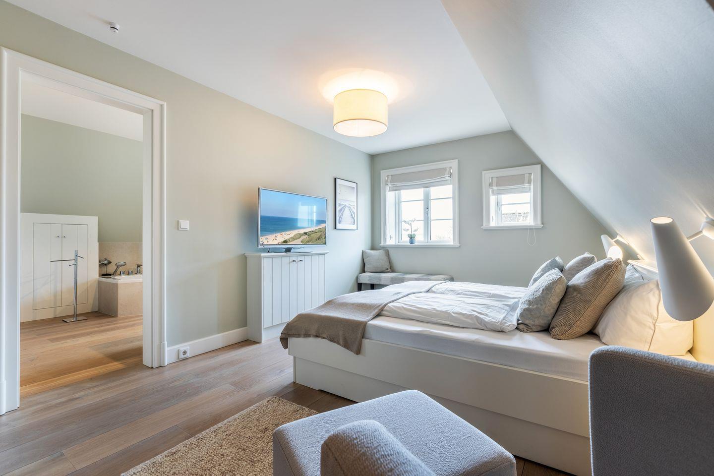 Alleine das Obergeschoss zu erleben ist den Besuch dieses besonderen Ferienlogis wert: Ein Masterbedroom, der den Namen auch wirklich verdient, dazu ein separater Bereich mit begehbarem Kleiderschrank sowie ein ganz besonders schönes Bad mit eigener Sauna verwöhnen Sie.