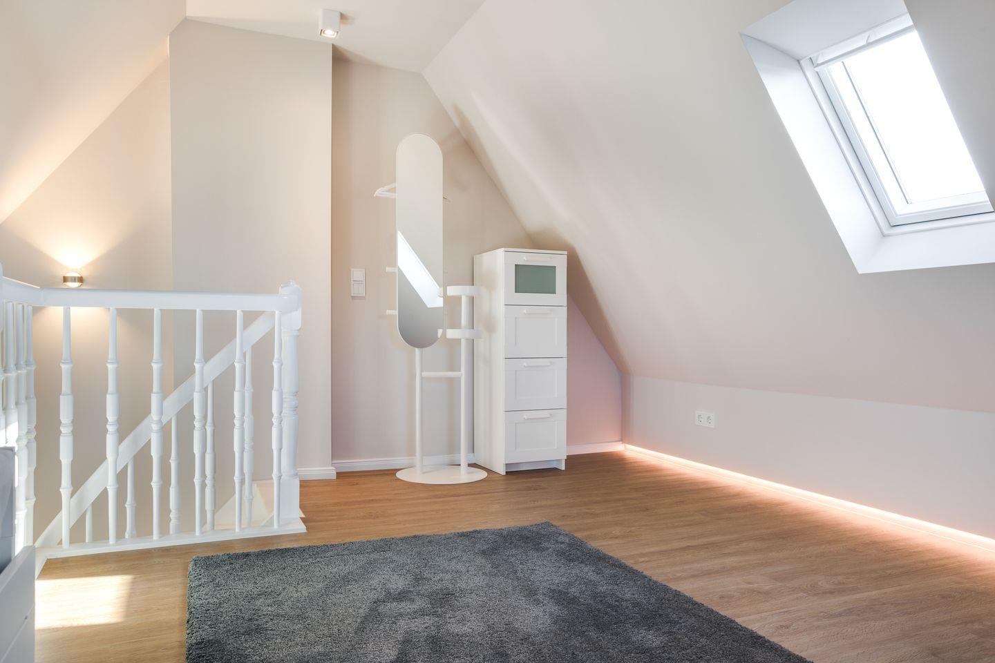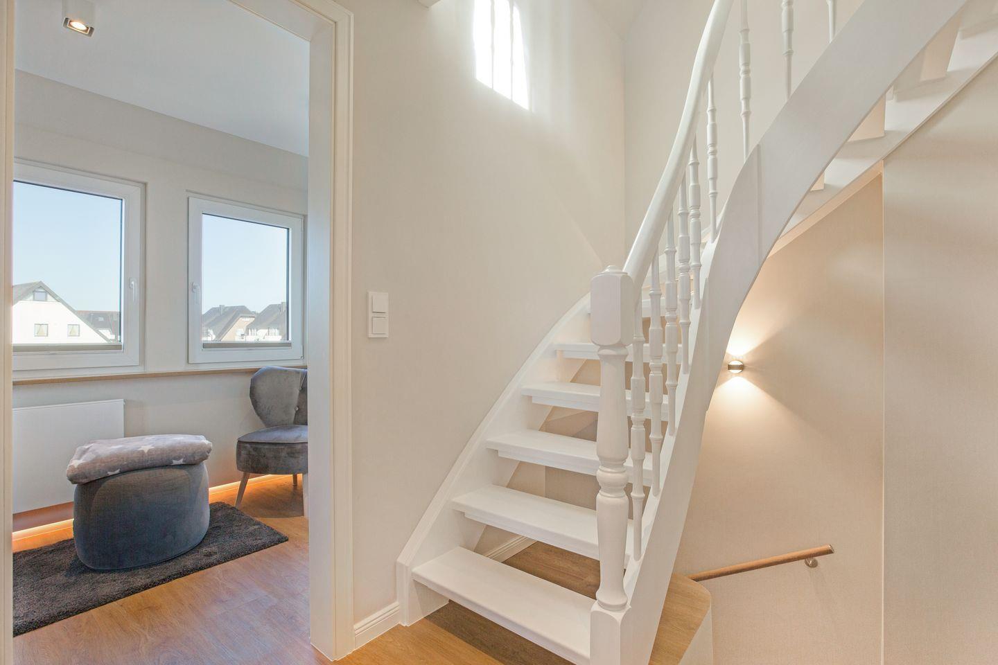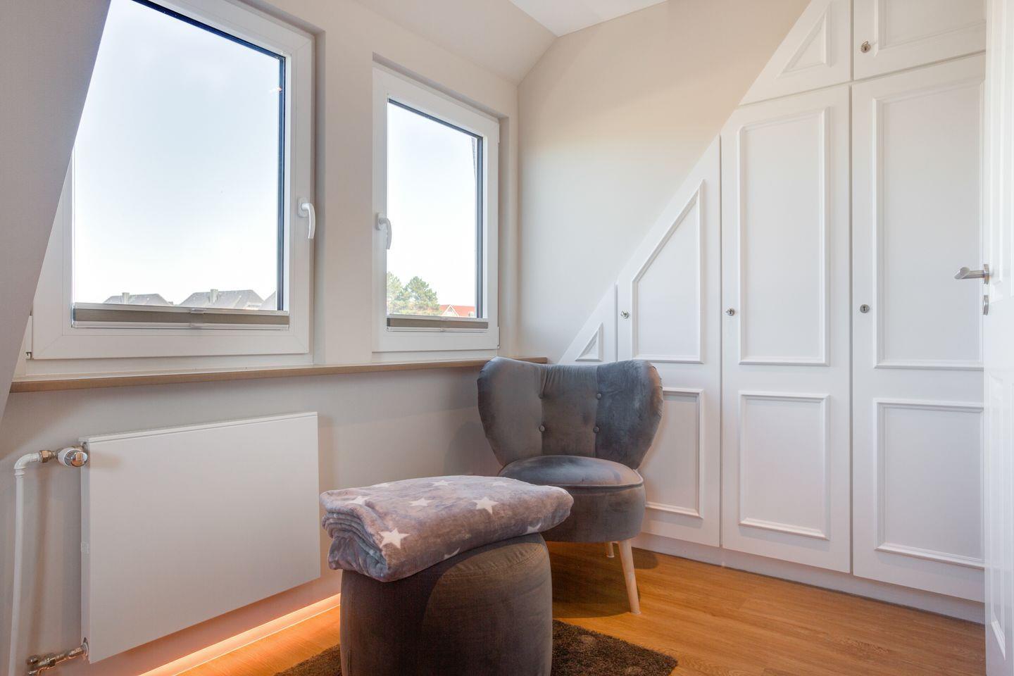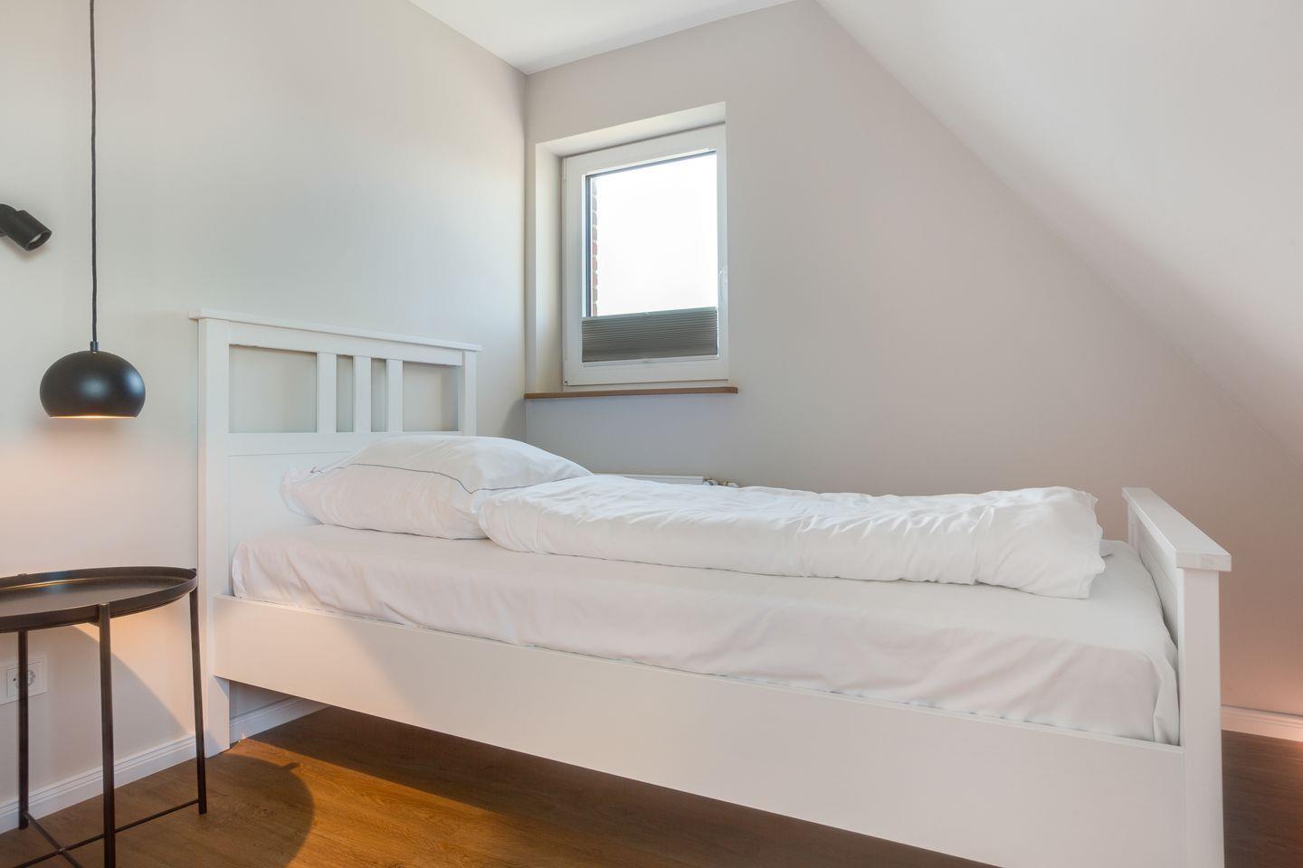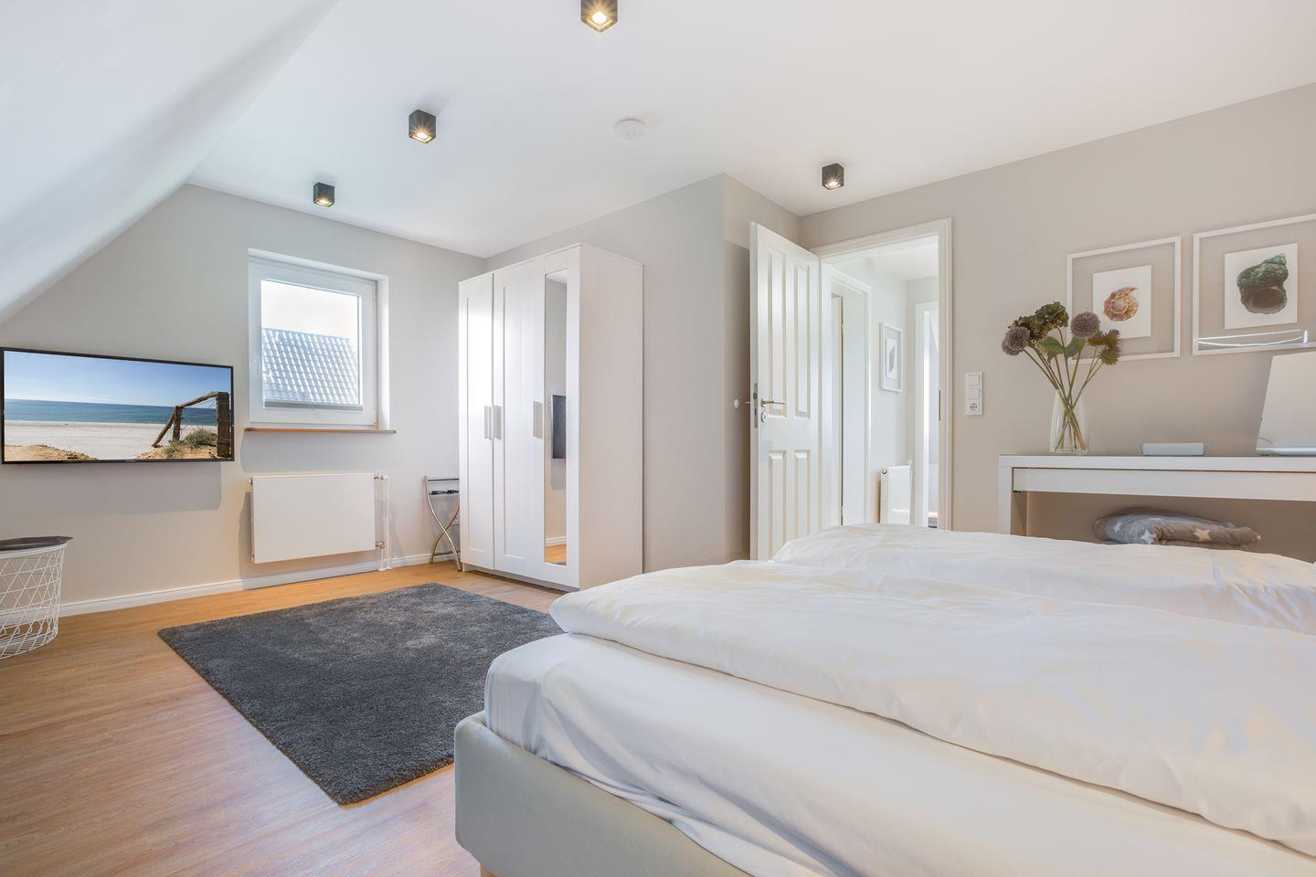 Im Obergeschoss erwartet Sie ein großzügiges Schlafzimmer mit Doppelbett und Flatscreen-TV und ein Badezimmer mit Dusche und WC. Außerdem findet hier ein weitere Urlaubsgast Platz in einem kleineren Schlafzimmer mit Einzelbett. Wenn Sie die Treppe ein weiteres Geschoss nach oben steigen, finden Sie ein weiteres Schlafzimmer mit Einzelbett und Sitzgelegenheit.