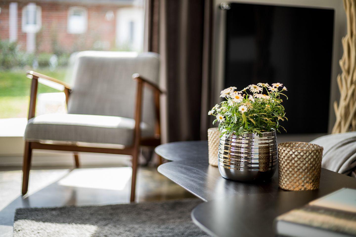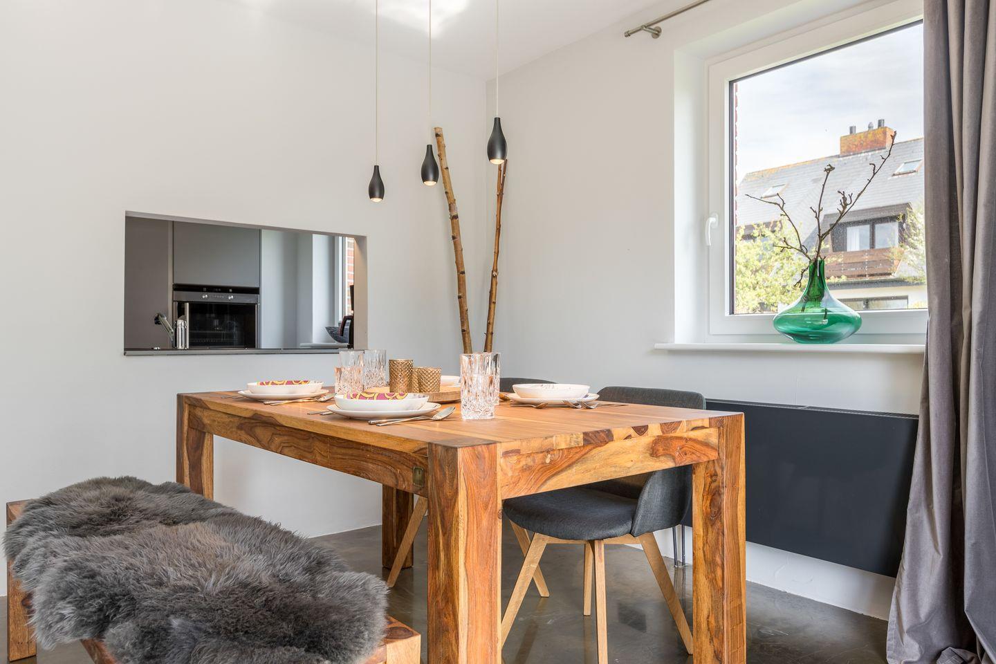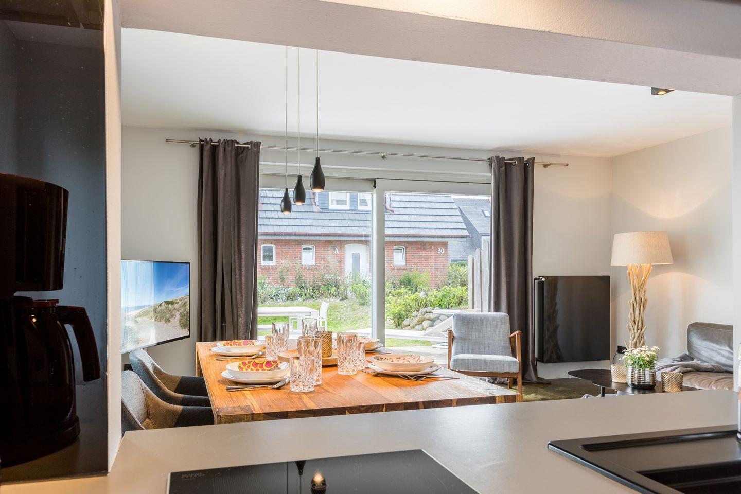 Edel gestalteter Wohn-/Essbereich mit Flat-TV, SKY-TV, WLAN, Sound-Dock. Separate, voll ausgestattete Küche mit bequemer Durchreiche zum Essbereich. Gäste-WC in der Diele.