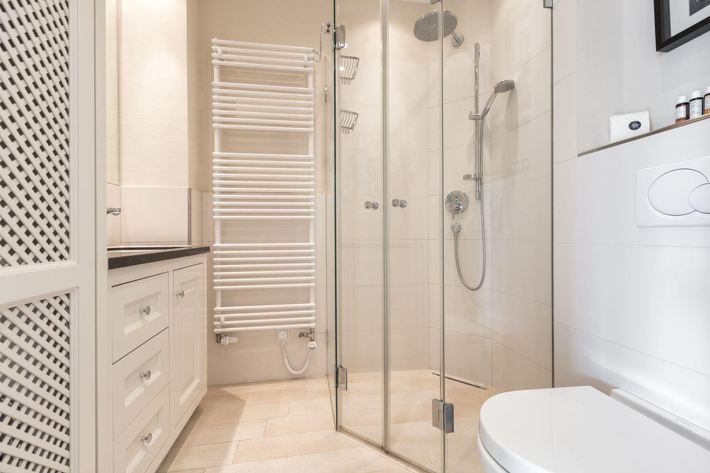 Freuen Sie sich auf ein feines Wellnessbad. Schöne, wertige Materialien schaffen ein tolles Ambiente. In Ihrer große Glasdusche starten Sie beschwingt in den Tag. Eine Waschmaschine und Trockner wurden von kundiger Tischlerhand geschickt in das Bad mit eingebaut.