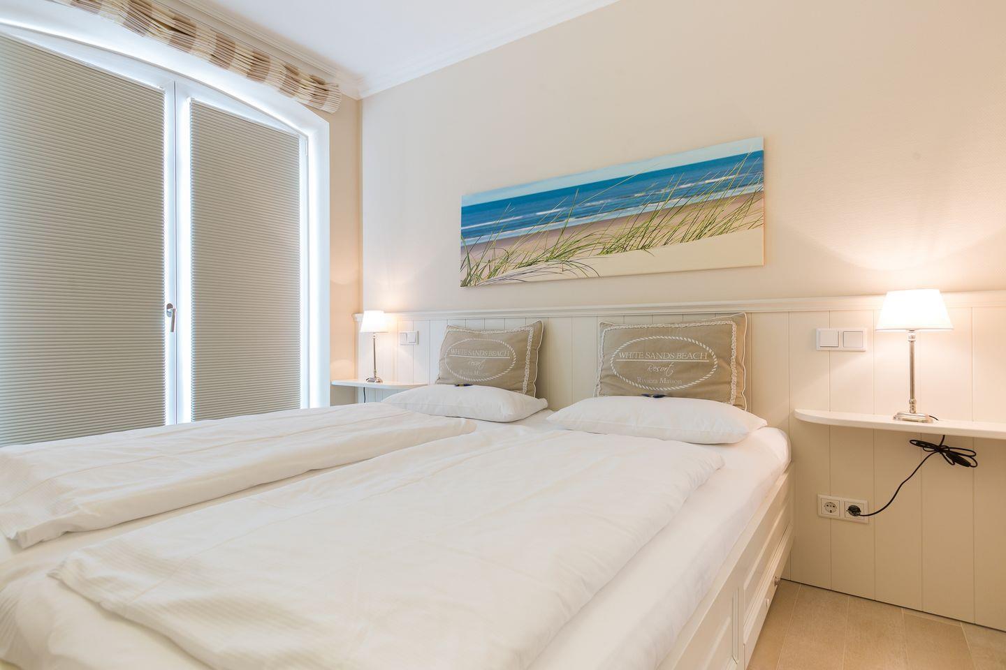 Ihr Schlafzimmer mit Doppelbett (180x200cm) ist edel, kuschelig und funktional zugleich: Wertige Tischlereinbauten schaffen viel Schrankplatz, so dass auch ein weiteres Paar Schuhe oder das zweite Lieblingskleid ruhigen Gewissens mit in den Urlaubskoffer dürfen. Der große Flat TV ist geschickt in den Kleiderschrank auf Augenhöhe integriert. Auch hier umweht Sie stets ein Hauch Meeresbrise und Beach - herrrlich.