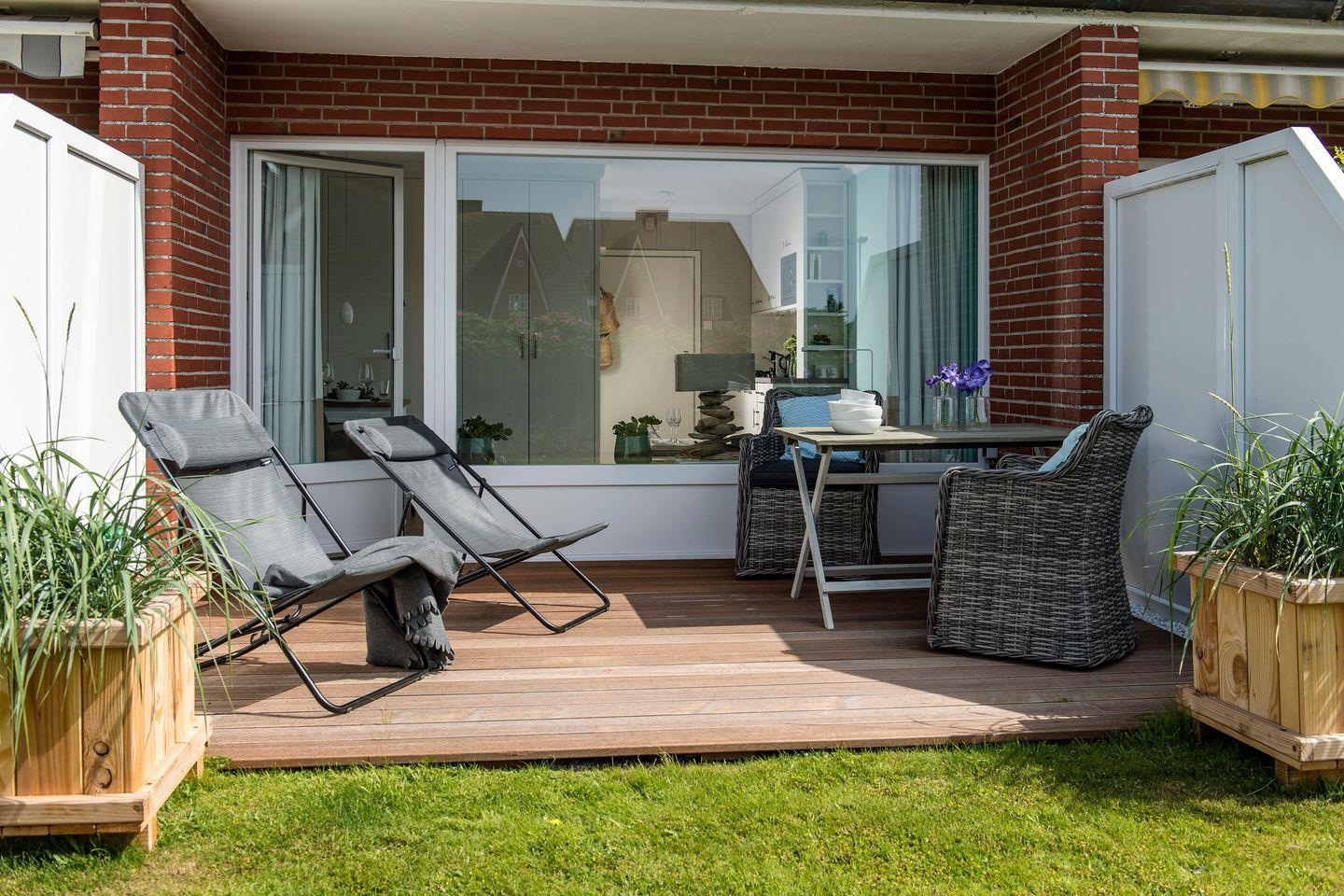 EG: Wohnraum mit Flatscreen-TV, W-LAN, Essbereich, Küchenzeile mit Mikrowelle, Geschirrspülmaschine, Filterkaffeemaschine, Nespressomaschine, Duschbad, Terrasse mit Gartenmöbeln und Markise, Gemeinschaftsgarten, Schlafcouch.