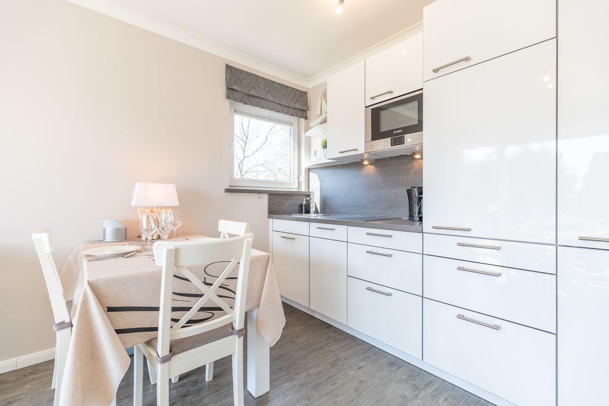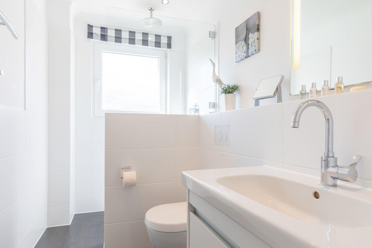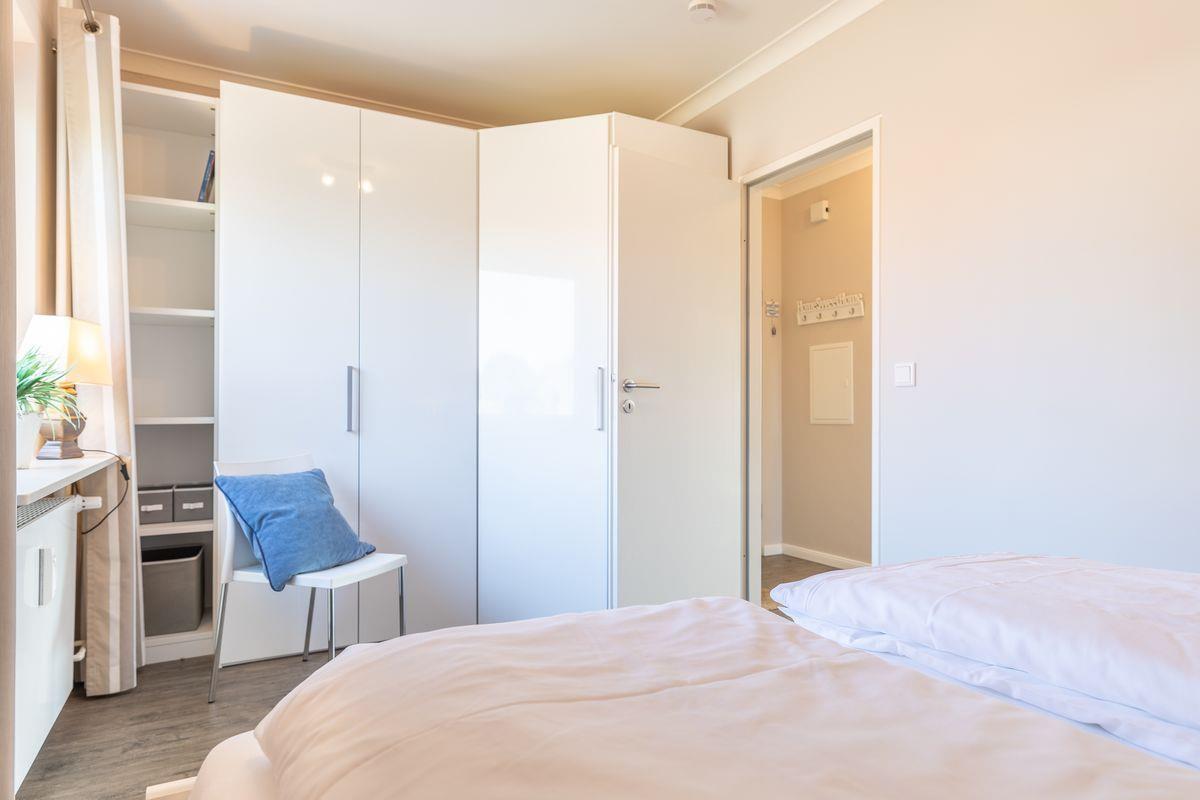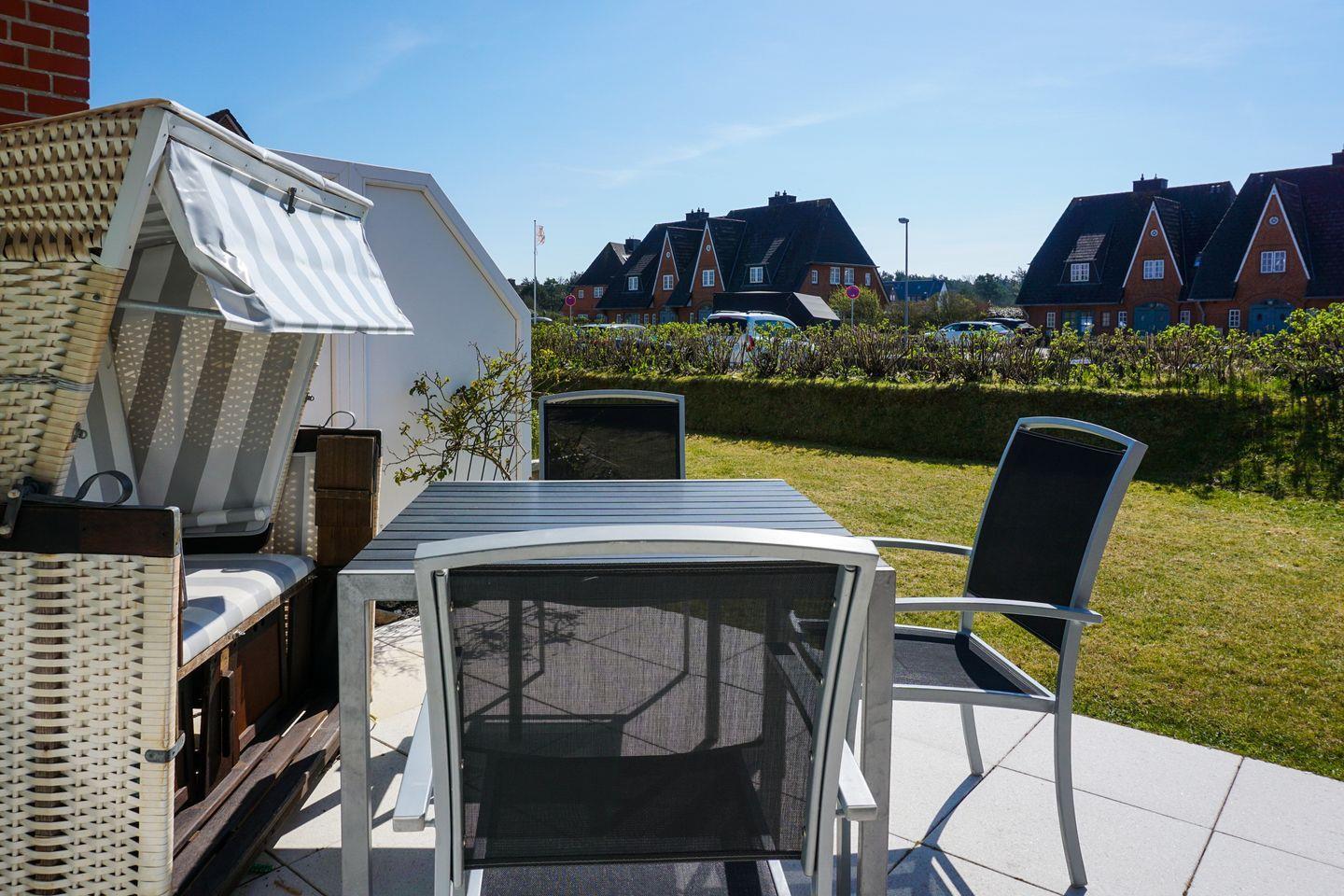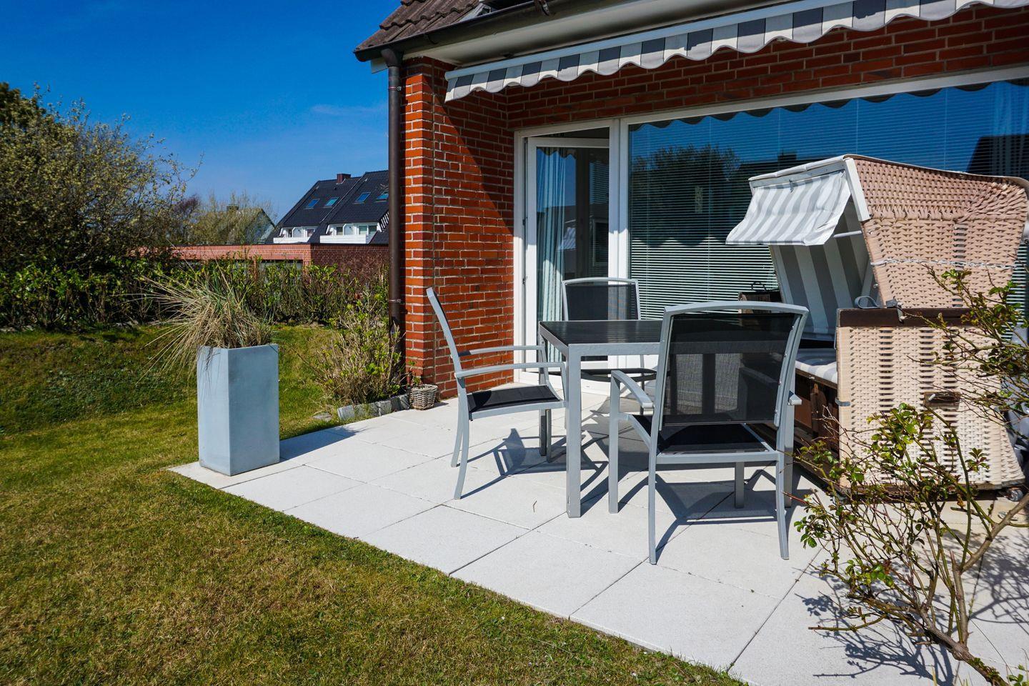 Die moderne Küchenzeile ist offen gestaltet und mit allem ausgestattet, was Ihr Urlaubsherz begehrt. Bereiten Sie sich Ihr Frühstück zu und genießen Sie es im Sommer auf Ihrer möblierten Terrasse mit Blick in den Garten des Domizils. Auf gleicher Ebene befindet sich ein Schlafzimmer mit Doppelbett und großzügigem Schrankplatz. Nebenan finden Sie Ihr modernes Tageslichtbadezimmer mit Dusche und WC.