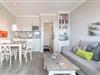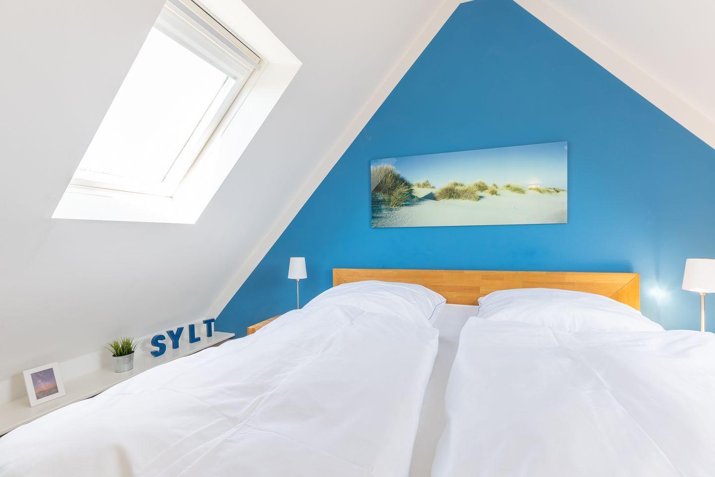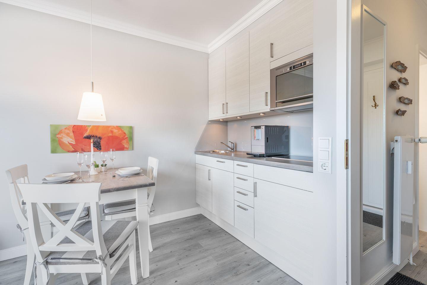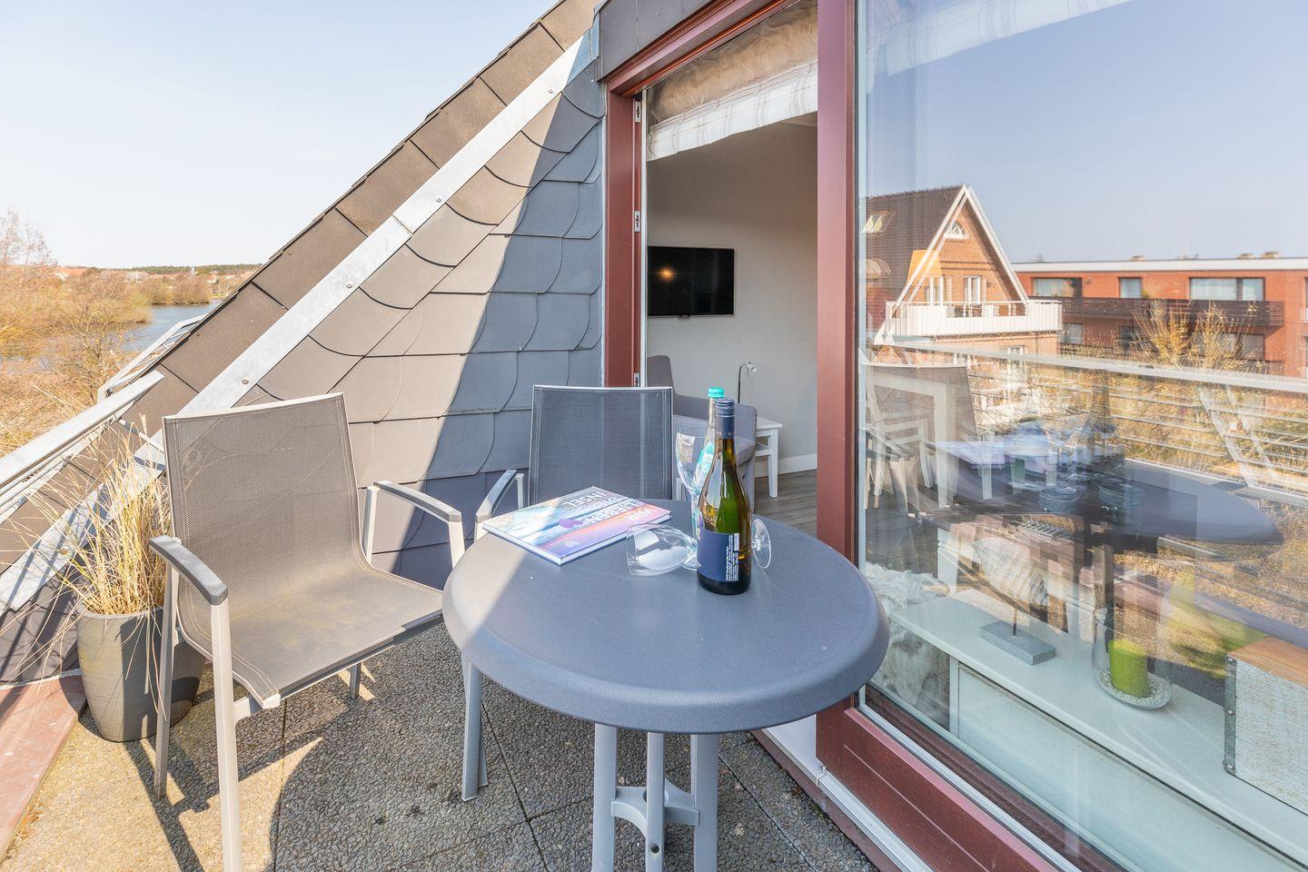 Der Wohnraum des Domizils hält für Sie eine gemütliche Couch, einen kleinen Essbereich und eine offen gestaltete Küchenzeile bereit. Sie finden hier eine Mikrowellen-Backofenkombi sowie einen Induktionsherd und sind somit für die Zubereitung Ihres Urlaubsdinners sehr gut gewappnet. Vom Wohnbereich aus betreten Sie ihren möblierten Balkon, auf dem Sie entspannt an der Nordseeluft die Seele baumeln lassen können. Auf gleicher Ebene befindet sich ein modernes Tageslichtbadezimmer mit Dusche und WC. Im Dachgeschoss der Wohnung finden Sie einen weiteren Raum mit Doppelbett (180x200) und Flatscreen-TV.
