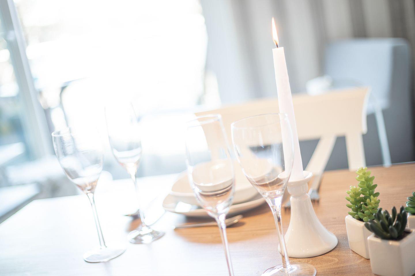 OG: Wohnraum mit Flatscreen-TV, CD-Player, Radio und W-LAN Anschluss, Essbereich, Küchenzeile mit Microwellen-Backofen-Kombi, Induktionsherd, Geschirrspülmaschine, Melitta-Kaffeevollautomat, Wasserkocher und Toaster, Balkon mit Balkonmöbeln, Tageslichtbad mit Dusche und WC