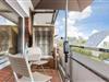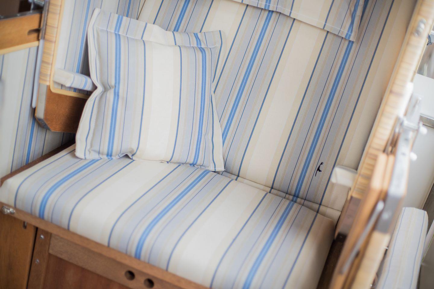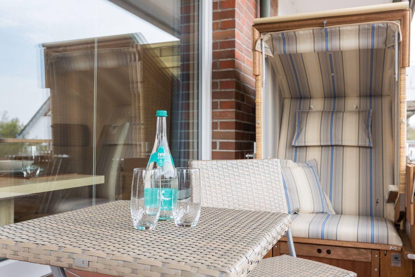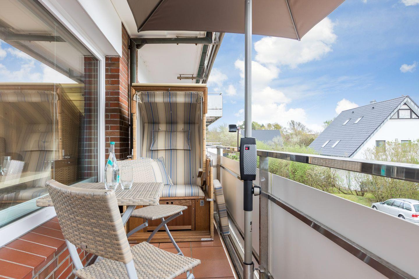 Für einen gemütlichen Tagesausklang lädt der Südbalkon mit einem kleinen Strandkorb, einem Tisch mit zwei Stühlen aus Holz sowie ein Sonnenschirm ein.