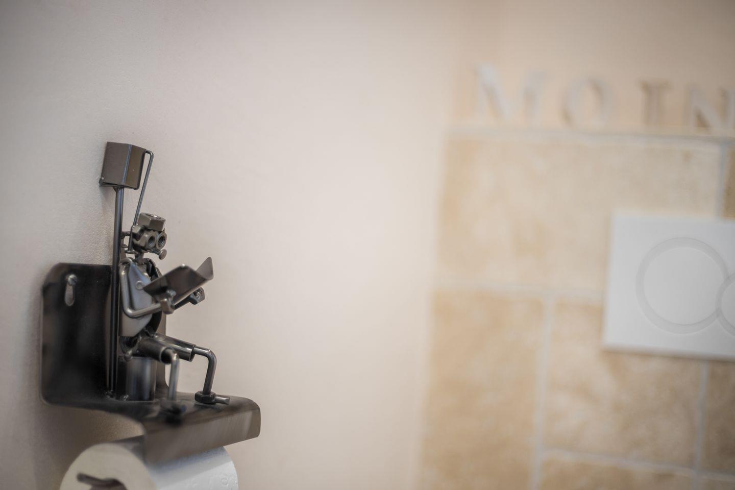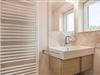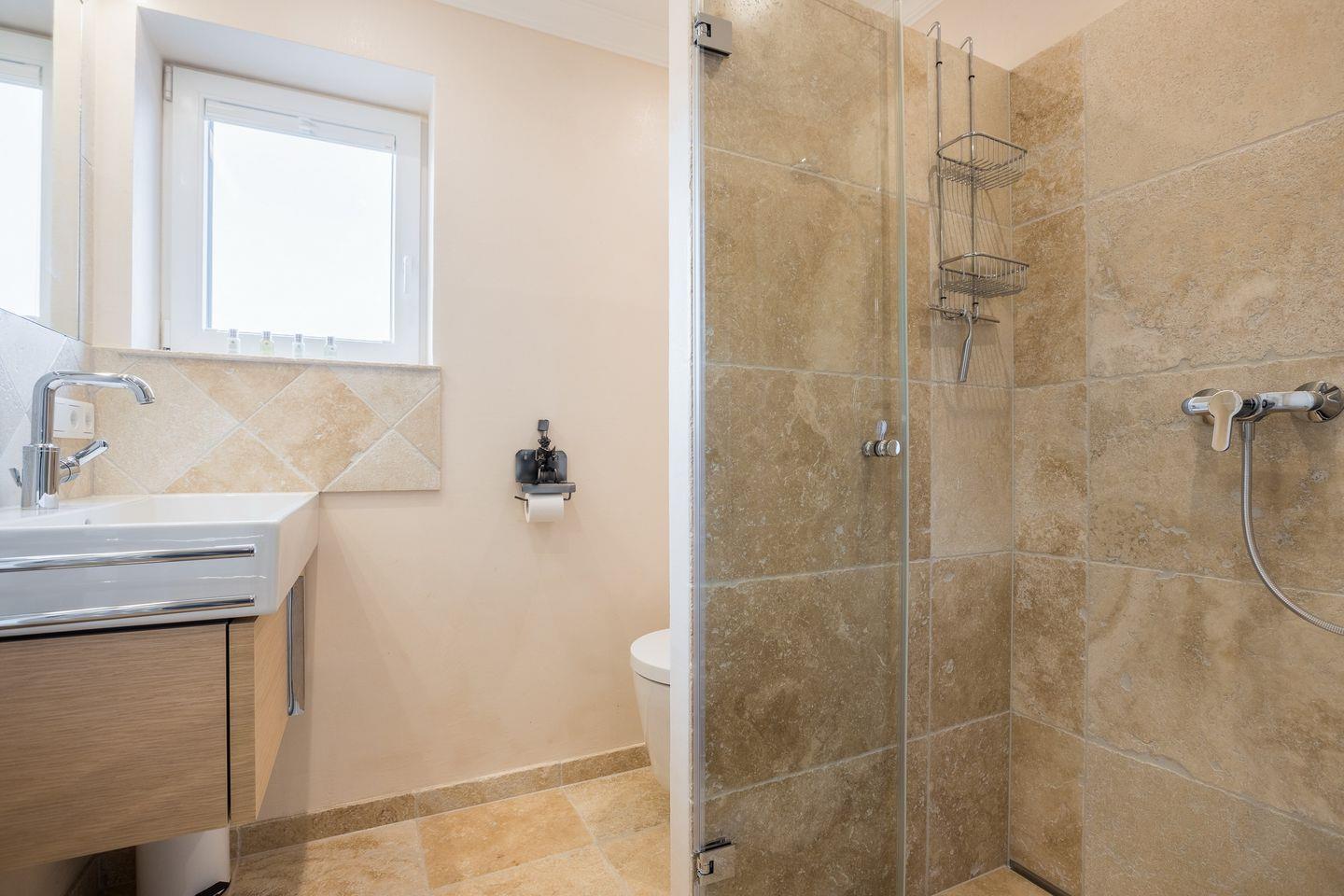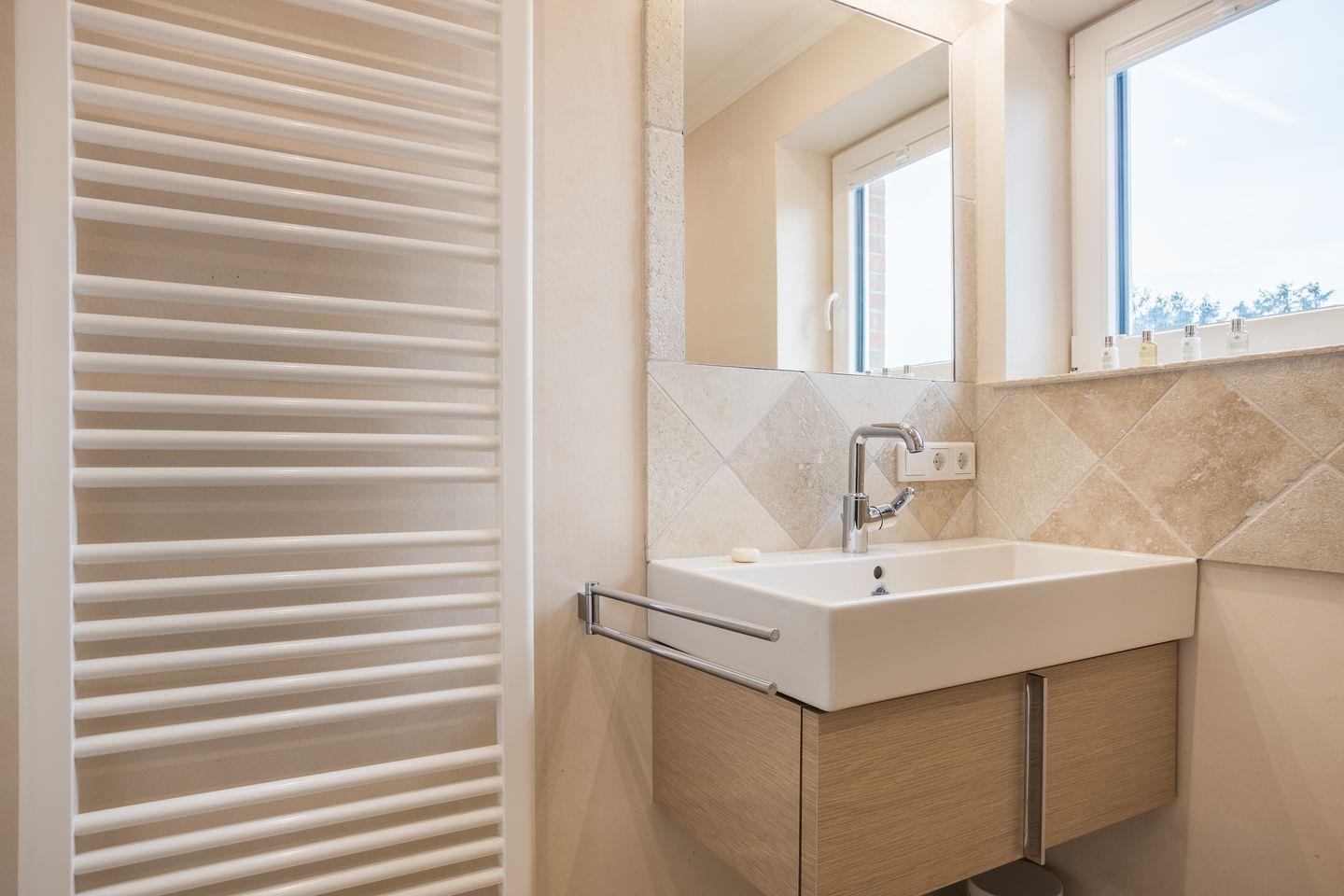 Im Bad befindet sich eine bodenebene Dusche, Waschtisch und WC sowie ein Handtuchheizkörper.