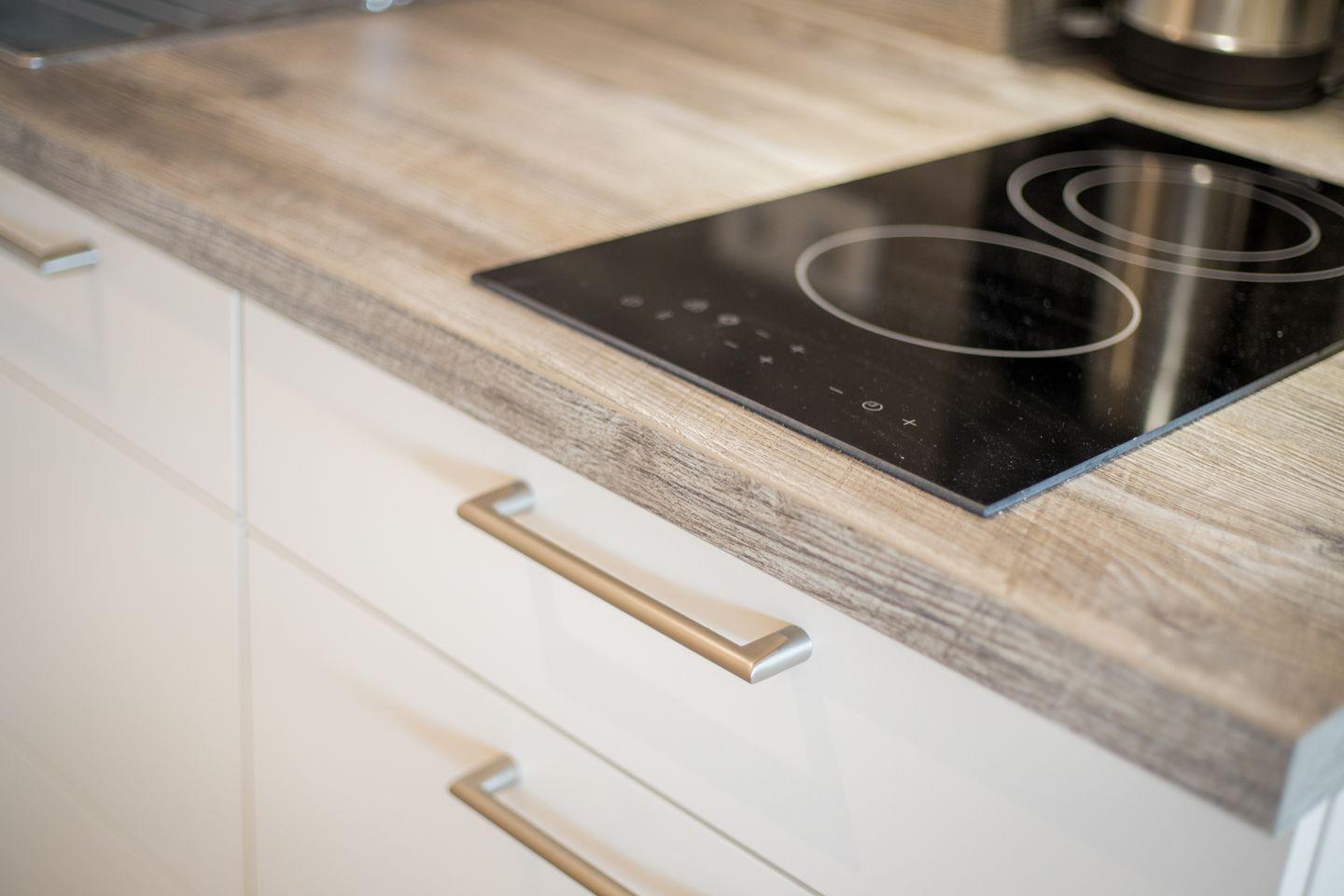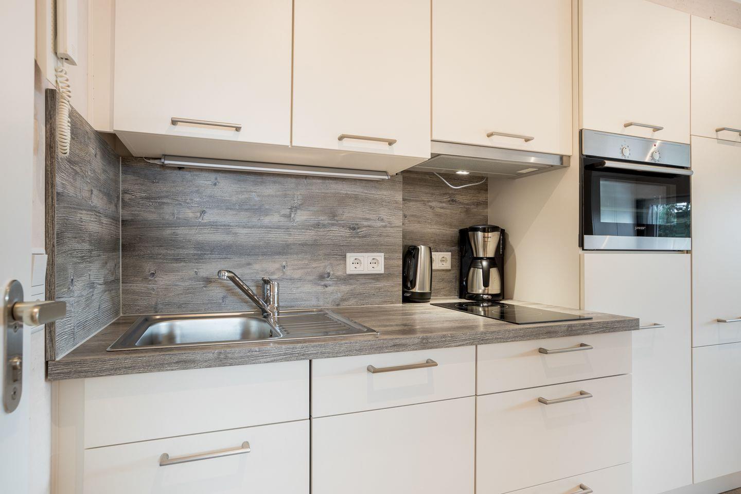 Das Appartement ist ausgestattet mit einer modernen Einbauküche mit Geschirrspüler, Kühlschrank mit Gefrierfach, Backofen und Ceranfeld.