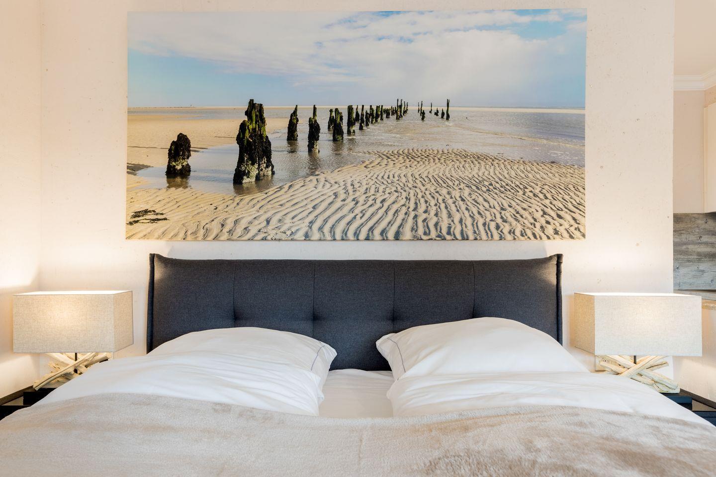 Im Wohnbereich lädt ein gemütliches Sofa sowie ein Boxspringbett zum Träumen ein.