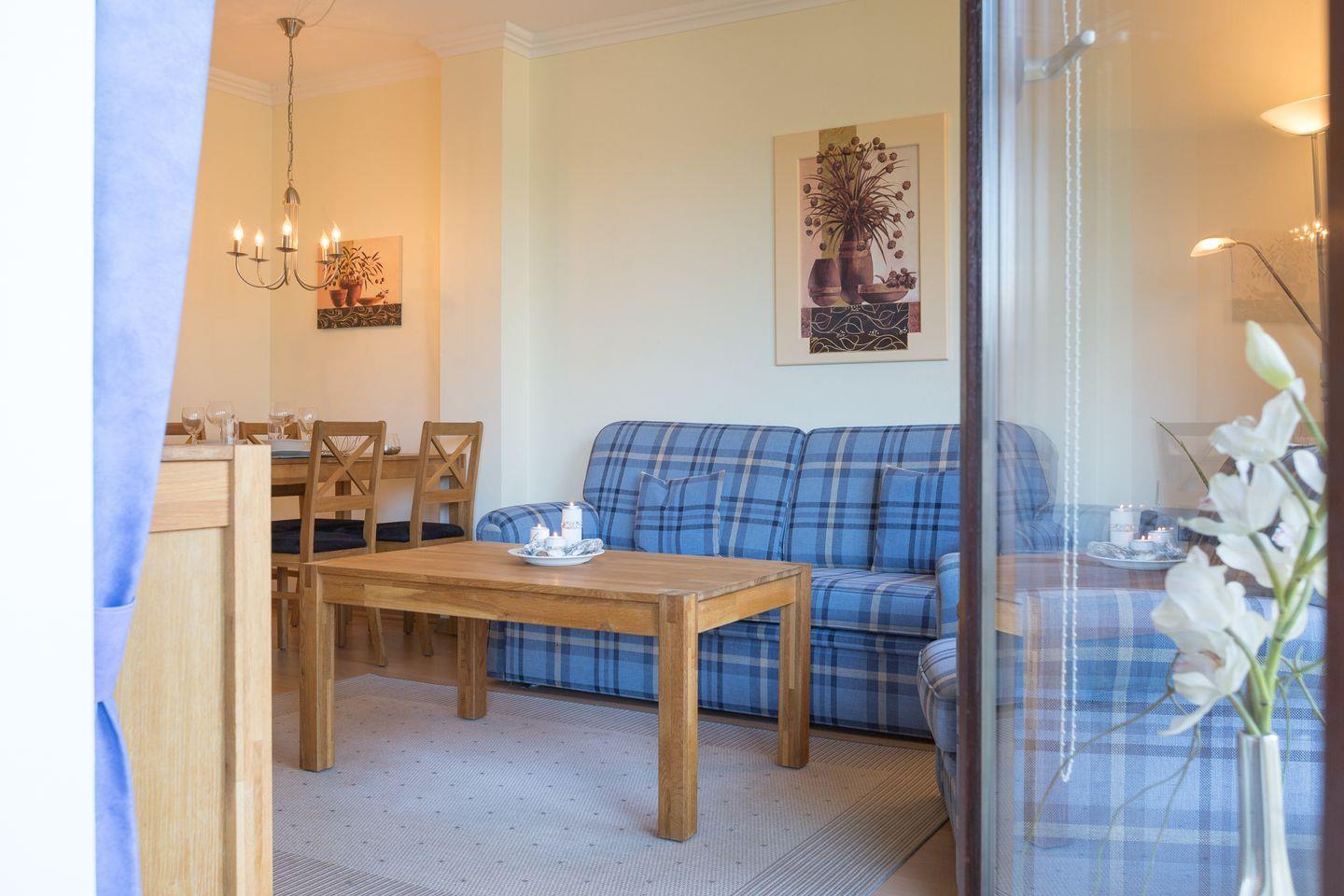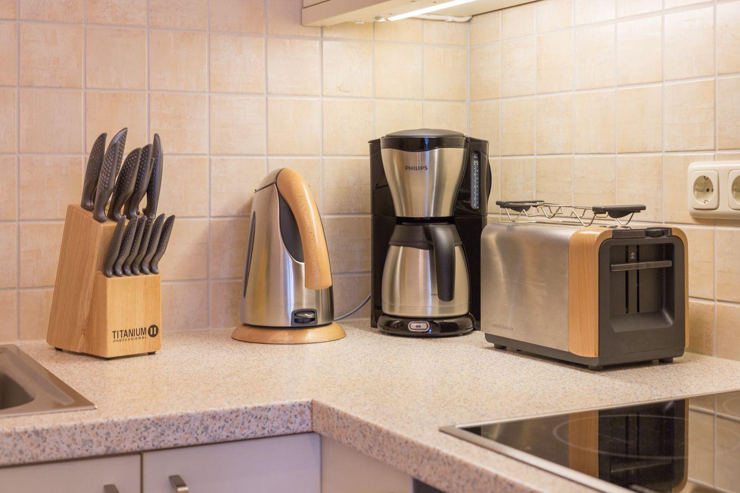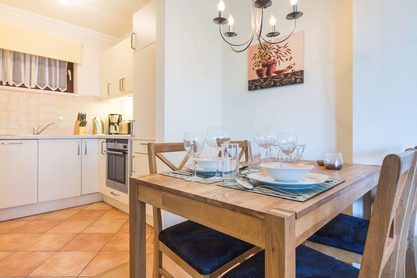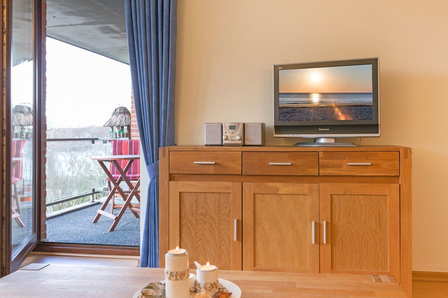 Wohnraum mit Stereoanlage, Flatscreen-TV, CD-Player und Radio sowie einem Telefon inklusive Flatrate ins Festnetzt der dt. Telekom und einem WLAN-Anschluss. Küchenzeile mit Backofen, Wasserkocher und Geschirrspüler. Badezimmer mit Dusche und WC sowie einem Handtuchtrockner. Balkon mit Gartenmöbeln (ca. April - Oktober).