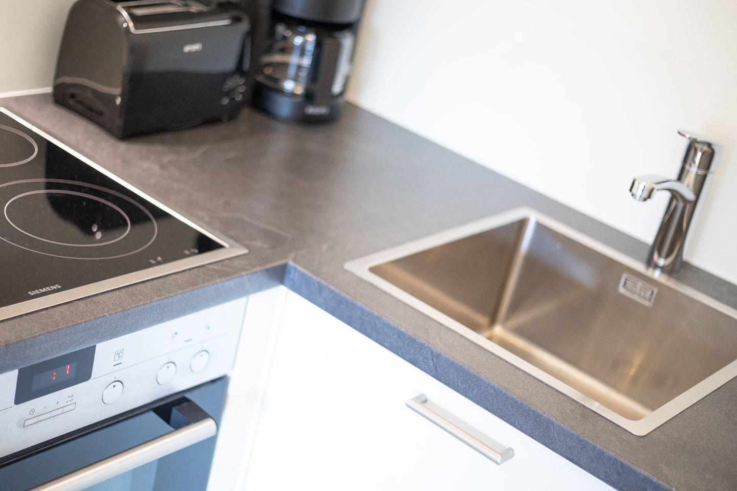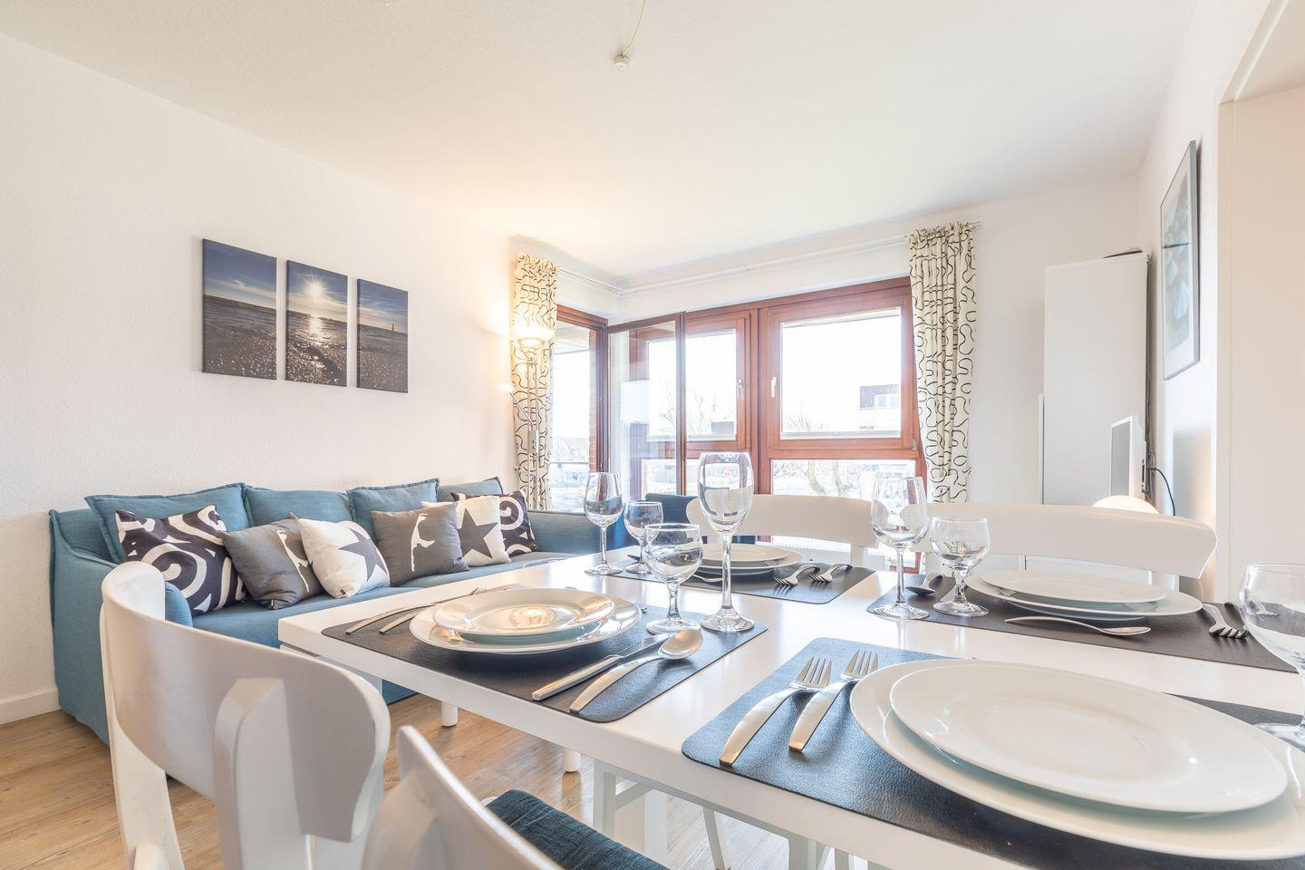 Wohnraum mit Flatscreen-TV, Telefon inklusive Flatrate ins Festnetzt der Deutschen Telekom und einem WLAN-Anschluss. Fußboden mit hochwertigen Design Project Floor. Küchenzeile mit Cerankochfeld, Backofen, Wasserkocher, Kaffeemaschine, Nespressomaschine und Geschirrspüler. Badezimmer mit Dusche/WC, sowie 1x Süd-Balkon mit Gartenmöbeln (ca. April - Oktober). Sep. Elternschlafzimmer mit Doppelbett (1,80x200cm) und ein weiterer Raum mit Doppelbett (180x200cm) und einem Flatscreen-TV, separates Badezimmer mit Dusche /WC. 1 zusätzlicher Süd-Balkon mit Gartenmöbeln (ca. April - Oktober), lädt auch hier zum Entspannen ein.