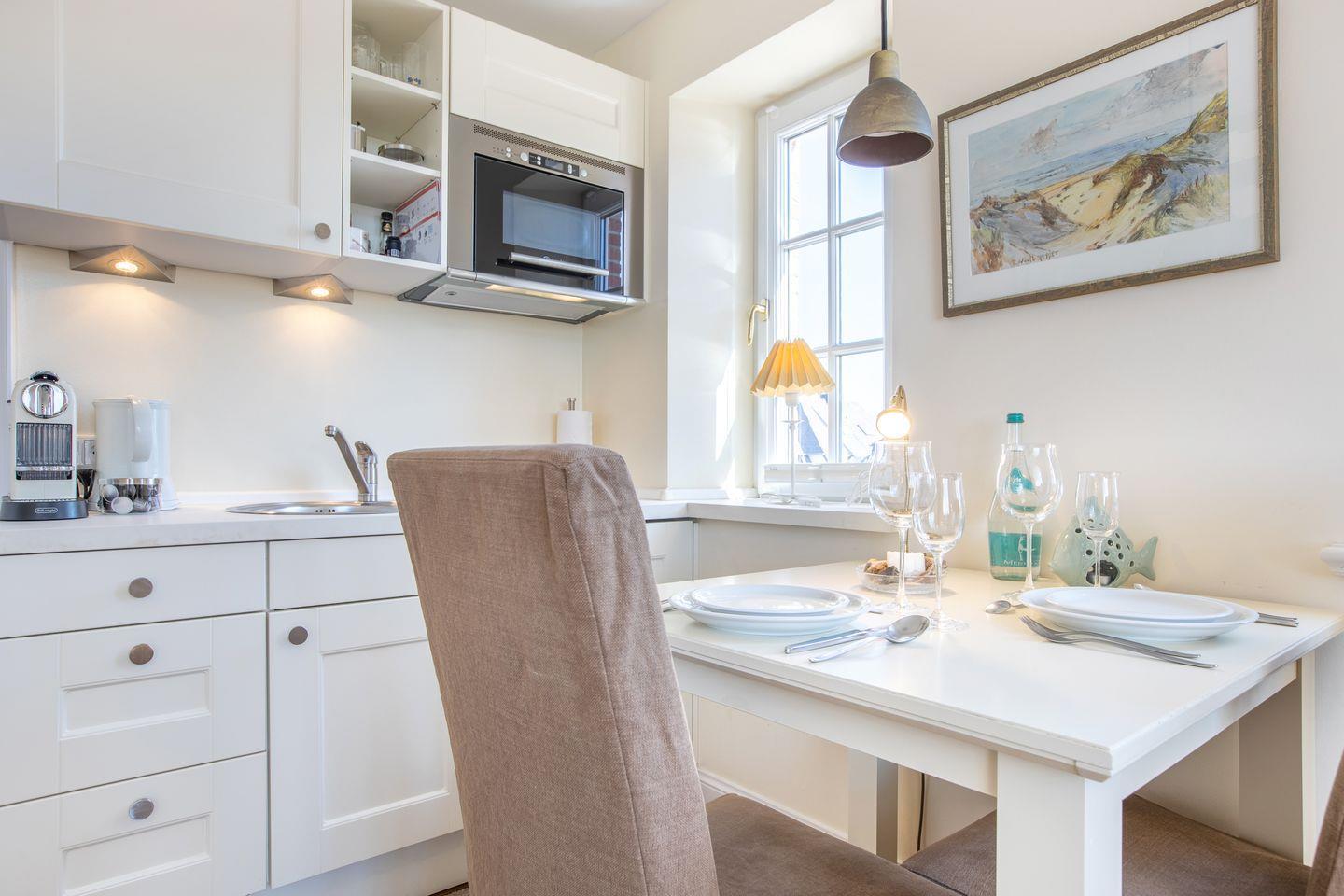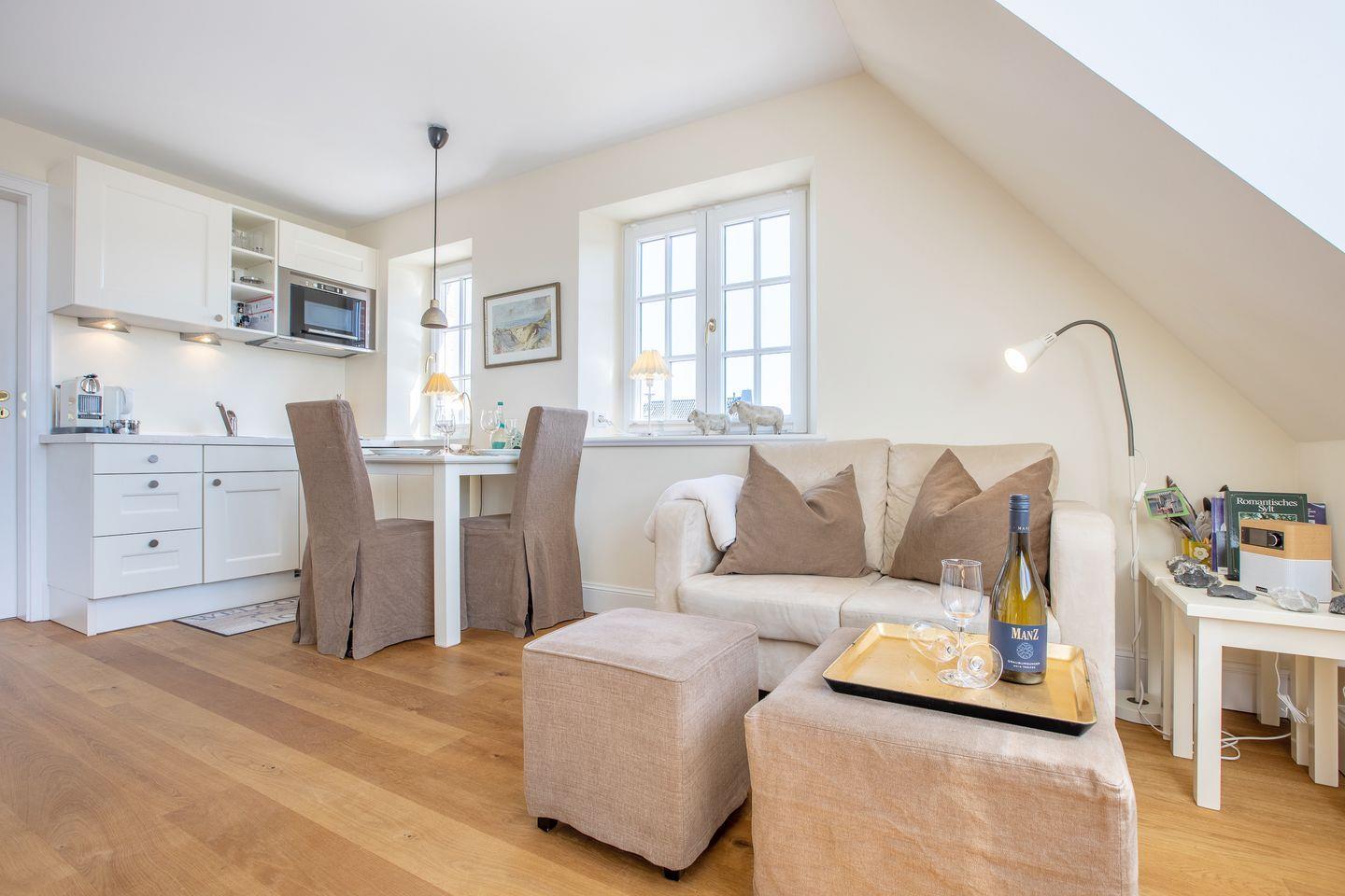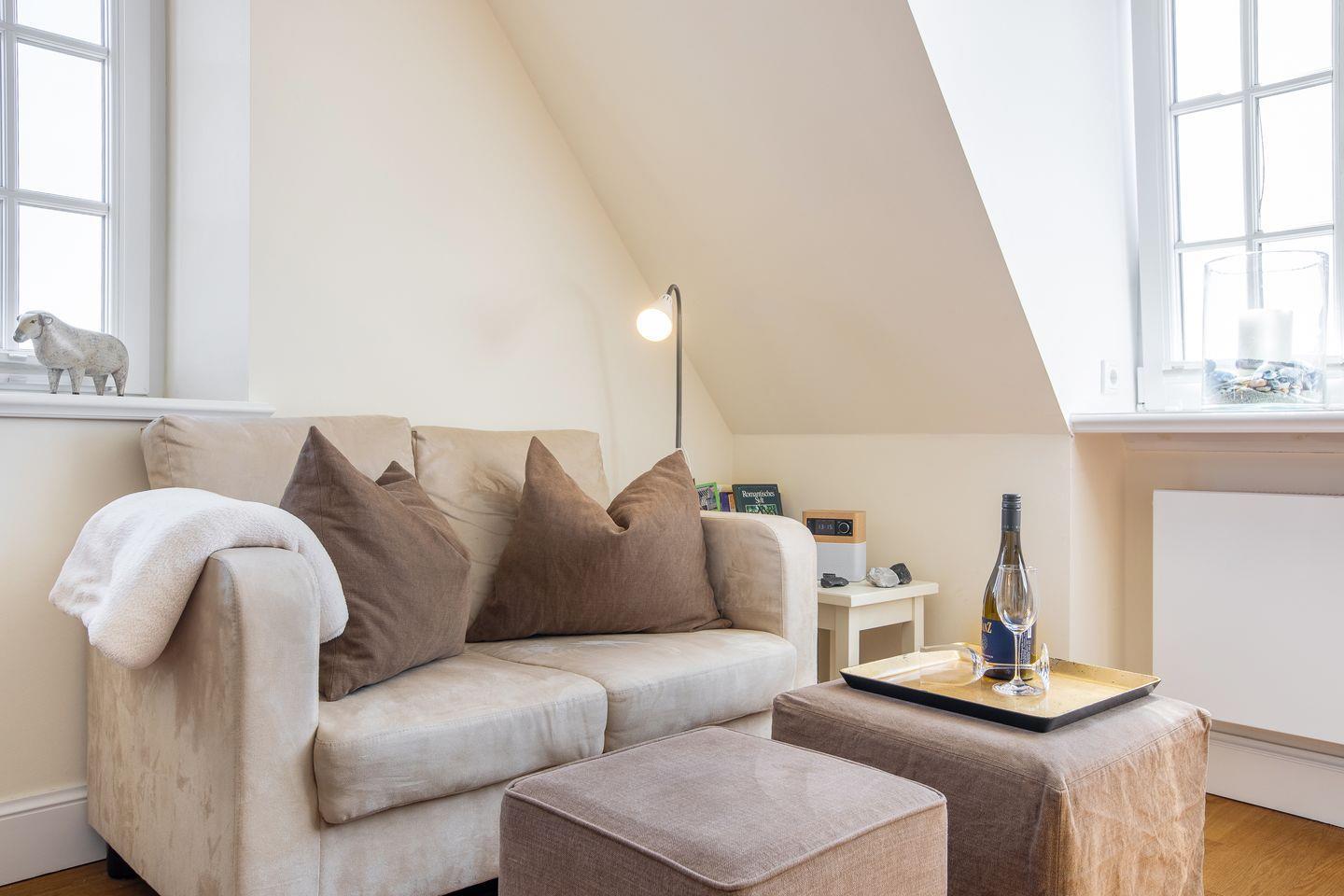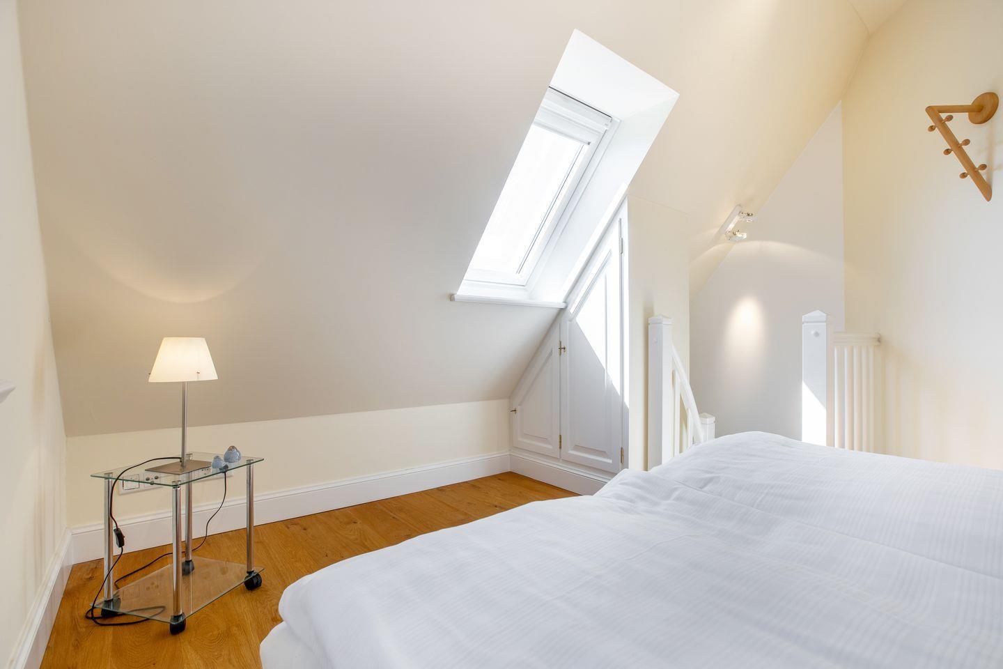 Ein lichtdurchfluteter Wohnraum erwartet Sie im Obergeschoss dieses Urlaubsdomizils mit kleiner, gemütlicher Couch, einem Essbereich für zwei Personen und einer modernen Küchenzeile mit toller Ausstattung. Auf gleicher Ebene befindet sich ein großzügiges, helles Tageslichtbadezimmer, das mit modernem Design überzeugt. Im Dachgeschoss des Appartements befindet sich ein weiterer Raum mit Doppelbett.