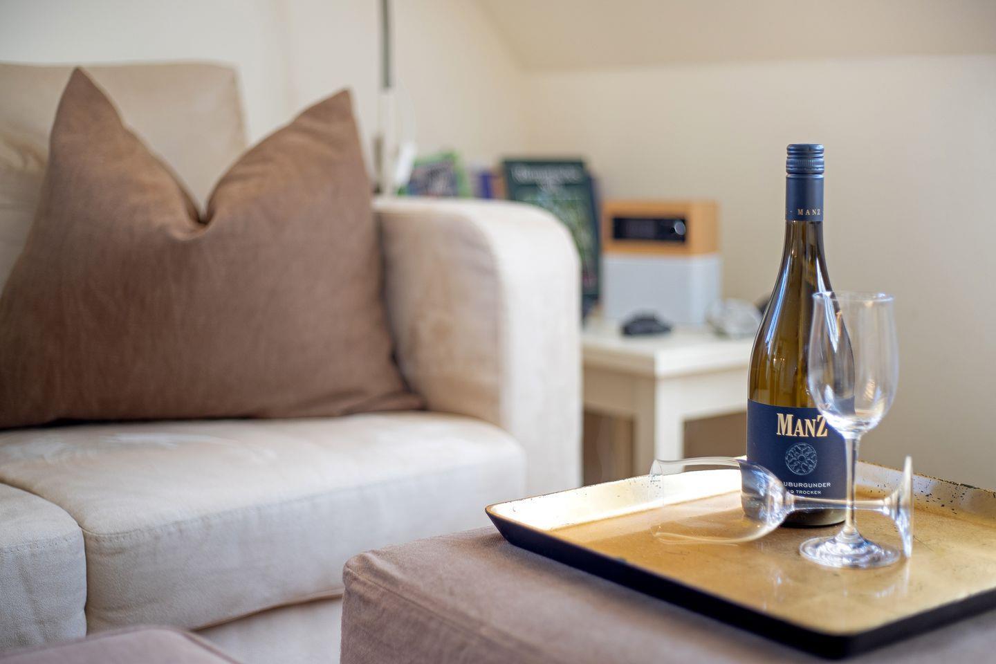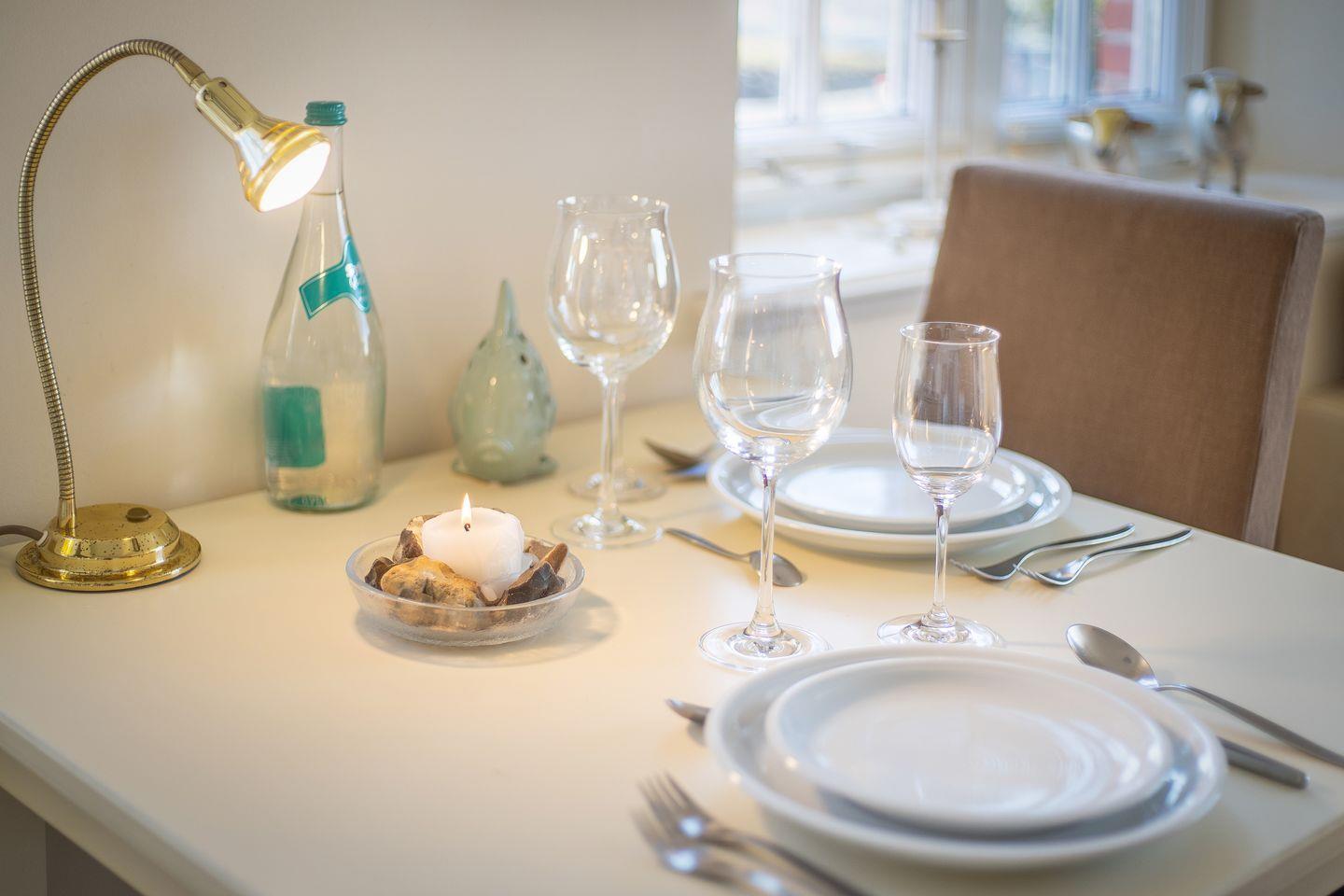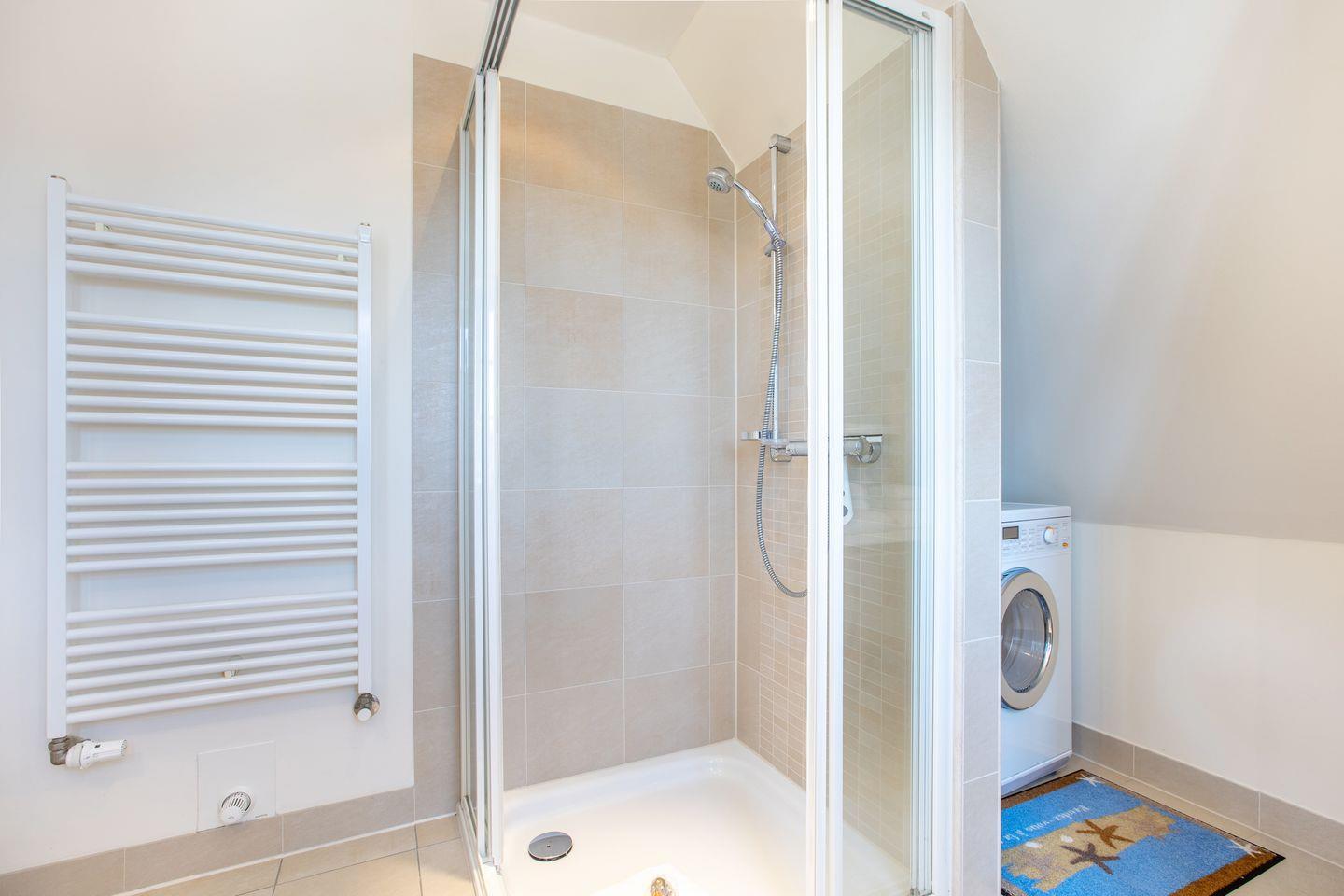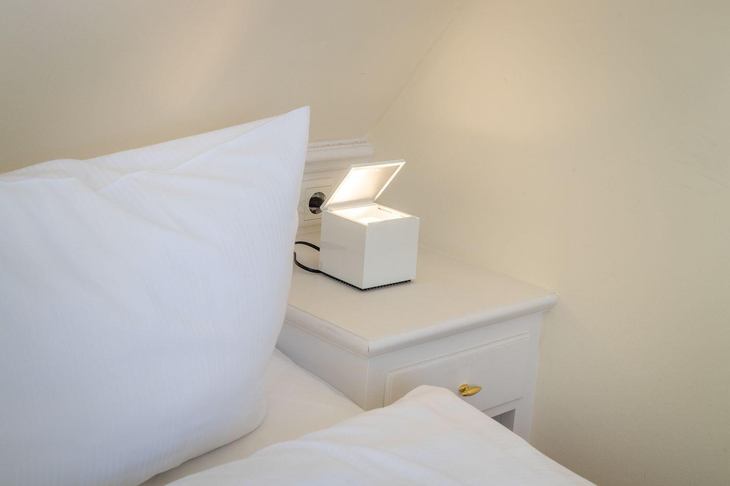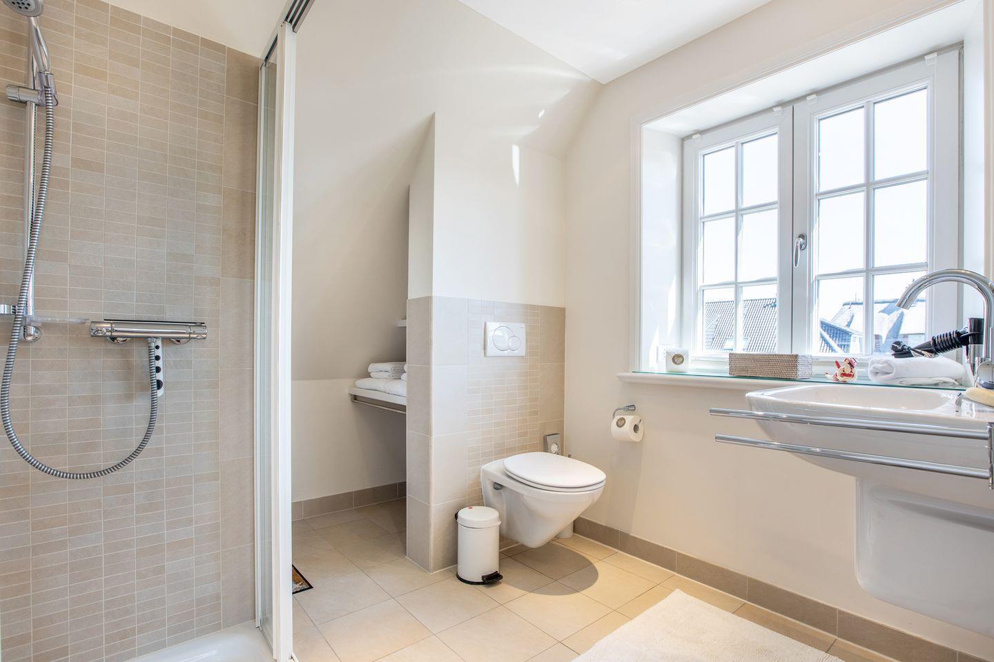 Ein lichtdurchfluteter Wohnraum erwartet Sie im Obergeschoss dieses Urlaubsdomizils mit kleiner, gemütlicher Couch, einem Essbereich für zwei Personen und einer modernen Küchenzeile mit toller Ausstattung. Auf gleicher Ebene befindet sich ein großzügiges, helles Tageslichtbadezimmer, das mit modernem Design überzeugt. Im Dachgeschoss des Appartements befindet sich ein weiterer Raum mit Doppelbett.