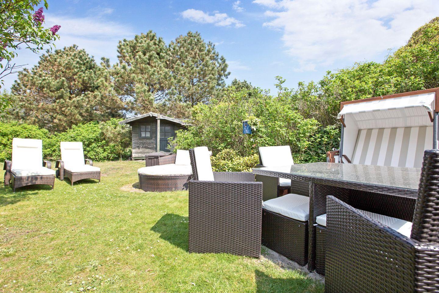 Vor Ihrer Eingangstür steht Ihnen mit einem lauschigen, sonnigen Gärtchen ein wahres Kleinod zur Verfügung. Im Sommer blühen Flieder und die Hortensien um die Wette. Es stehen Ihnen eine Sitzgruppe mit Liegen und Strandkorb zum Relaxen und Genießen zur Verfügung, alles selbstverständlich mit Polsterauflagen. Ein Strandkorb darf natürlich zusätzlich auch nicht fehlen (sämtliches Gartenmobiliar ca. von April-Oktober).
