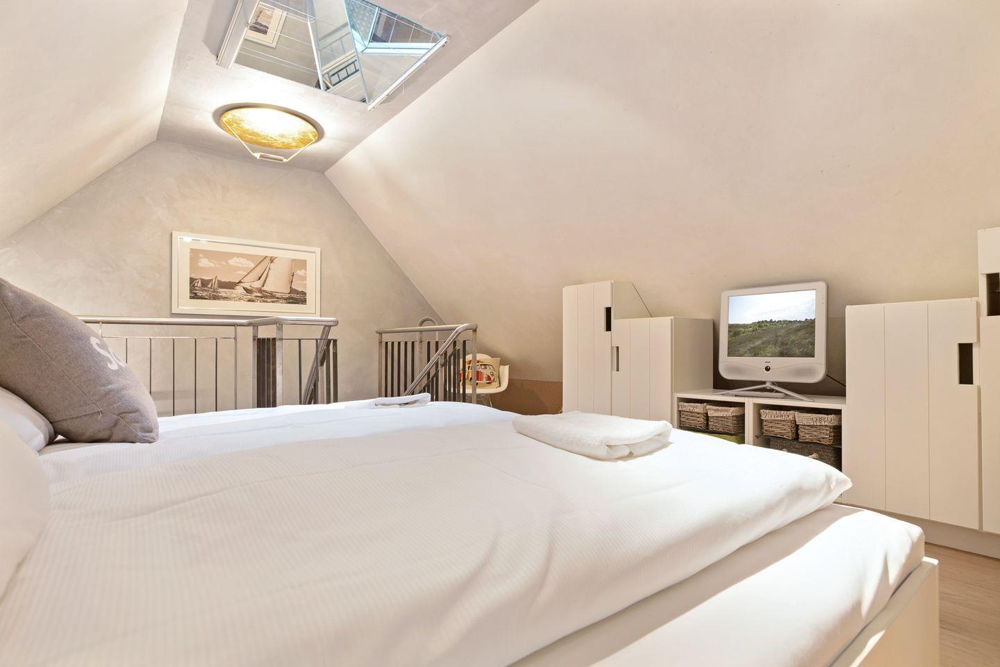OG: offener Bereich mit Doppelbett (180x200cm) und Löwe-Flatscreen TV