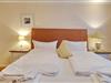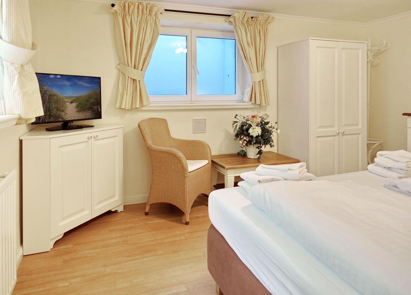 UG: Ein Raum mit Doppelbett (180 x 200 cm) und TV. Badezimmer mit Dusche und WC.