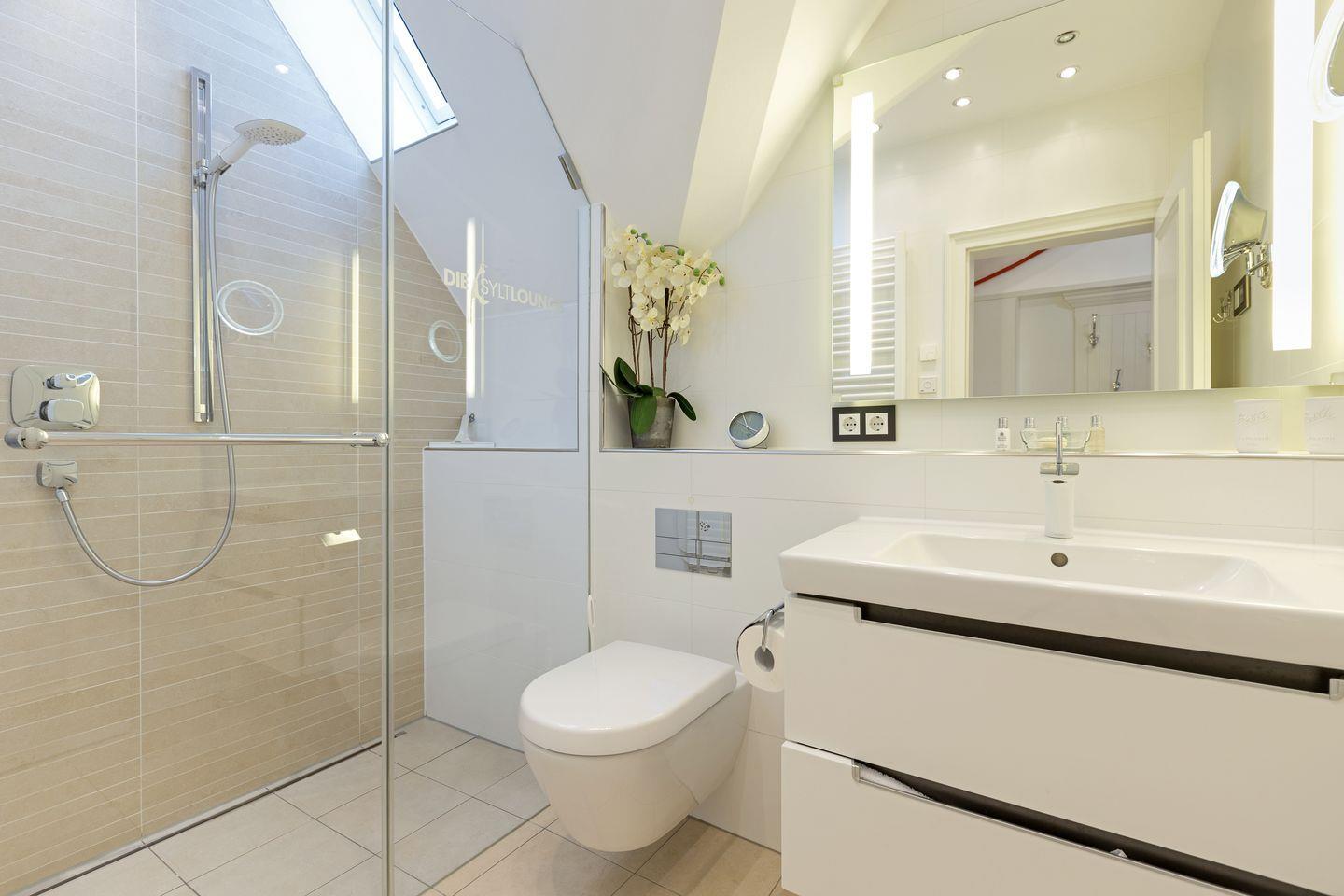 Der Wellnessbereich im Warftgeschoss bietet Ihnen eine Finnische Sauna, zwei Relaxliegen sowie eine große Dusche und Toilette. Hier können Sie bei angenehmer Wärme und einem Aufguss die Seele baumeln lassen und Ihren Urlaub auf Sylt genießen.