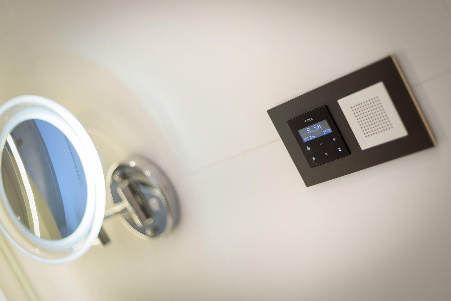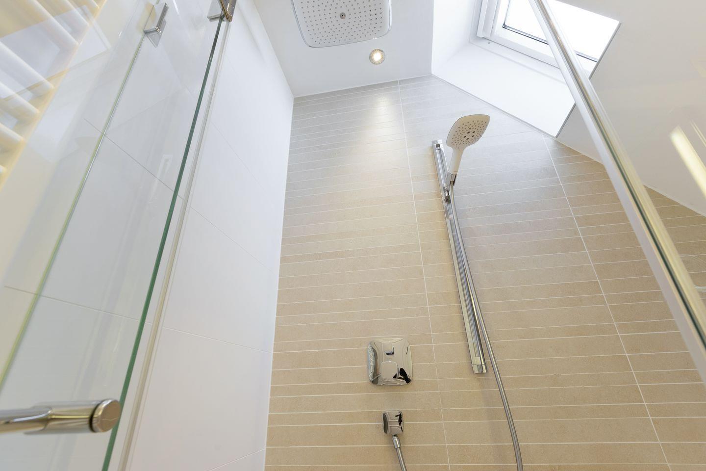 Über den Flur mit großer Garderobe gelangen Sie in das Tageslicht-Wellnessbad mit seiner ebenerdigen XXL-Raindance-Dusche. Für ein komfortables und entspannendes Duscherlebnis sorgt hier ein klappbarer Sitz. Mit hellem italienischem Feinsteinzeug gefliest werden Sie mit großzügigen Ablageflächen, viel Licht, sowie einem Profi-Föhn und einem beleuchteten Kosmetikspiegel verwöhnt. Für den nötigen Schwung am Morgen sorgt das Designer-Radio.