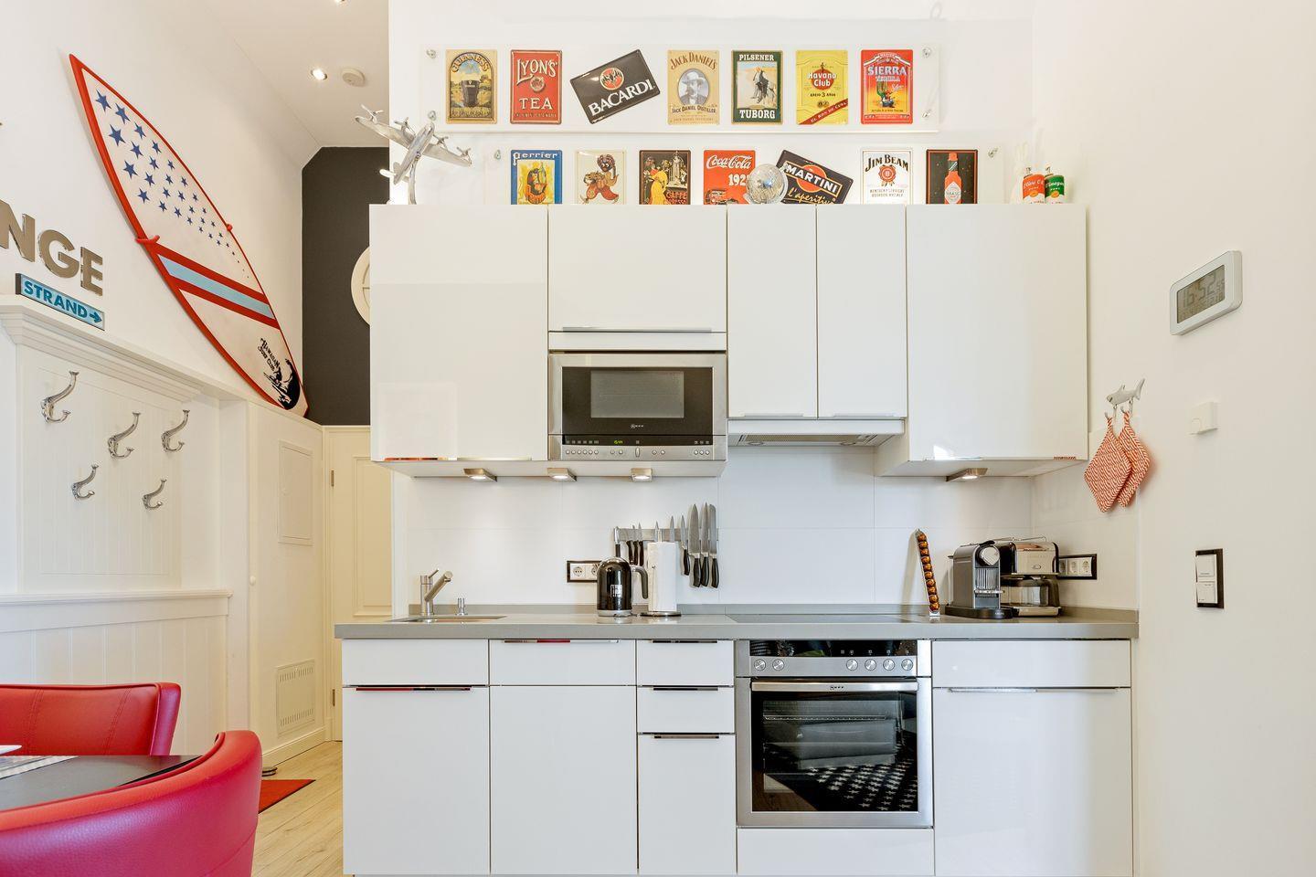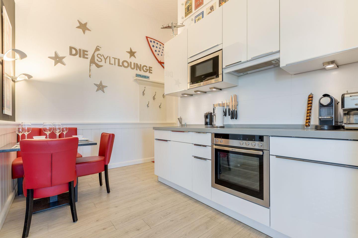 Ausgestattet mit Ceranfeld, Backofen, Dunstesse, Mikrowelle und Geschirrspüler bleiben auch bei Freunden der Koch-und Backkunst keine Wünsche offen. Wasserkocher in Kesseloptik, sowie Kaffee- und Nespressomaschine mit Milchaufschäumer runden das Angebot ab. Der in Sylter-Morgensonne getauchte Essbereich wird schnell zu Ihrem Lieblingsplatz in der Lounge.