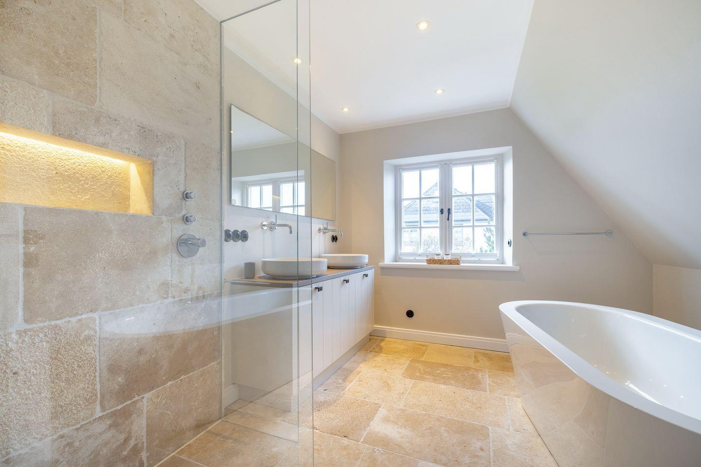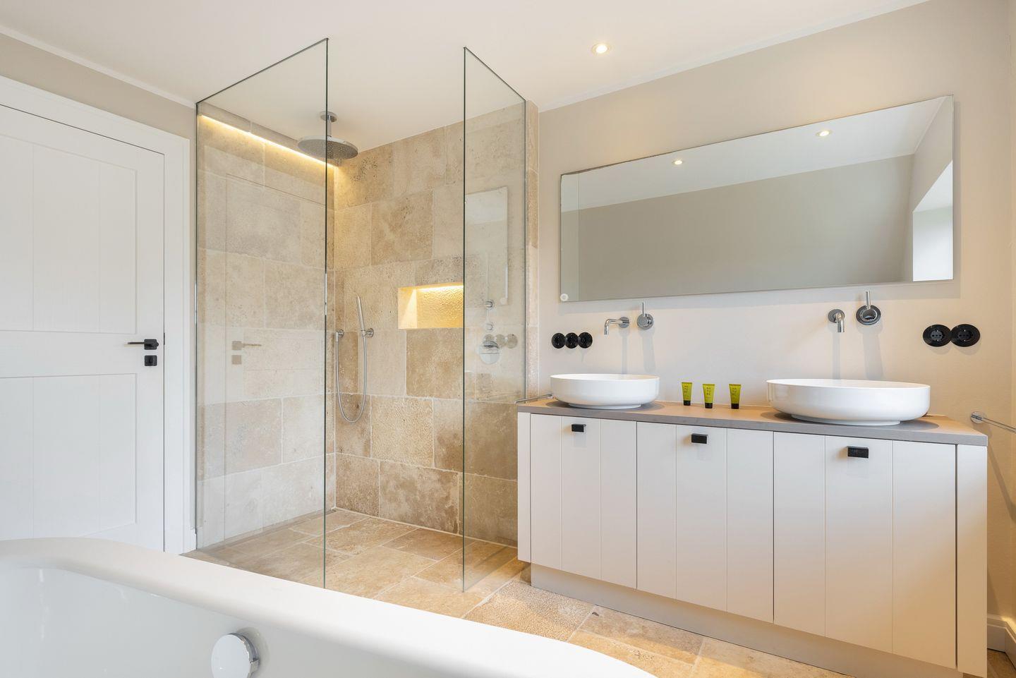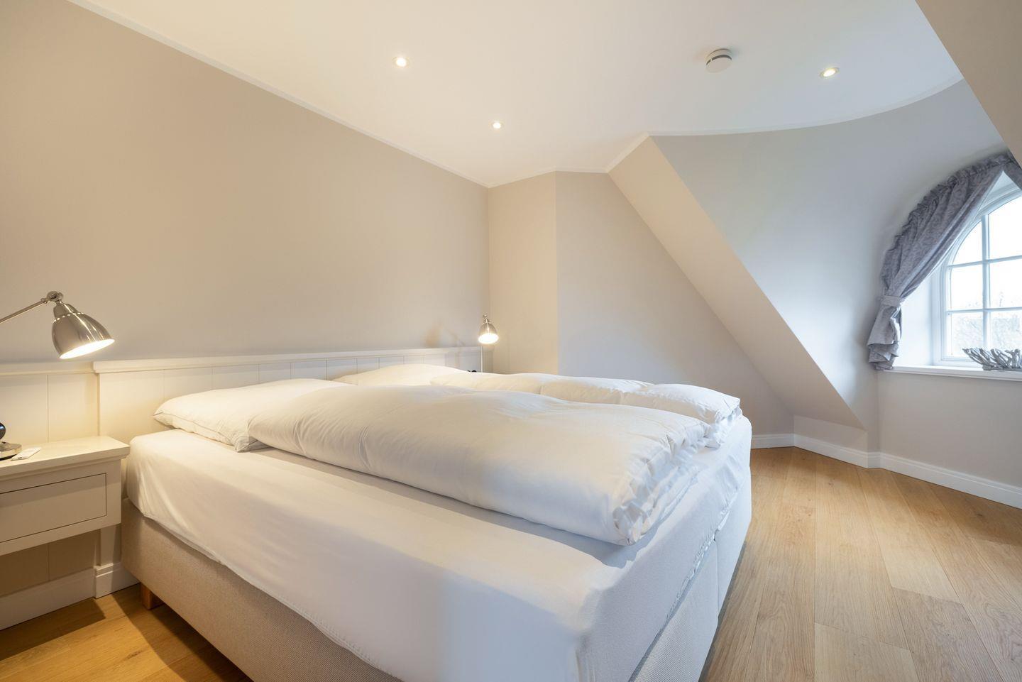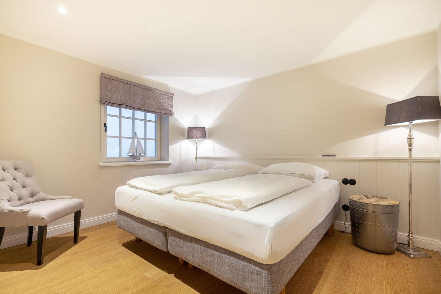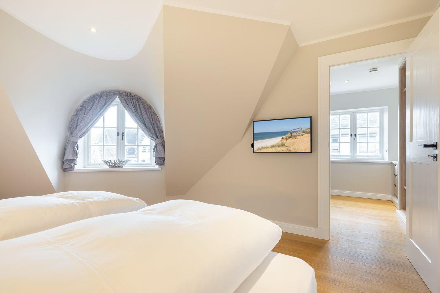 OG: Schlafzimmer mit Boxspringbett (180x200cm -Matratze getrennt), begehbarem Kleiderschrank, Flatscreen-TV, Bad mit Regendusche und freistehender Badewanne.