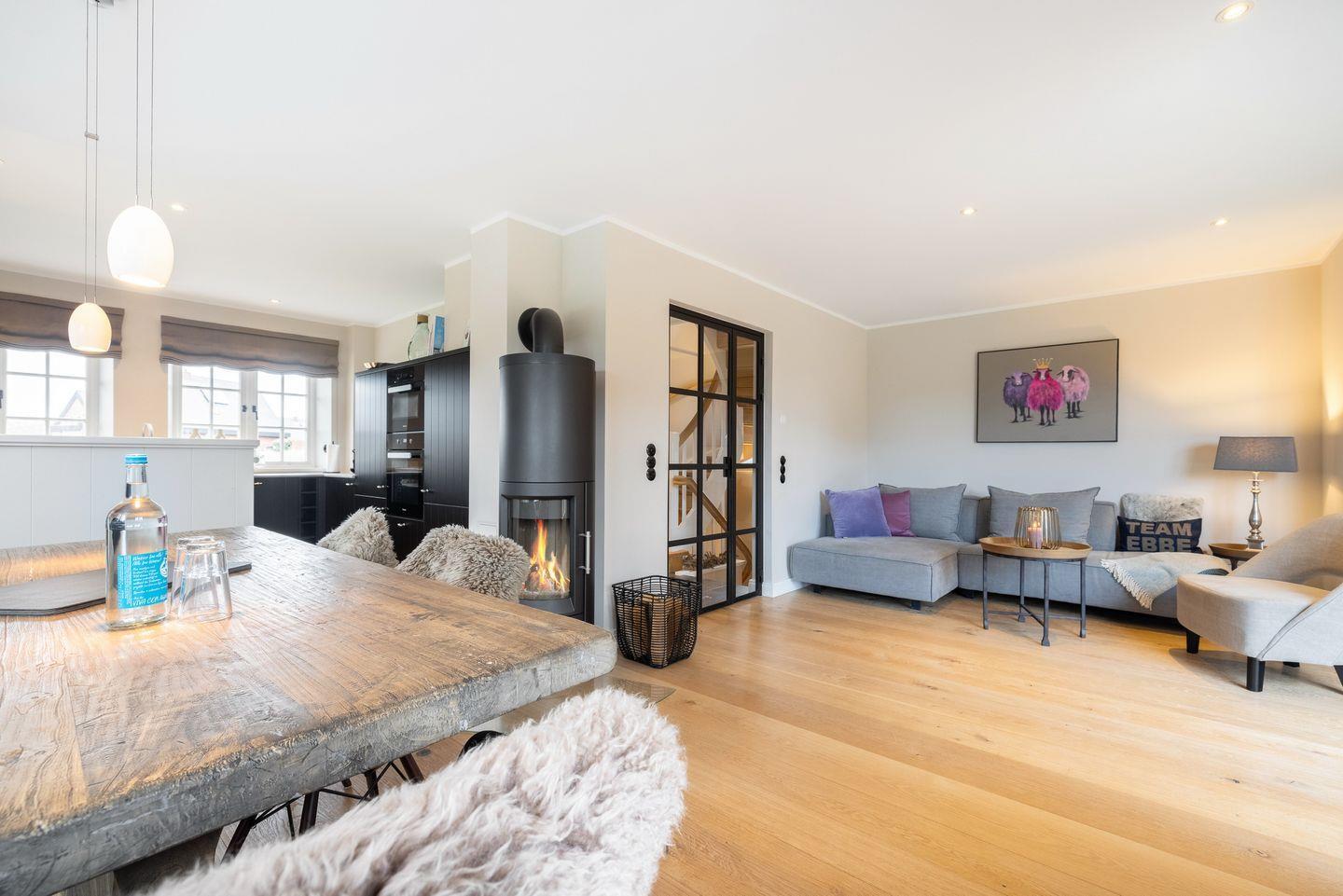 EG: Wohn- und Essbereich mit großzügigem Esstisch, Kaminofen, SmartTV, Küche mit Kaffeemaschine, Induktionsherd, Mikrowelle, Spülmaschine, Backofen, Nespresso, Wasserkocher und Toaster. Gäste WC. 2 Terrassen mit Süd und Westausrichtung mit Strandkorb und Gartenmöbeln.