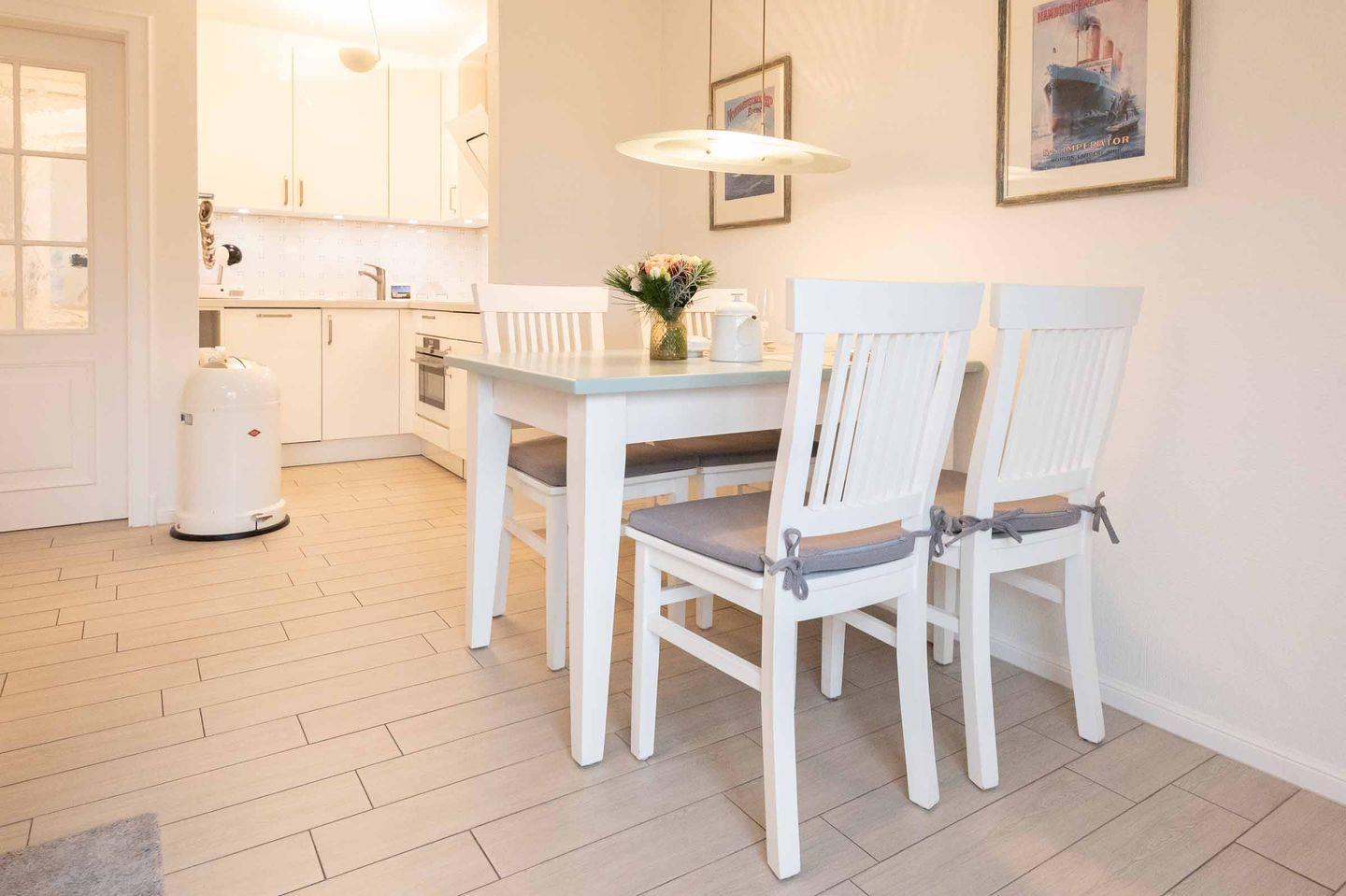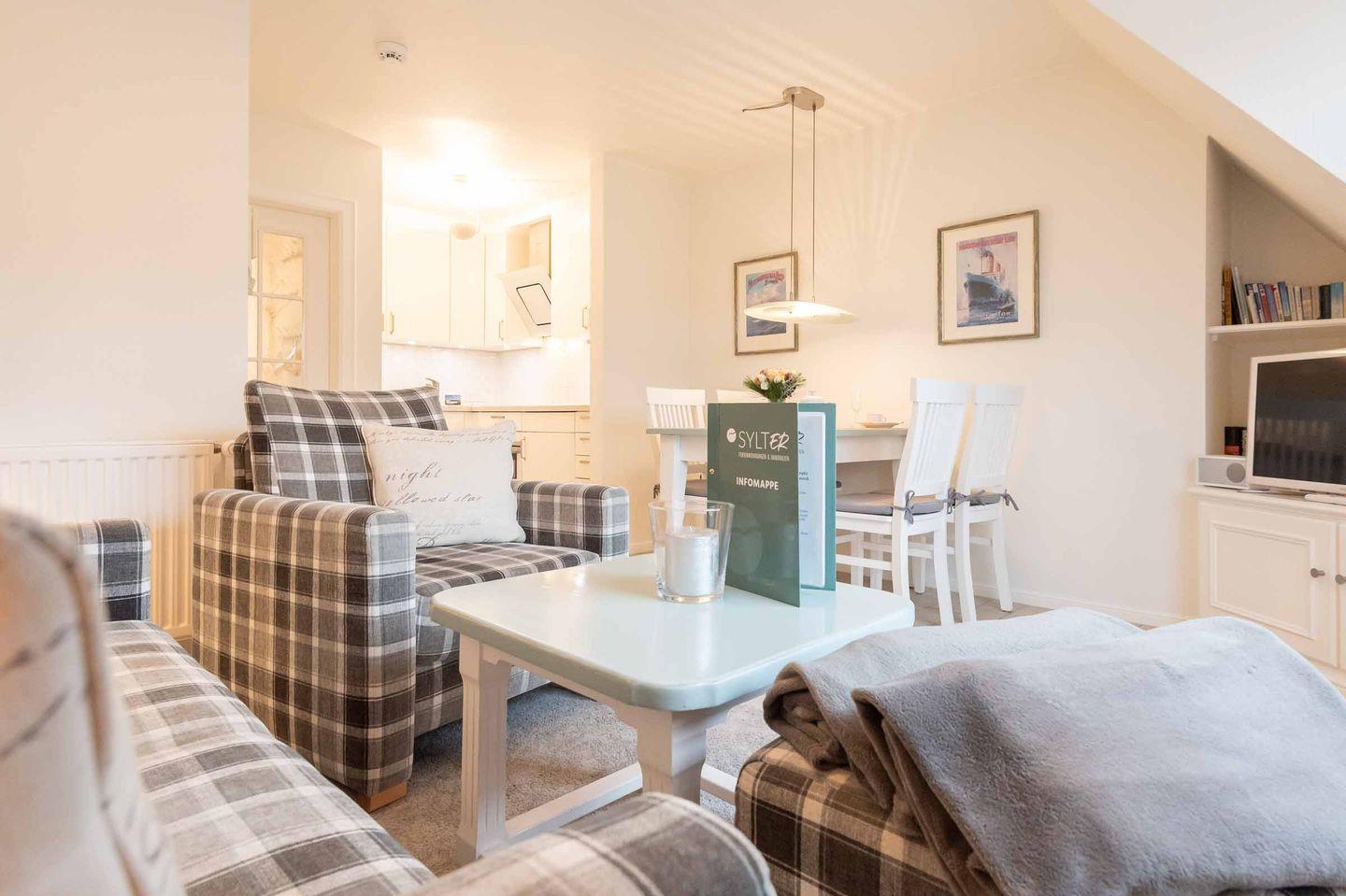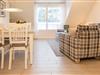 Die moderne und gut ausgestattete Küche grenzt direkt an den einladenden Essbereich, der Platz für vier Personen bietet und die gemütliche Sofaecke mit Sessel, Leselampe, TV und Stereo-Anlage.